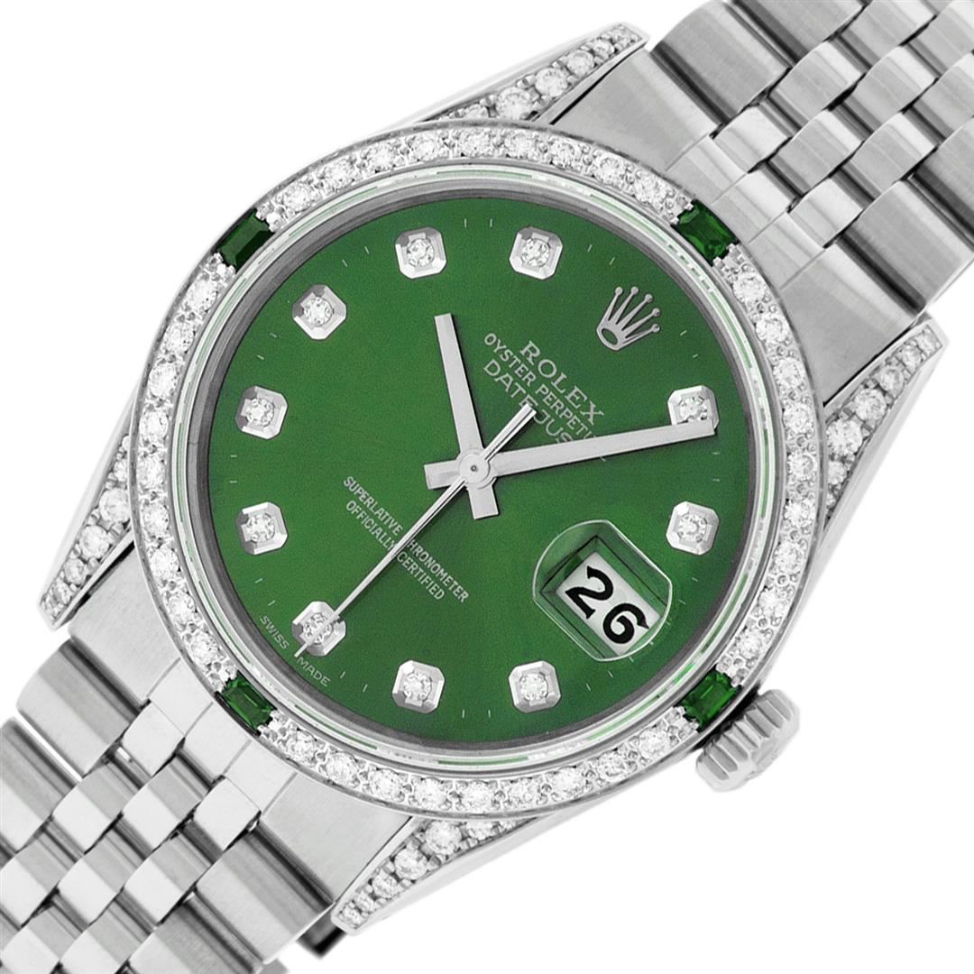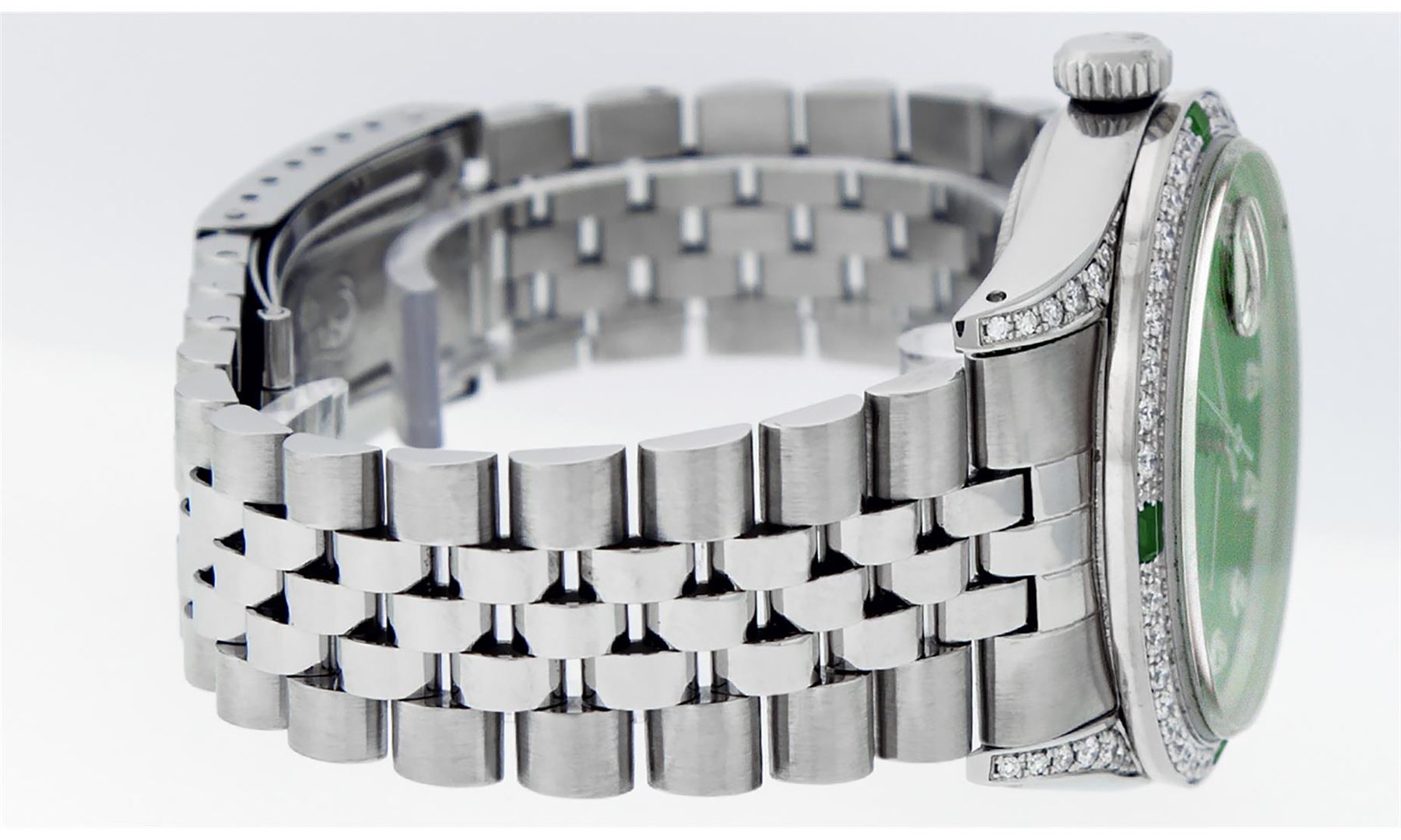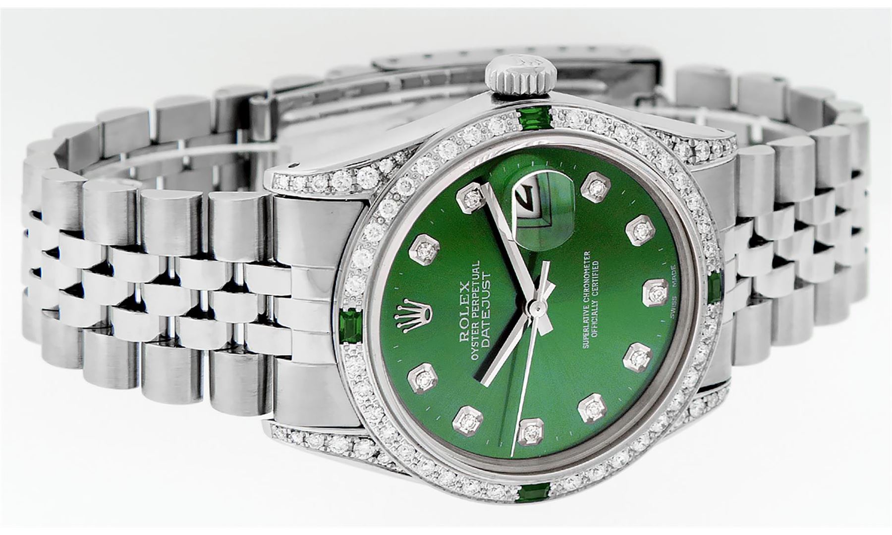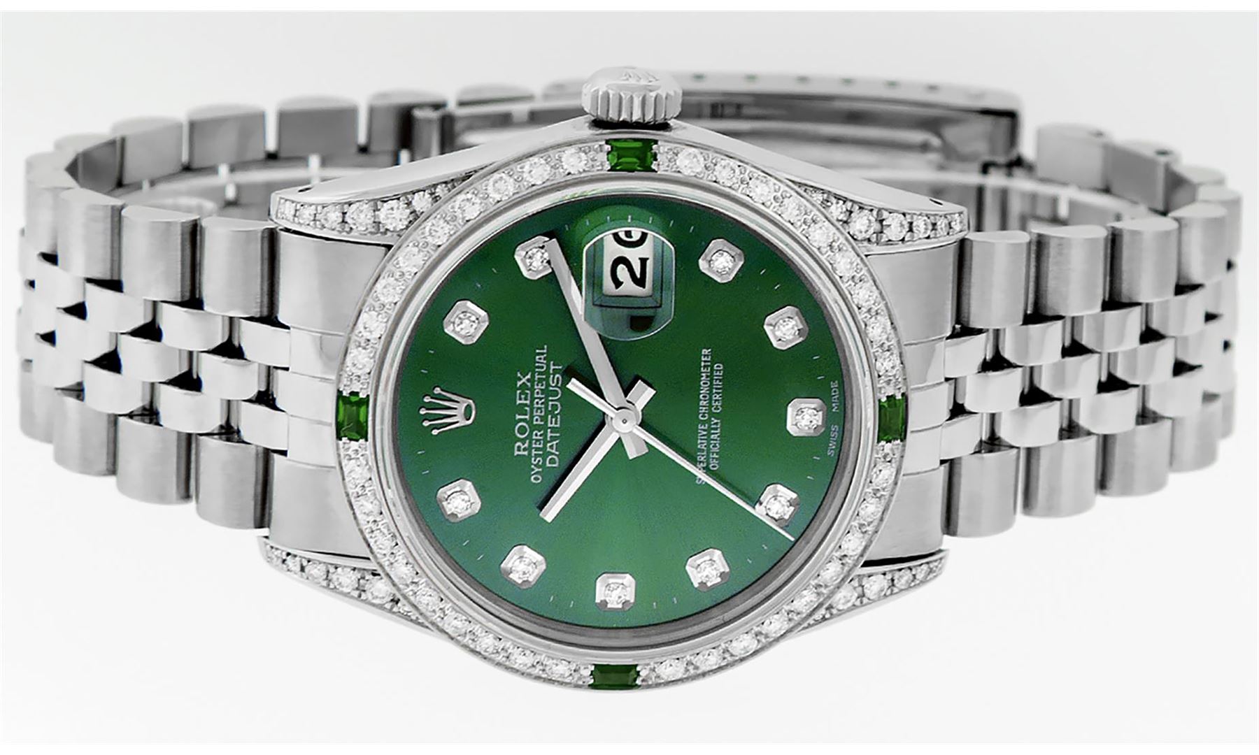 One Mens Pre Owned Rolex Datejust Polished Bright with Satin Finish, Serviced & Electronically Tested, Rolex Stainless Steel Case: 36mm, Custom Diamond Lugs: 28 Diamonds In Lugs, Color: G to H, Clarity: SI-VS. Rolex Stainless Steel Crown, Custom Bezel: New 18K White Gold Diamond + Emerald Beadset, Diamond Count: 36 Diamonds + 4 Emeralds, Clarity: SI-VS, Color: G to H. Custom Crystal: New Sapphire With Magnified Date. Custom Hands: New Luminescent Hands. Rolex Movement: Automatic Winding Movement. Custom Dial: Refinished To Green With Custom Added Diamonds, Stone Count: 10 Diamonds, Diamond Color: G To H In Color, Clarity: SI-VS. Date Window: 3 O'Clock Position Date Display, Quickset, Model: Datejust Condition: G-6 Extra Fine. Rolex Bracelet: Stainless Steel Jubilee Band. Bright Polish & Satin Finish. 7.0 Inch Length, Adjustable. Standard Clasp, With Rolex Logo. This Watch Has Been Serviced And Polished And Its Free Of All Dents And Scratches. This Watch Comes With A Rolex Box.