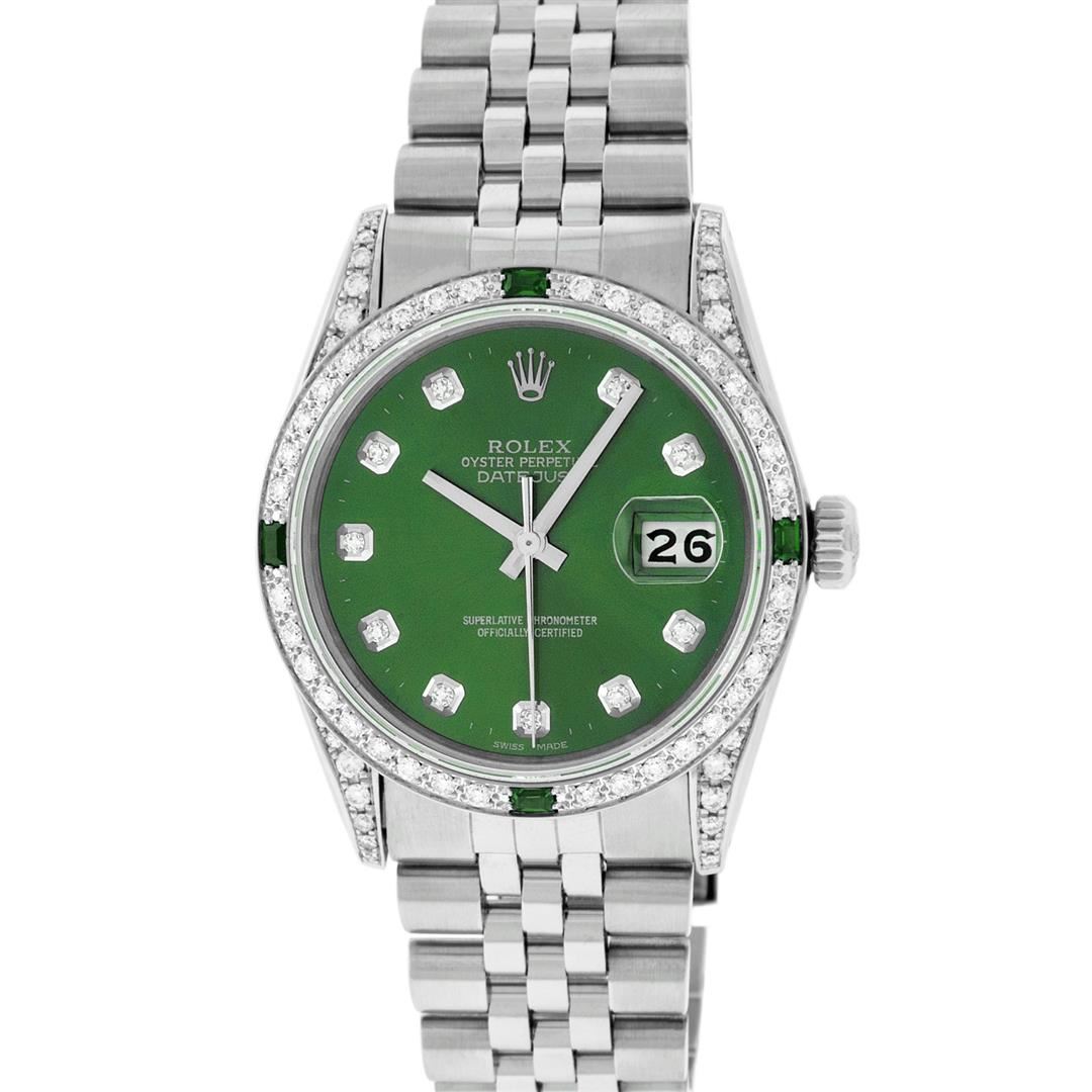 One Mens Pre Owned Rolex Datejust Polished Bright with Satin Finish, Serviced & Electronically Tested, Rolex Stainless Steel Case: 36mm, Custom Diamond Lugs: 28 Diamonds In Lugs, Color: G to H, Clarity: SI-VS. Rolex Stainless Steel Crown, Custom Bezel: New 18K White Gold Diamond + Emerald Beadset, Diamond Count: 36 Diamonds + 4 Emeralds, Clarity: SI-VS, Color: G to H. Custom Crystal: New Sapphire With Magnified Date. Custom Hands: New Luminescent Hands. Rolex Movement: Automatic Winding Movement. Custom Dial: Refinished To Green With Custom Added Diamonds, Stone Count: 10 Diamonds, Diamond Color: G To H In Color, Clarity: SI-VS. Date Window: 3 O'Clock Position Date Display, Quickset, Model: Datejust Condition: G-6 Extra Fine. Rolex Bracelet: Stainless Steel Jubilee Band. Bright Polish & Satin Finish. 7.0 Inch Length, Adjustable. Standard Clasp, With Rolex Logo. This Watch Has Been Serviced And Polished And Its Free Of All Dents And Scratches. This Watch Comes With A Rolex Box.