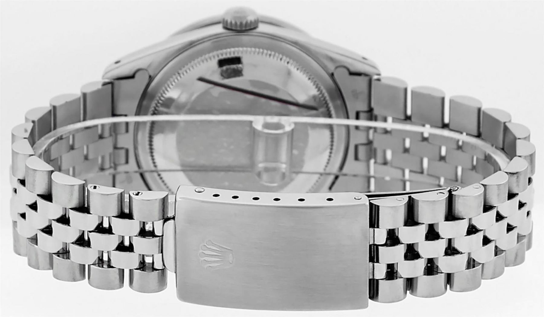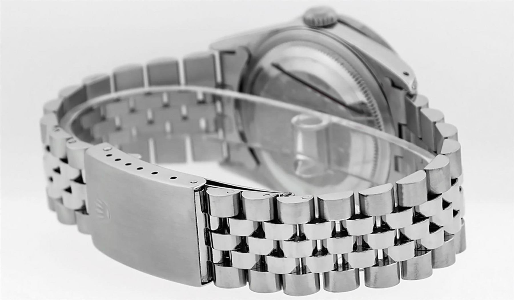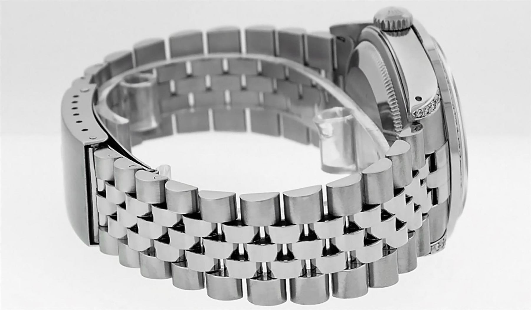One Mens Rolex Datejust Polished Bright with Satin Finish, Serviced & Electronically Tested, Stainless Steel Case: 36mm, Custom Diamonds On Lugs: 28 Diamonds On Lugs, Color: G to H, Clarity: SI-VS. Stainless Steel Crown, Custom Bezel: 18K White Gold Pyramid Diamond Bezel, Diamond Count: 24 Diamonds On Bezel, Total Weight .75 Carat, Clarity: SI-VS, Color: G to H. Custom Crystal: New Synthetic Sapphire Cyclops Lens. Custom Hands: New Solid Hands. Movement: Automatic Winding Movement. Custom Dial: Silver Diamond Dial, Diamond Count: 10 Diamonds In Dial, Diamond Color: G To H In Color, Clarity: SI-VS. Date Window: 3 O'Clock Position Date Display, Quickset, Model: Datejust Condition: G-6 Extra Fine. Bracelet: Stainless Steel Jubilee Band. Bright Polish & Satin Finish. 7.0 Inch Length, Adjustable. Standard Clasp, With Rolex Logo. This Watch Has Been Serviced And Polished And Its Free Of All Dents And Scratches.
