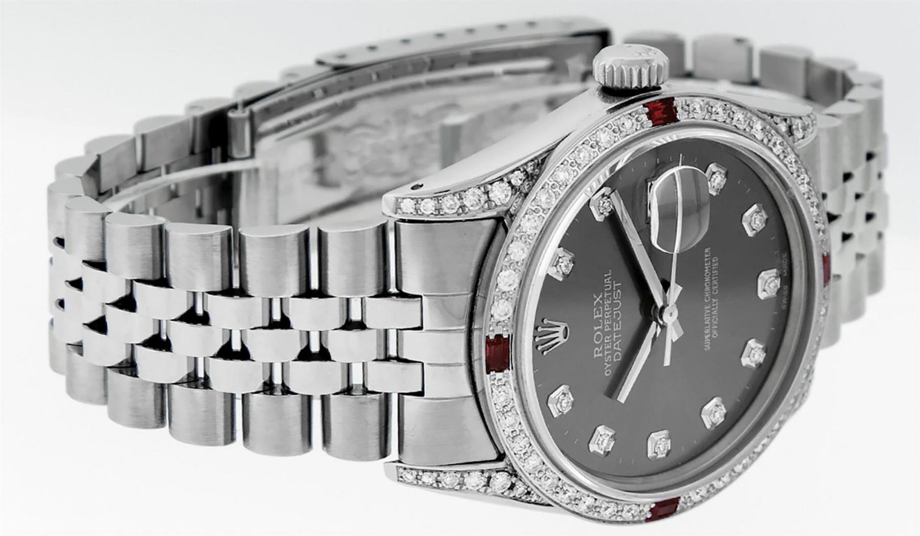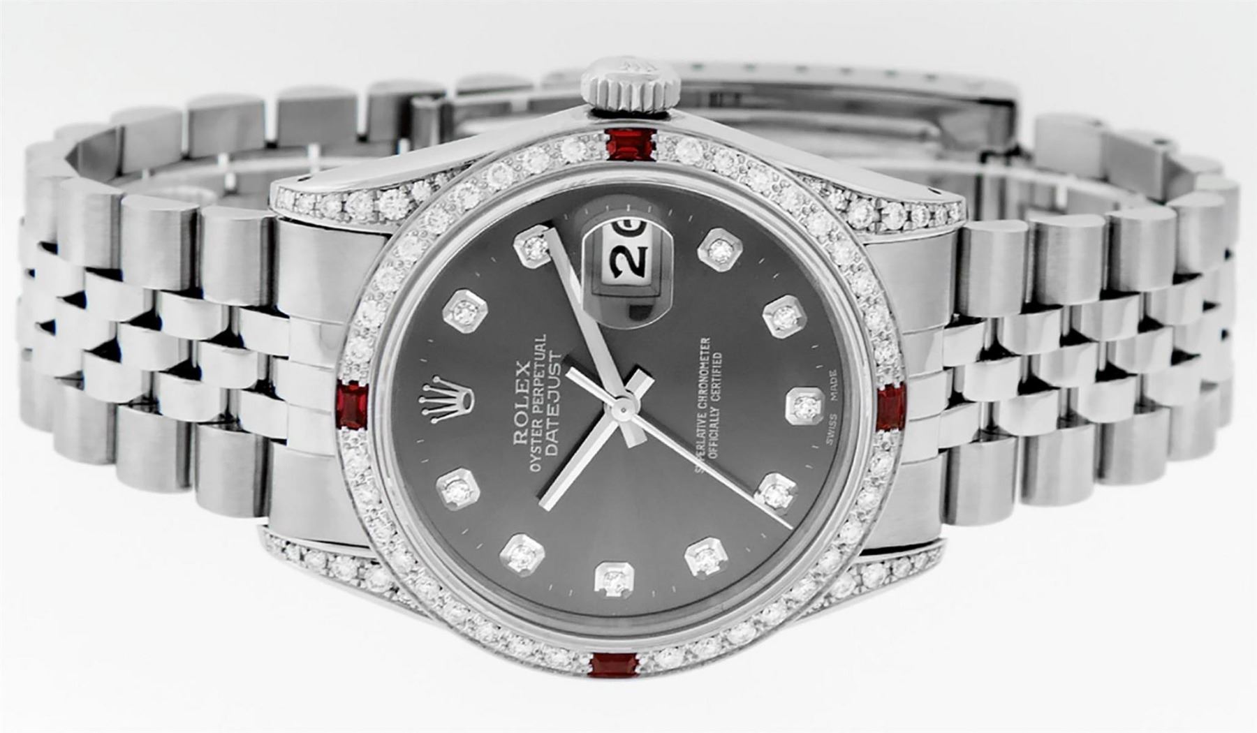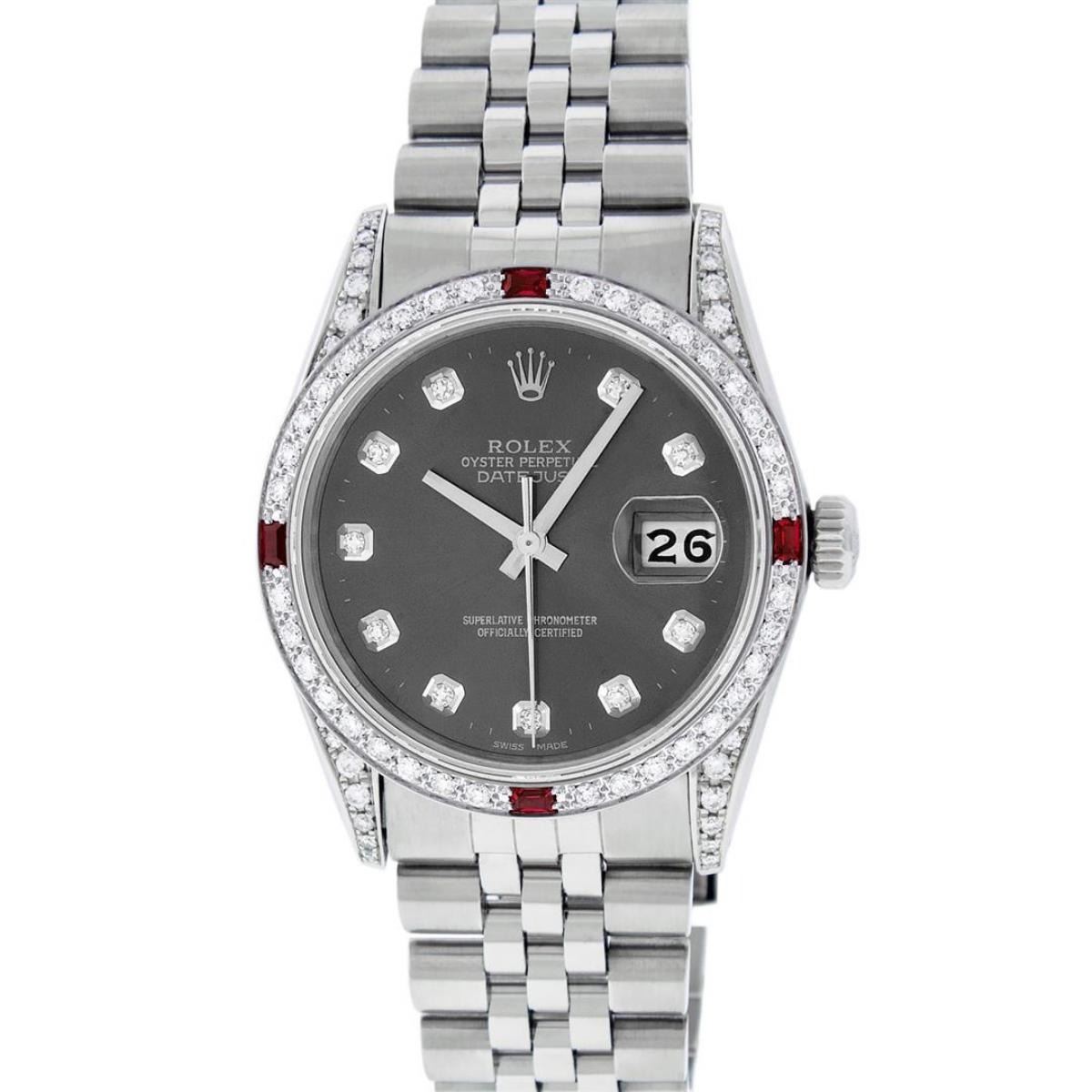 One Mens Rolex Datejust Polished Bright with Satin Finish, Serviced & Electronically Tested, Stainless Steel Case: 36mm, Custom Diamond Lugs: 28 Diamonds In Lugs, Color: G to H, Clarity: SI-VS. Stainless Steel Crown, Custom Bezel: 18K White Gold Diamond + Ruby Beadset, Diamond Count: 36 Diamonds + 4 Rubies, Total Weight 1.00 Carat, Clarity: SI-VS, Color: G to H. Custom Crystal: New Scratch Resistant Synthetic Sapphire Cyclops Lens. Custom Hands: New Luminescent Hands. Movement: Automatic Winding Movement. Custom Dial: Rhodium Single Cut Diamond Dial With Dash Track, Stone Count: 10 Diamonds In Dial, Diamond Color: G To H In Color, Clarity: VS. Date Window: 3 O'Clock Position Date Display, Quickset, Model: Datejust Condition: G-6 Extra Fine. Bracelet: Stainless Steel Jubilee Band. Bright Polish & Satin Finish. 7.0 Inch Length, Adjustable. Standard Clasp, With Rolex Logo. This Watch Has Been Serviced And Polished And Its Free Of All Dents And Scratches.