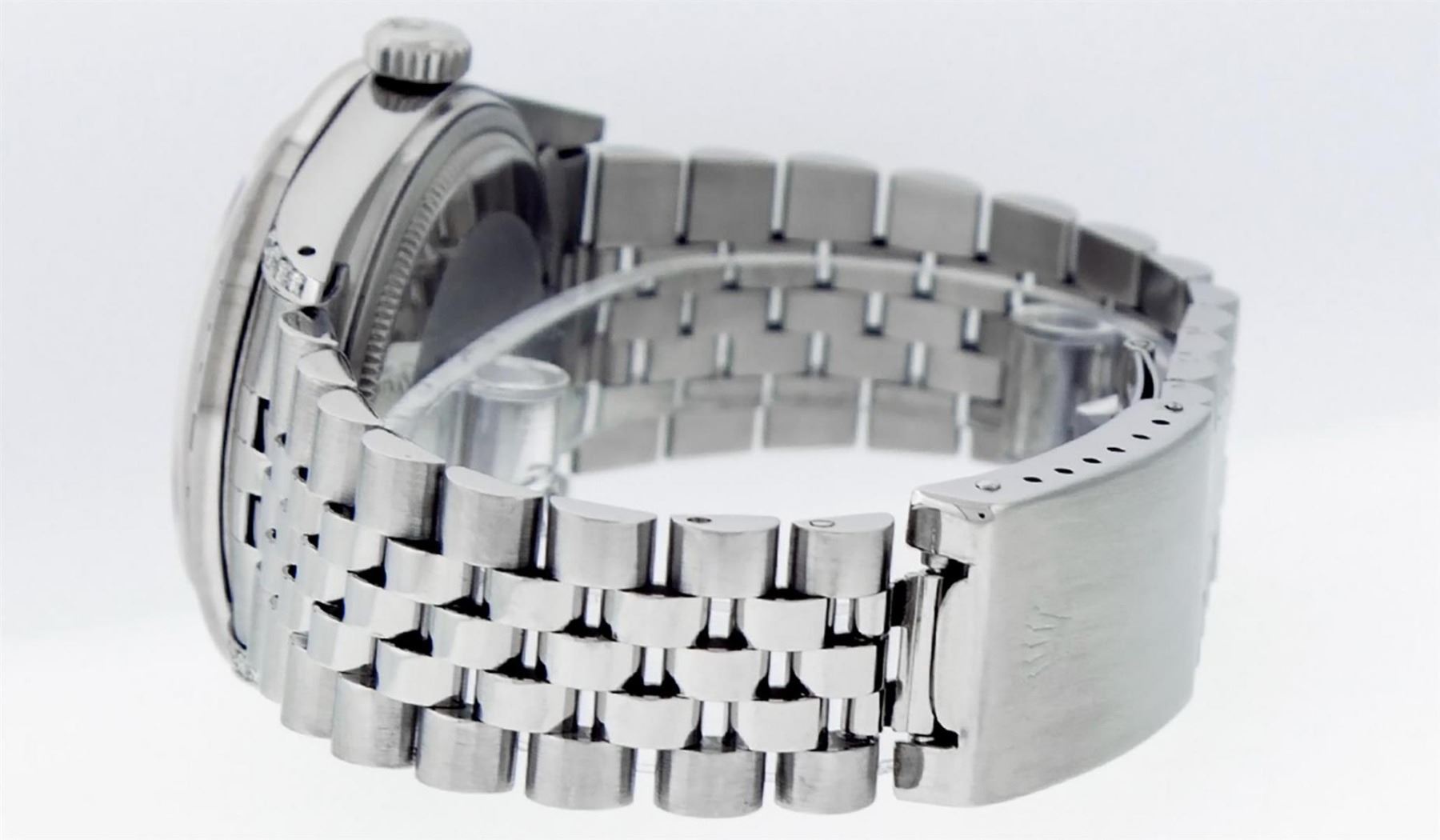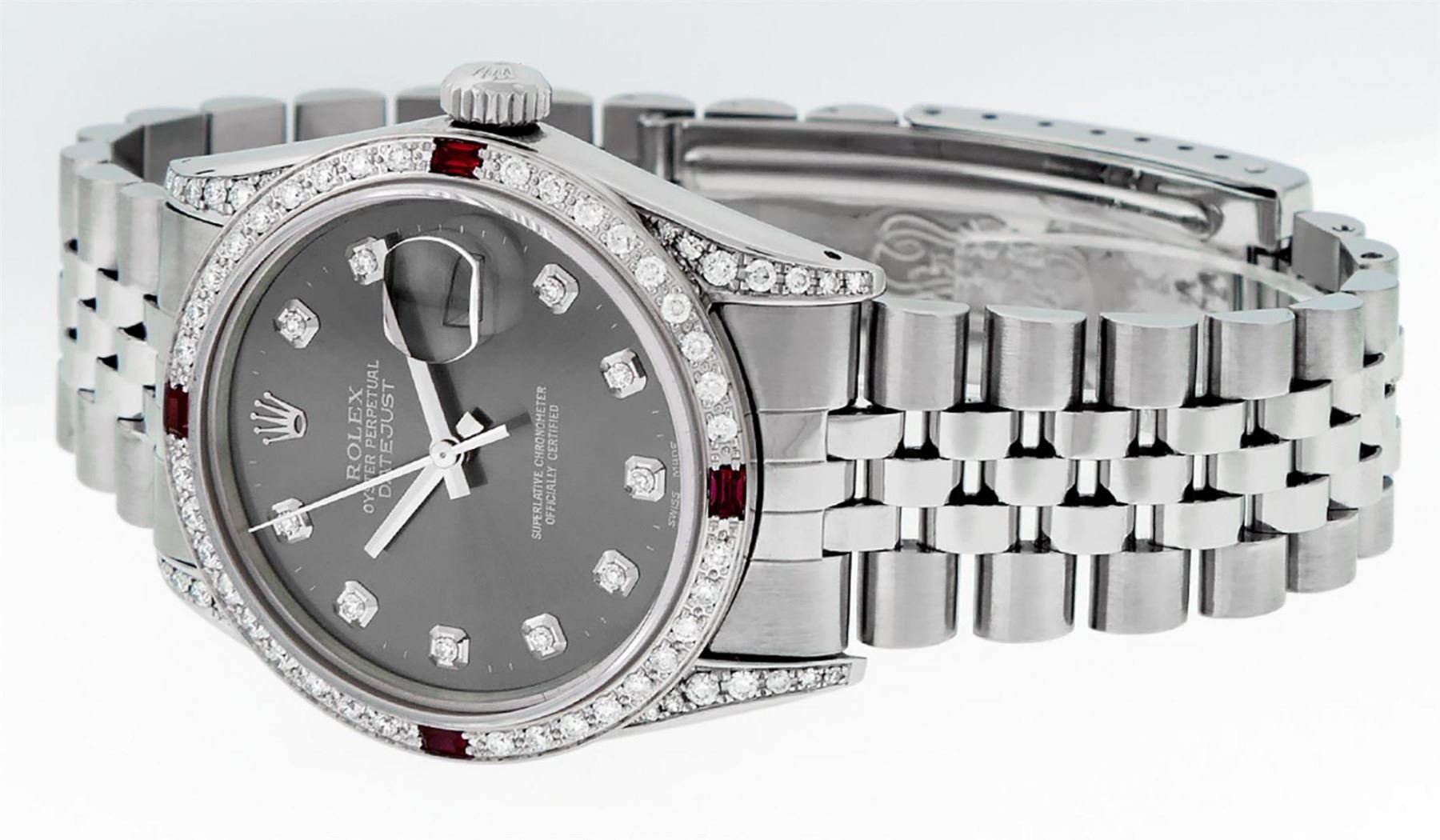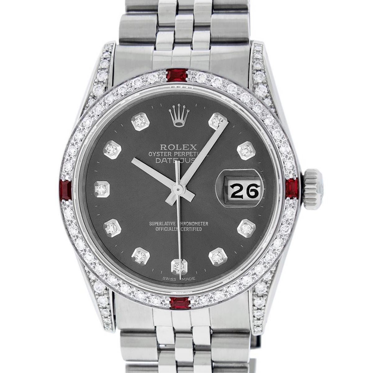 One Mens Rolex Datejust Polished Bright with Satin Finish, Serviced & Electronically Tested, Stainless Steel Case: 36mm, Custom Diamond Lugs: 28 Diamonds In Lugs, Color: G to H, Clarity: SI-VS. Stainless Steel Crown, Custom Bezel: 18K White Gold Diamond + Ruby Beadset, Diamond Count: 36 Diamonds + 4 Rubies, Total Weight 1.00 Carat, Clarity: SI-VS, Color: G to H. Custom Crystal: New Scratch Resistant Synthetic Sapphire Cyclops Lens. Custom Hands: New Luminescent Hands. Movement: Automatic Winding Movement. Custom Dial: Rhodium Single Cut Diamond Dial With Dash Track, Stone Count: 10 Diamonds In Dial, Diamond Color: G To H In Color, Clarity: VS. Date Window: 3 O'Clock Position Date Display, Quickset, Model: Datejust Condition: G-6 Extra Fine. Bracelet: Stainless Steel Jubilee Band. Bright Polish & Satin Finish. 7.0 Inch Length, Adjustable. Standard Clasp, With Rolex Logo. This Watch Has Been Serviced And Polished And Its Free Of All Dents And Scratches.