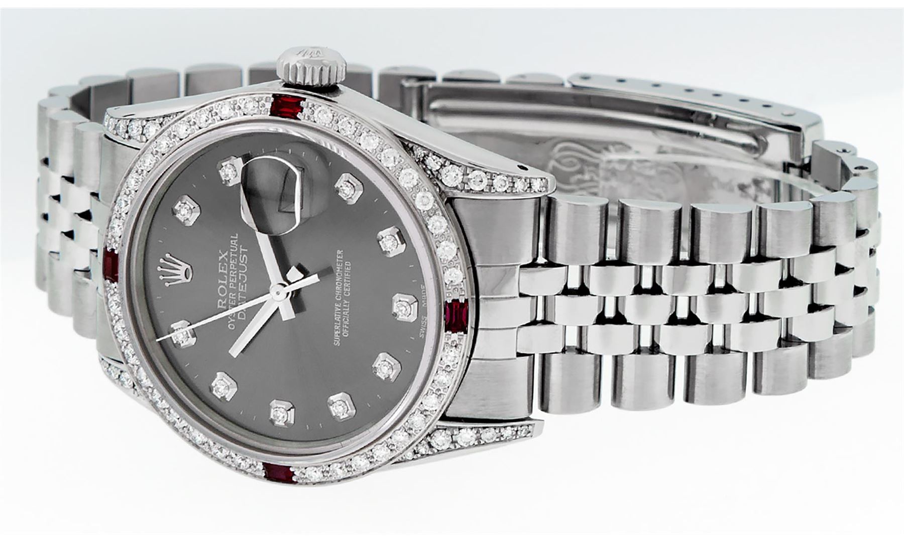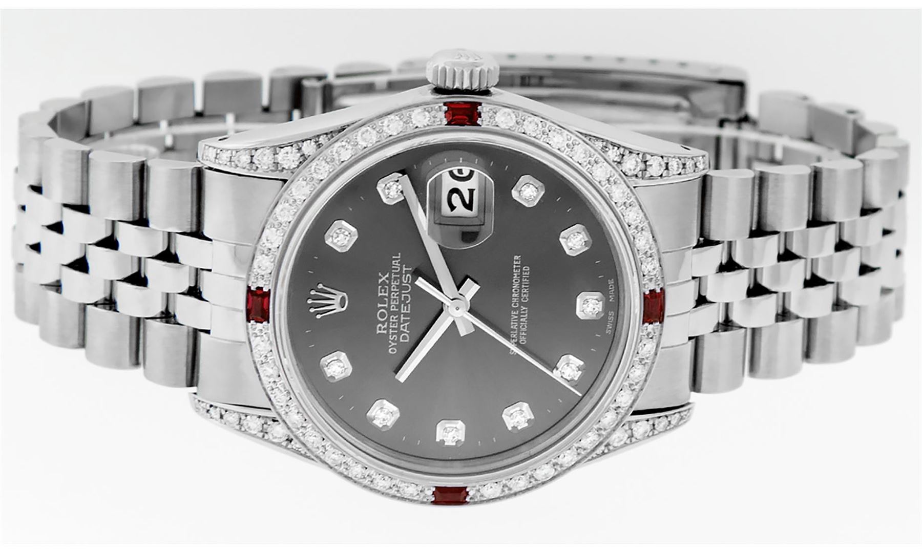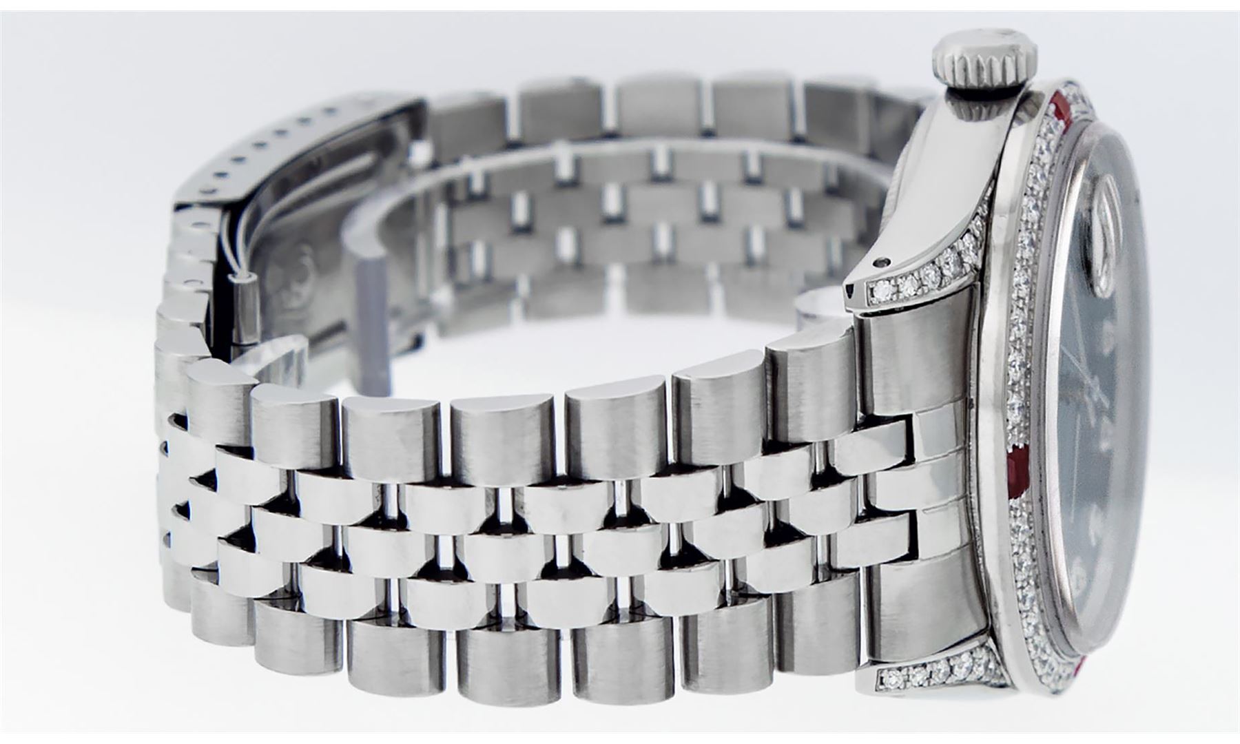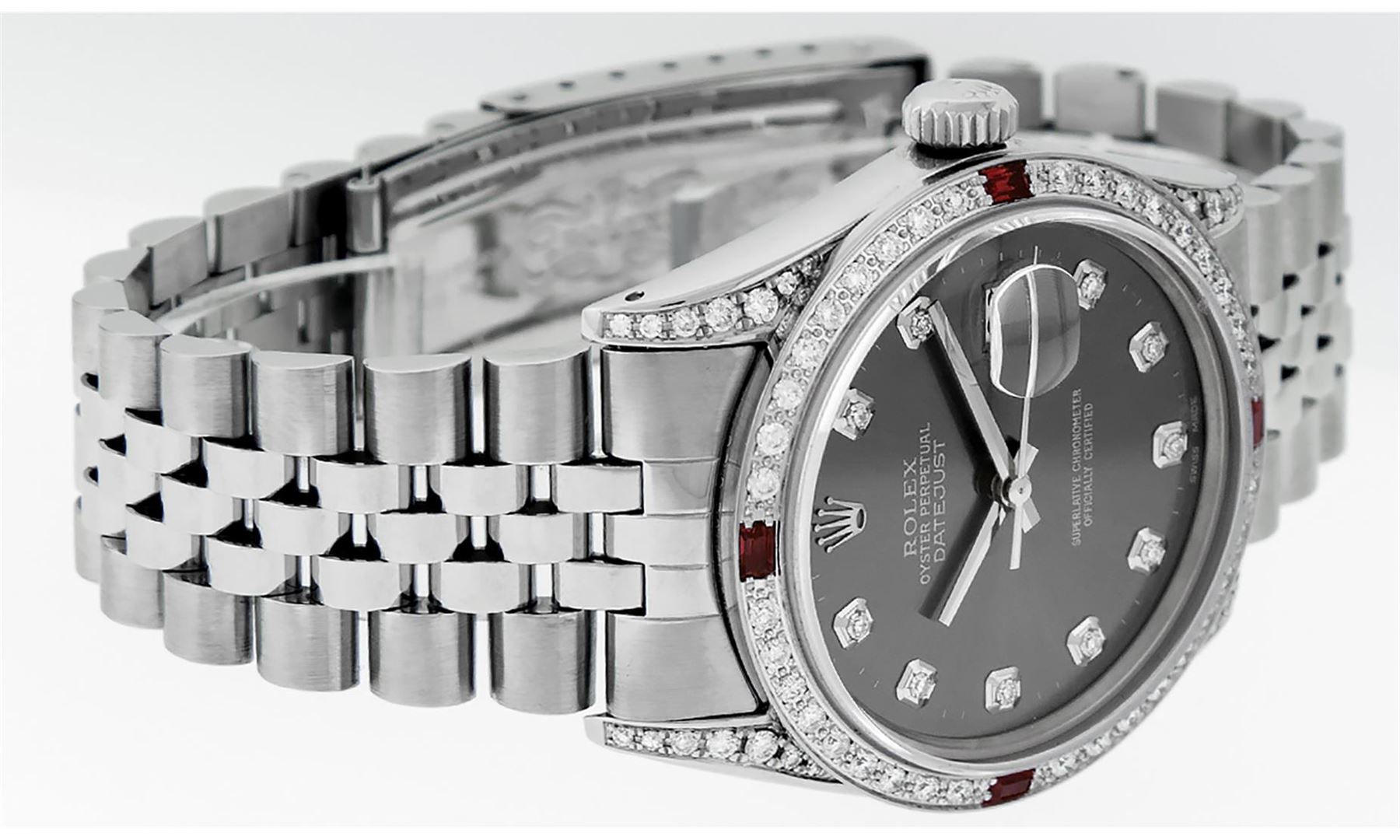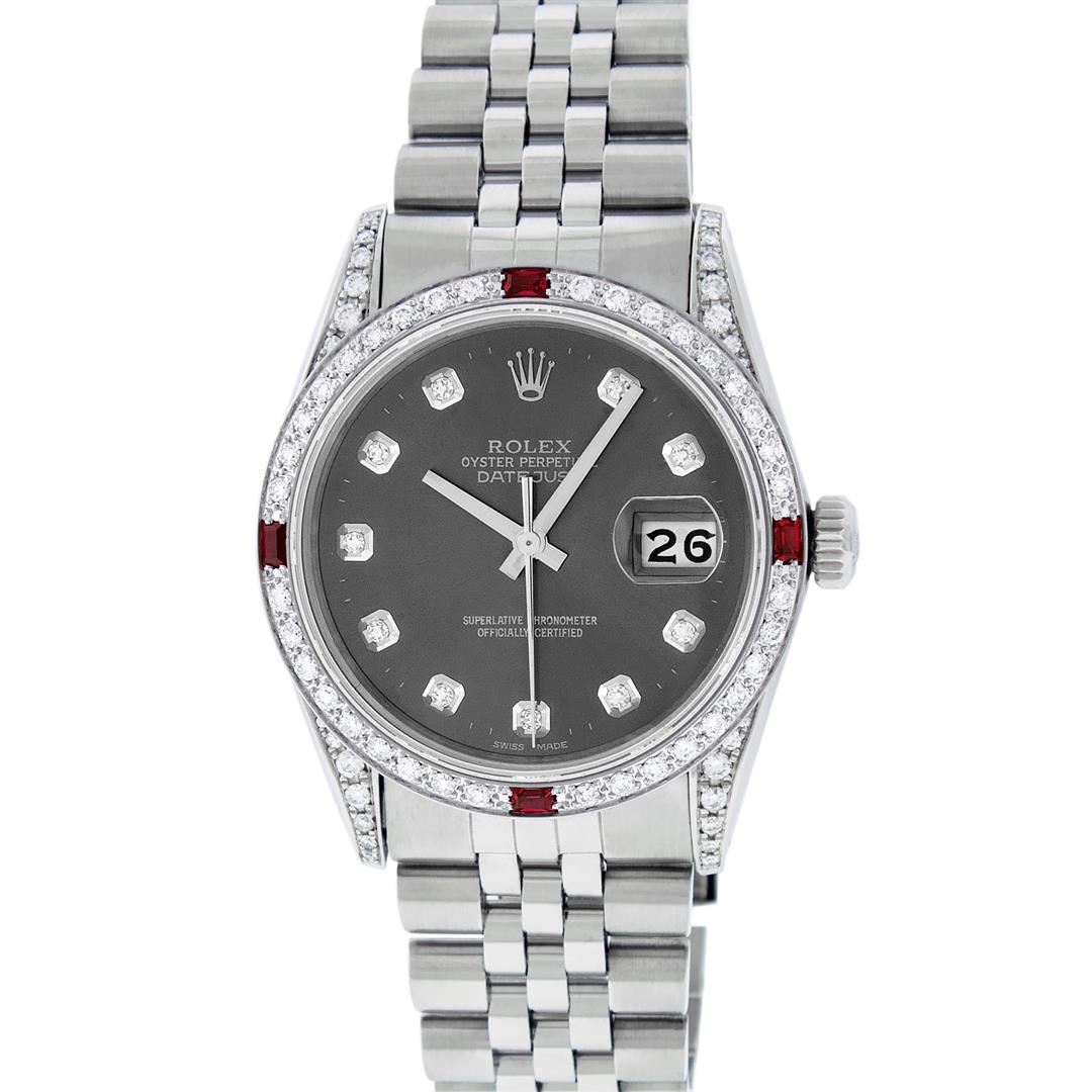 One Mens Pre Owned Rolex Datejust Polished Bright with Satin Finish, Serviced & Electronically Tested, Stainless Steel Case: 36mm, Custom Diamond Lugs: 28 Diamonds In Lugs, Color: G to H, Clarity: SI-VS. Rolex Stainless Steel Crown, Custom Bezel: New 18K White Gold Diamond + Ruby Beadset, Diamond Count: 36 Diamonds + 4 Rubies, Total Weight 1.00 Carat, Clarity: SI-VS, Color: G to H. Custom Crystal: New Sapphire With Magnified Date. Custom Hands: New Luminescent Hands. Rolex Movement: Automatic Winding Movement. Custom Dial: Rhodium Single Cut Diamond Dial With Dash Track, Stone Count: 10 Diamonds In Dial, Diamond Color: G To H In Color, Clarity: VS. Date Window: 3 O'Clock Position Date Display, Quickset, Model: Datejust Condition: G-6 Extra Fine. Rolex Bracelet: Stainless Steel Jubilee Band. Bright Polish & Satin Finish. 7.0 Inch Length, Adjustable. Standard Clasp, With Rolex Logo. This Watch Has Been Serviced And Polished And Its Free Of All Dents And Scratches.