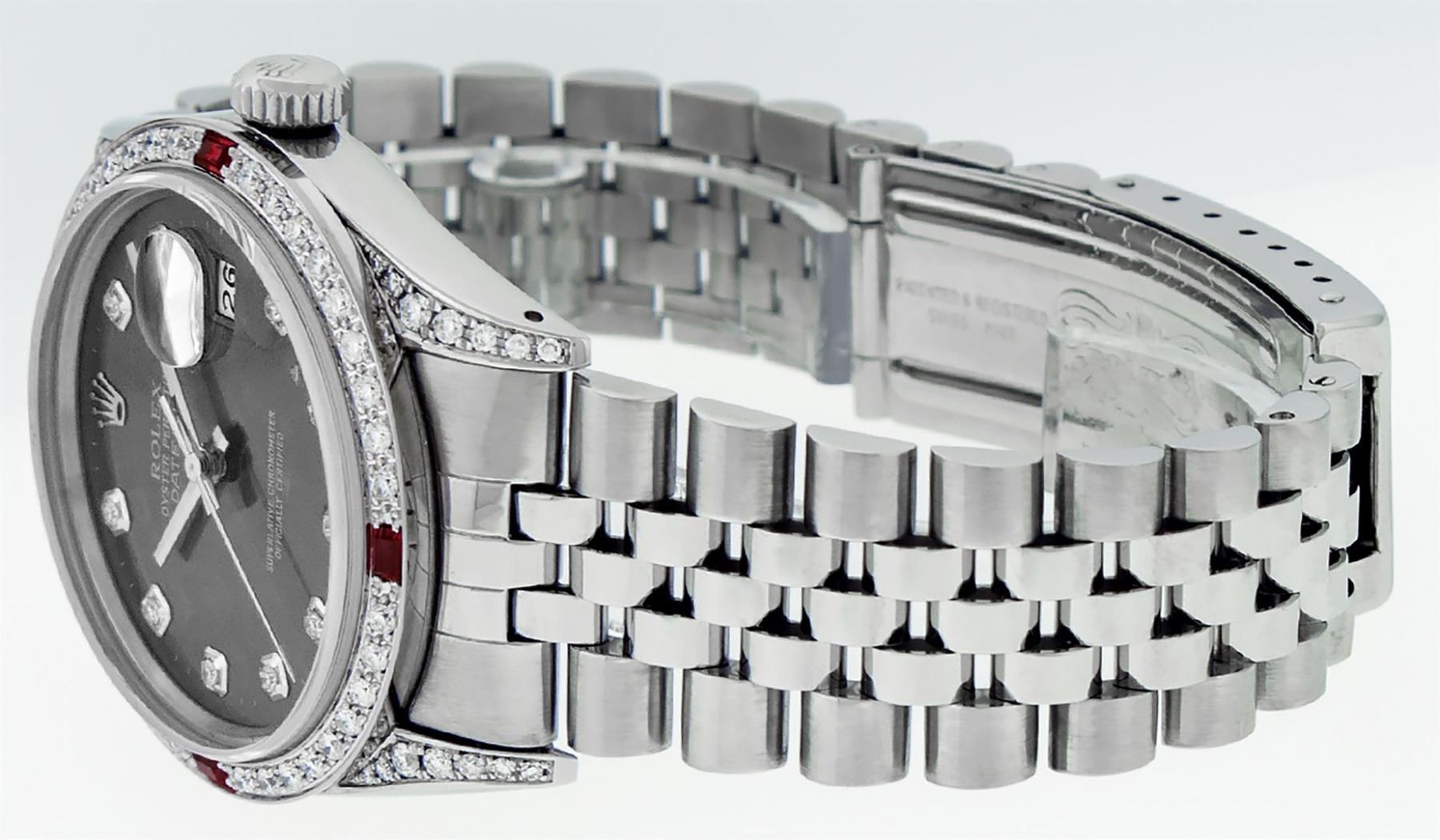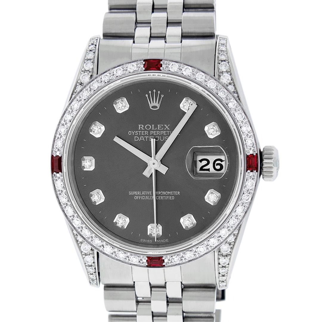 One Mens Pre Owned Rolex Datejust Polished Bright with Satin Finish, Serviced & Electronically Tested, Stainless Steel Case: 36mm, Custom Diamond Lugs: 28 Diamonds In Lugs, Color: G to H, Clarity: SI-VS. Rolex Stainless Steel Crown, Custom Bezel: New 18K White Gold Diamond + Ruby Beadset, Diamond Count: 36 Diamonds + 4 Rubies, Total Weight 1.00 Carat, Clarity: SI-VS, Color: G to H. Custom Crystal: New Sapphire With Magnified Date. Custom Hands: New Luminescent Hands. Rolex Movement: Automatic Winding Movement. Custom Dial: Rhodium Single Cut Diamond Dial With Dash Track, Stone Count: 10 Diamonds In Dial, Diamond Color: G To H In Color, Clarity: VS. Date Window: 3 O'Clock Position Date Display, Quickset, Model: Datejust Condition: G-6 Extra Fine. Rolex Bracelet: Stainless Steel Jubilee Band. Bright Polish & Satin Finish. 7.0 Inch Length, Adjustable. Standard Clasp, With Rolex Logo. This Watch Has Been Serviced And Polished And Its Free Of All Dents And Scratches.