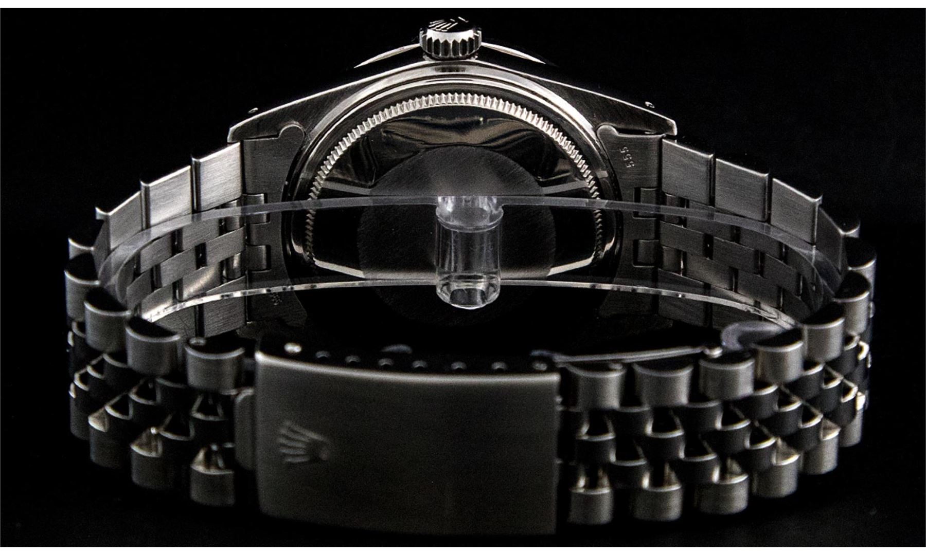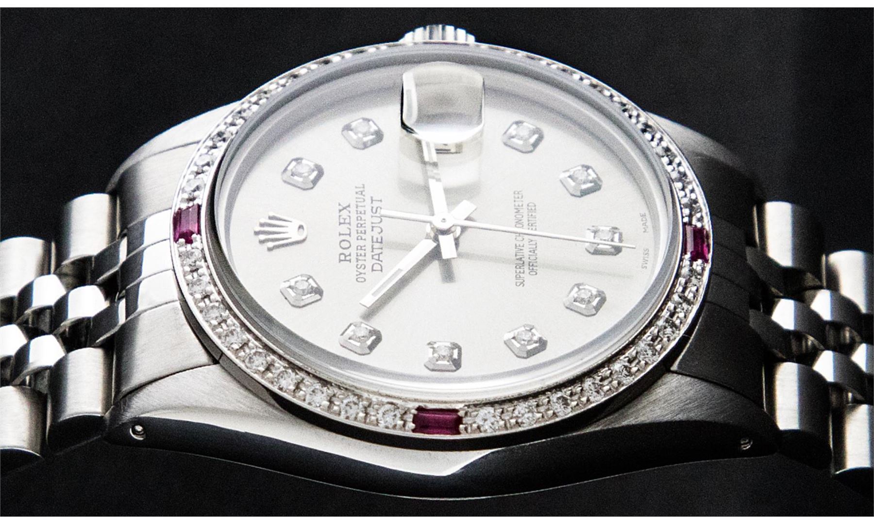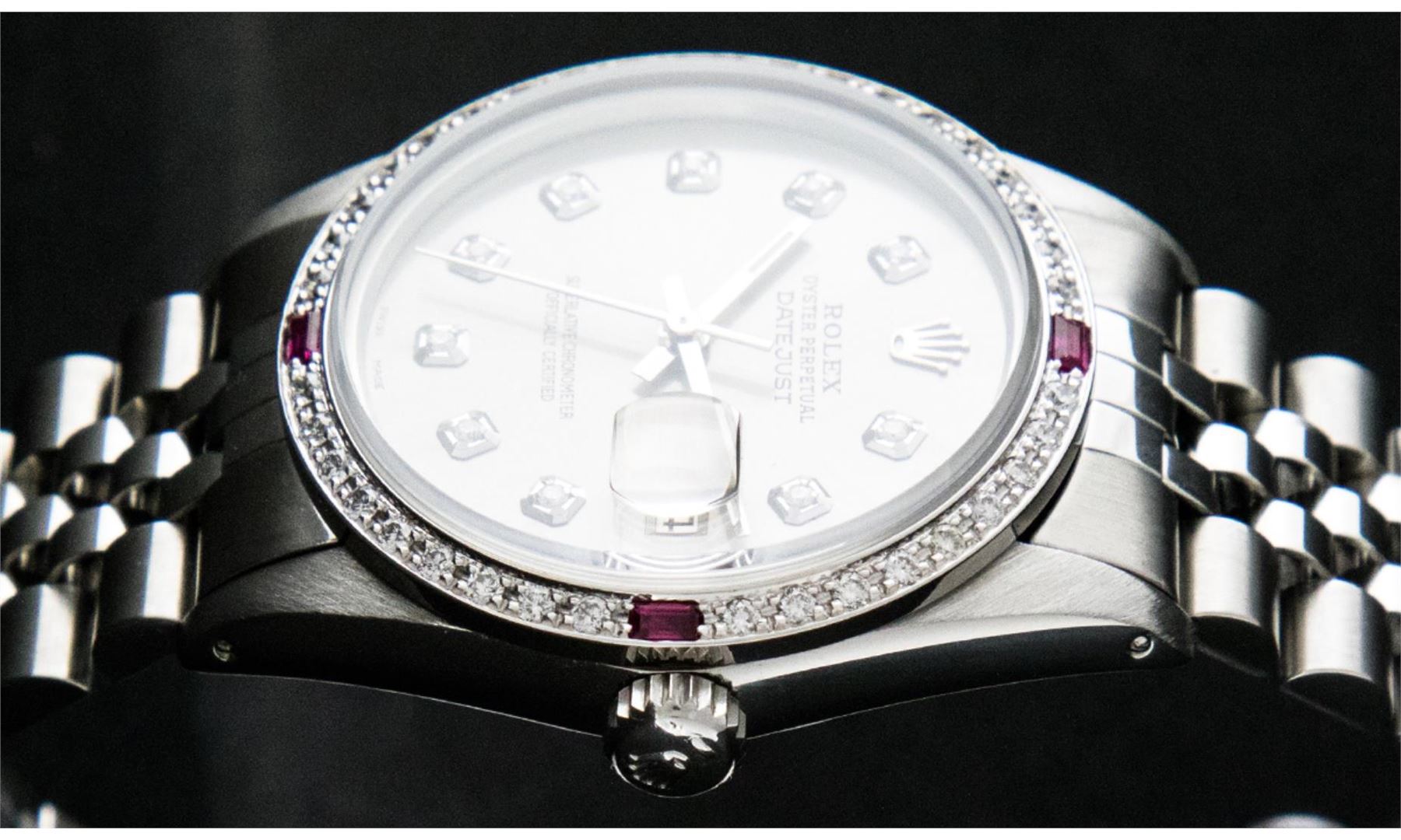 One Pre Owned Stainless Steel Rolex Datejust 36MM Polished Bright with Satin Finish, This Watch Has Been Serviced And Electronically Tested, Rolex Stainless Steel Case: 36mm, Rolex Stainless Steel Crown, Custom Bezel: New 18K White Gold Ruby Beadset Diamond Bezel, Diamond + Gem Count: 36 Diamonds + 4 Rubies. Custom Crystal: New Sapphire With Date Window. Custom Hands: New Luminescent Hands. Rolex Movement: Automatic Winding Movement 3035. Custom Dial: Custom Slate Grey Dial With Added Diamond Hour Markers, Diamond Count: 10 Diamonds in Dial. Date Window: 3 O'Clock Position Date Display, Quickset, Model: Quickset Datejust, Condition: G-6 Extra Fine. Rolex Bracelet: Stainless Steel Jubilee Band. Bracelet: 7.0 Inch Length, Adjustable. Standard Clasp, With Rolex Logo. This Watch Has Been Serviced Time Tested And Is In Excellent Condition It Is Free Of All Scratches And Dents.