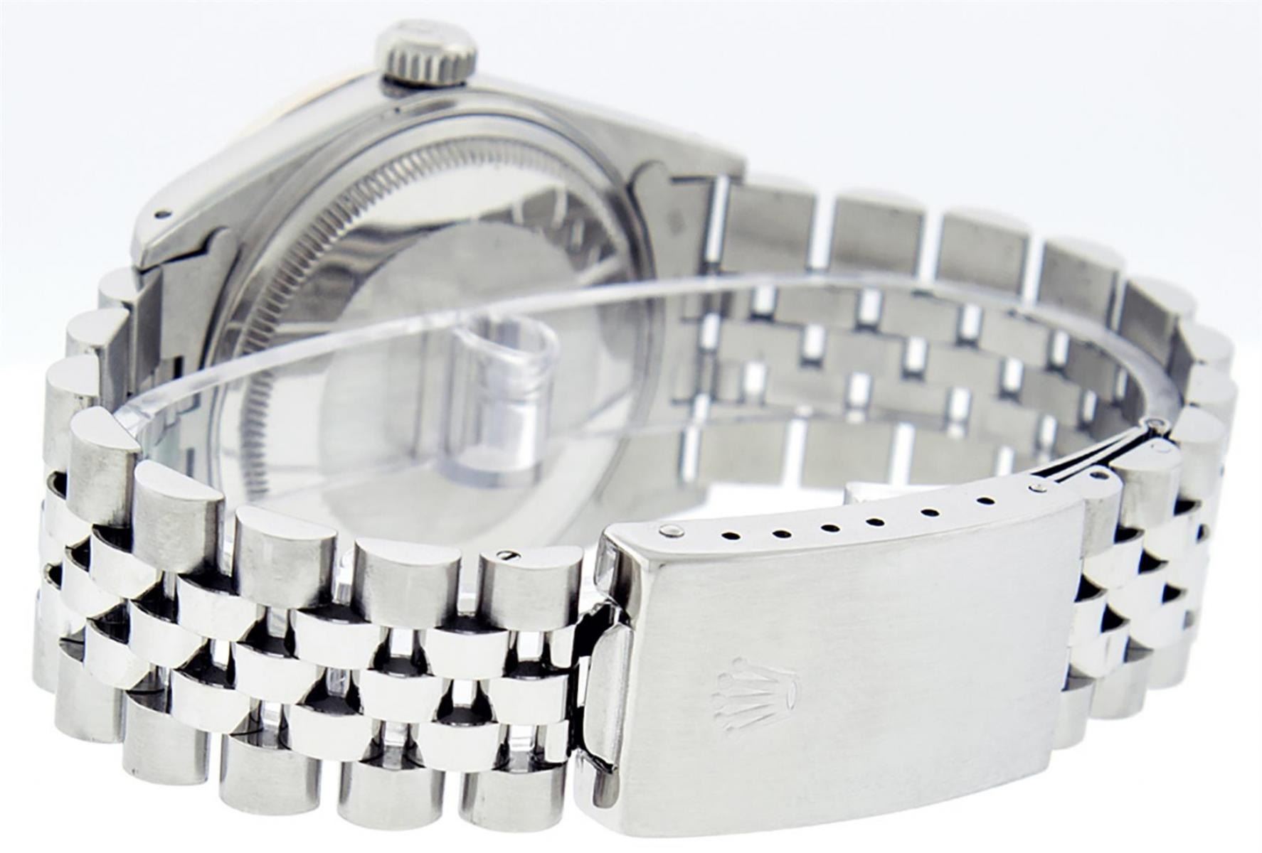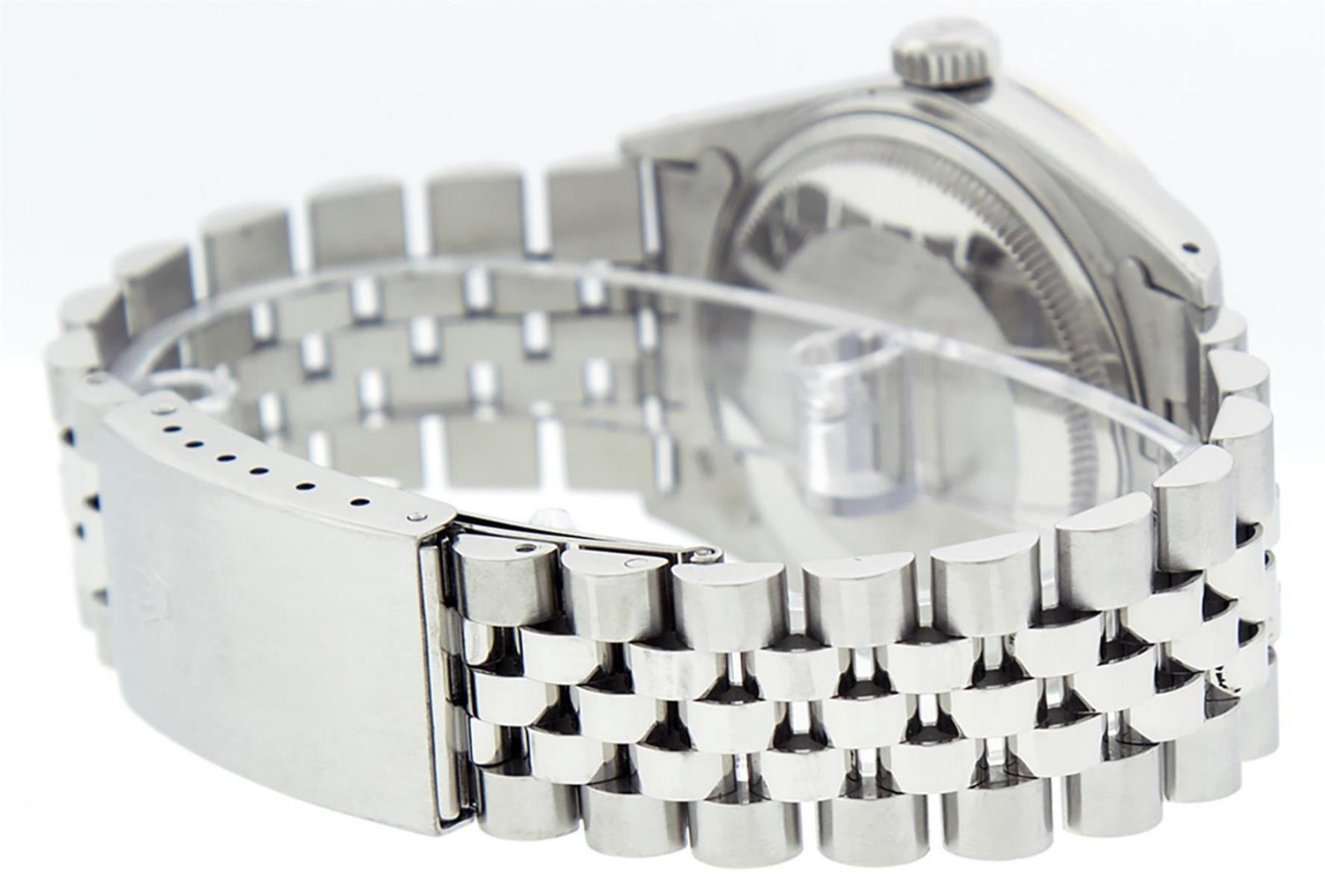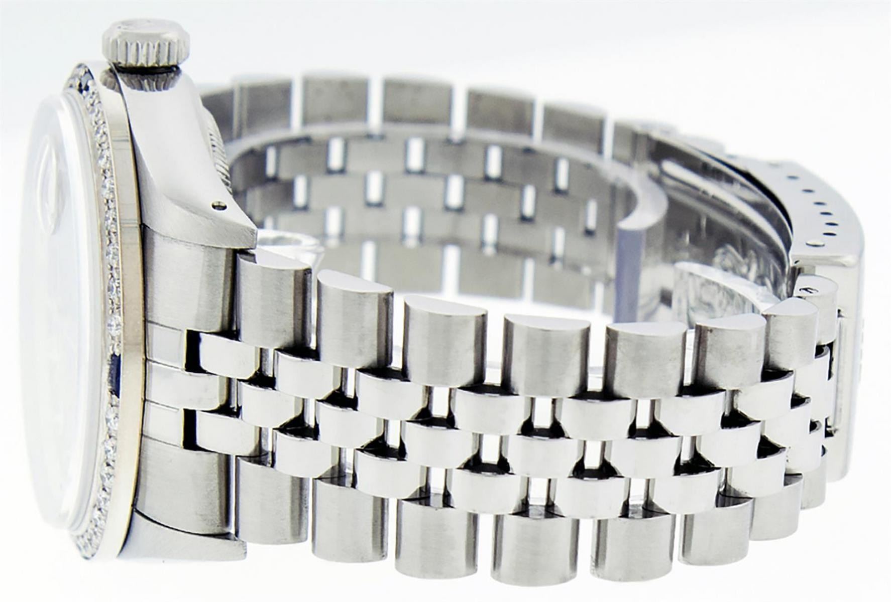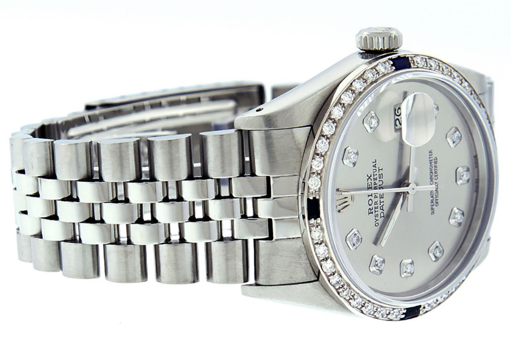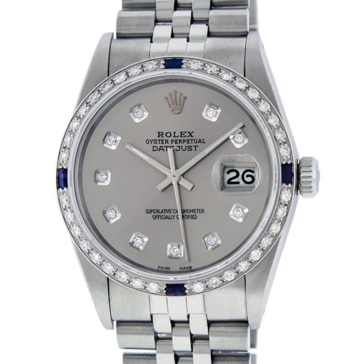 One Mens Stainless Steel Rolex Datejust Polished Bright with Satin Finish, This Watch Has Been Serviced & Electronically Tested, Stainless Steel Case: 36mm, Stainless Steel Crown, Custom Bezel: New 18K White Gold Sapphire Beadset Diamond Bezel, Diamond + Gem Count: 36 Diamonds + 4 Sapphires, Total Weight 1.00 Carat, Clarity: SI-VS, Color: G to H. Custom Crystal: New Synthetic Sapphire Cyclops Lens. Custom Hands: New Luminescent Hands. Movement: Automatic Winding Movement. Custom Dial: Slate Grey With Diamond Hour Markers, Diamond Count: 10 Diamonds in Dial, Diamond Color: G To H In Color, Clarity: SI-VS. Date Window: 3 O'Clock Position Date Display, Quickset, Model: Datejust, Condition: G-6 Extra Fine. Bracelet: Stainless Steel Jubilee. Bracelet: 7.0 Inch Length, Adjustable. Standard Clasp, With Rolex Logo. This Watch Has Been Serviced Time Tested And Is In Excellent Condition It Is Free Of All Scratches And Dents.