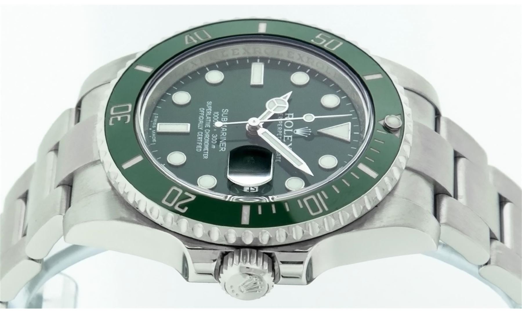 One Mens Pre Owned Rolex Submariner With Date Polished, Serviced & Electronically Tested, Stainless Steel Case: 40mm, Stainless Steel Crown, Custom Bezel: Stainless Steel With Rotatable Bezel With Green Ceramic Insert. Crystal: Sapphire With Magnified Date Window. Rolex Movement: Automatic Winding Movement Caliber 3135. Rolex Dial: Green Rolex Submariner Dial. Date Window: 3 O'Clock Position Date Display, Model: Submariner 116610LV, Quickset, Condition: G-6 Extra Fine. Rolex Bracelet: Stainless Steel Oyster. Bright Polish & Satin Finish. 7.0 Inch Length, Adjustable. Standard Clasp, With Rolex Logo.