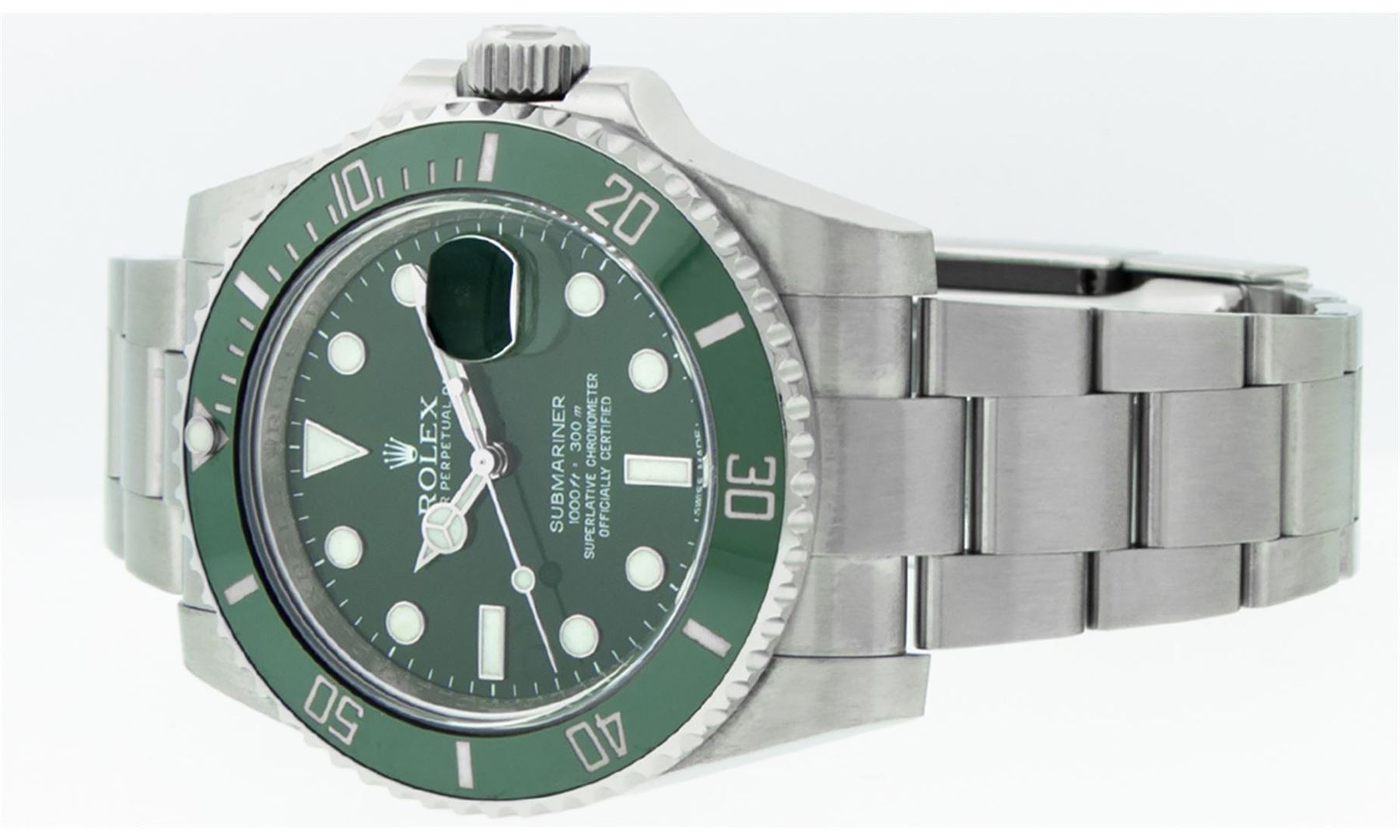 One Mens Pre Owned Rolex Submariner With Date Polished, Serviced & Electronically Tested, Stainless Steel Case: 40mm, Stainless Steel Crown, Custom Bezel: Stainless Steel With Rotatable Bezel With Green Ceramic Insert. Crystal: Sapphire With Magnified Date Window. Rolex Movement: Automatic Winding Movement Caliber 3135. Rolex Dial: Green Rolex Submariner Dial. Date Window: 3 O'Clock Position Date Display, Model: Submariner 116610LV, Quickset, Condition: G-6 Extra Fine. Rolex Bracelet: Stainless Steel Oyster. Bright Polish & Satin Finish. 7.0 Inch Length, Adjustable. Standard Clasp, With Rolex Logo.