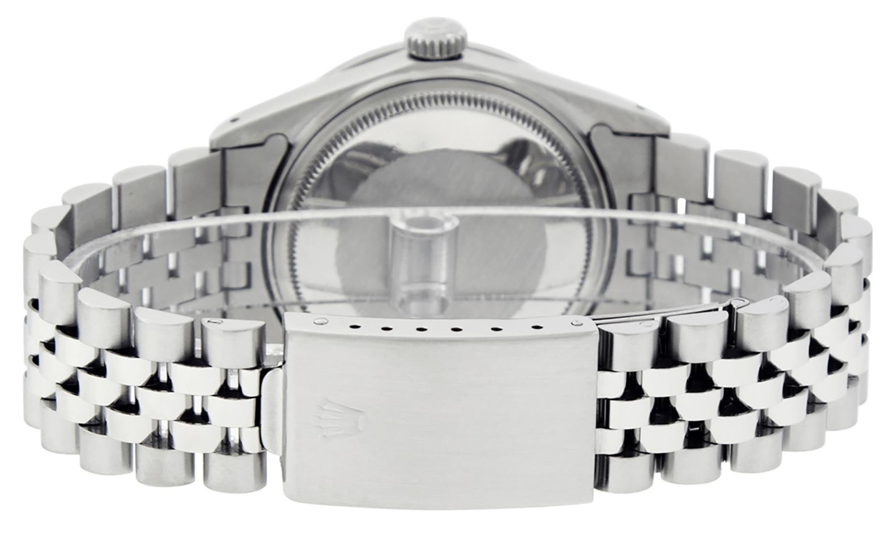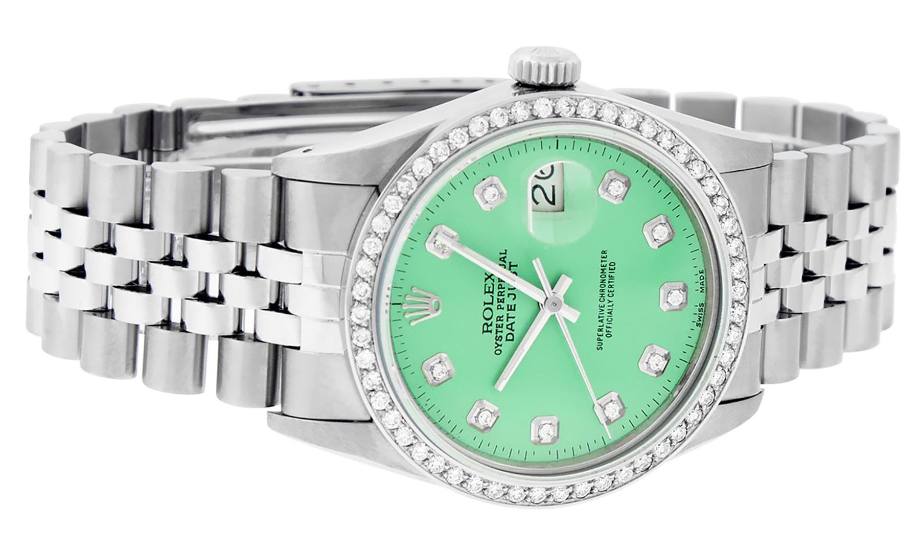 One Mens Pre Owned Rolex Stainless Steel Datejust Polished Bright with Satin Finish, This Watch Has Been Serviced & Electronically Tested, Rolex Stainless Steel Case: 36mm, Rolex Stainless Steel Crown, Custom Bezel: New Stainless Steel Bead set Diamond Bezel, Diamond Count: 54 Diamonds In Bezel, Clarity: SI-VS, Color: G to H. Custom Crystal: New Sapphire With Magnified Date Window. Custom Hands: New Luminescent Hands. Rolex Movement: Automatic Winding Movement. Custom Dial: Refinished To Green With Custom Added Diamonds, Diamond Count: 10 Diamonds On Dial, Color: G to H, Clarity: VS2-SI1. Date Window: 3 O'clock Position Date Display, Quickset, Model: Datejust. Condition: G-6 Extra Fine. Rolex Bracelet: Stainless Steel Jubilee Band. Bright Polish & Satin Finish. 7.0 Inch Length, Adjustable. Standard Clasp, With Rolex Logo. This Watch Has Been Serviced Time Tested And Is In Excellent Condition It Is Free Of All Scratches And Dents.