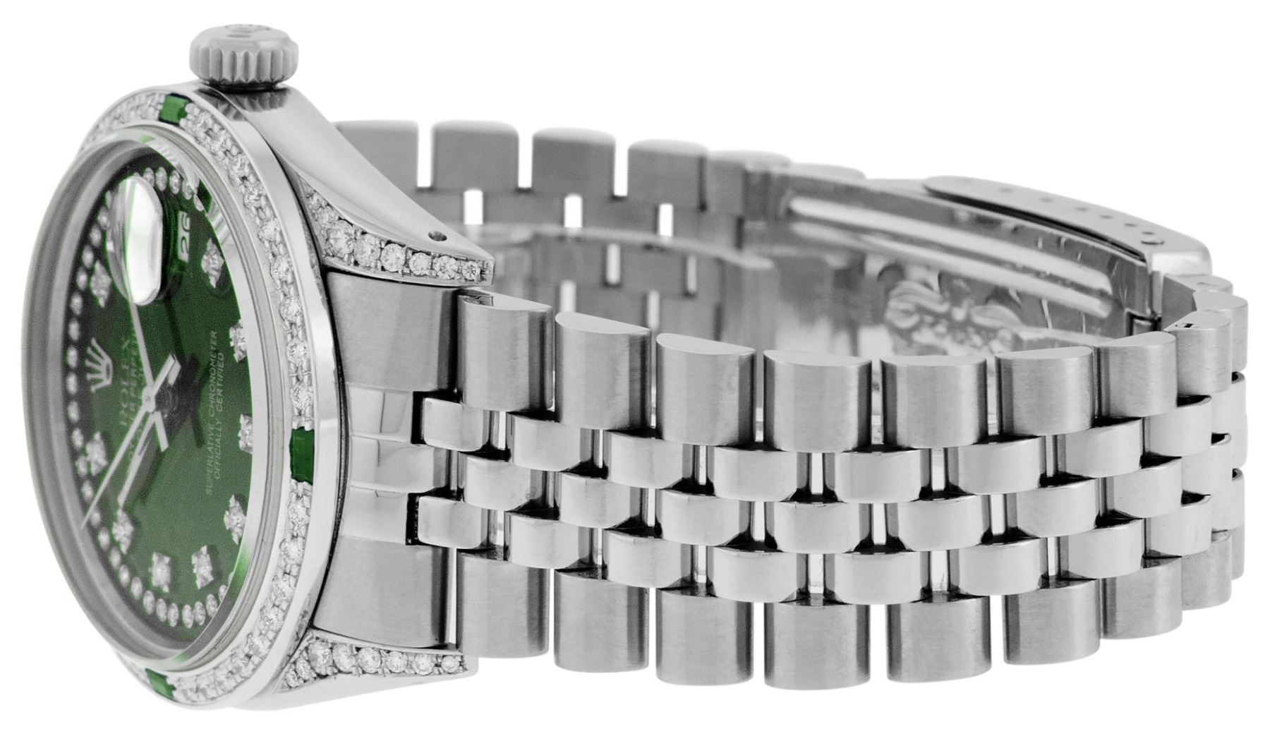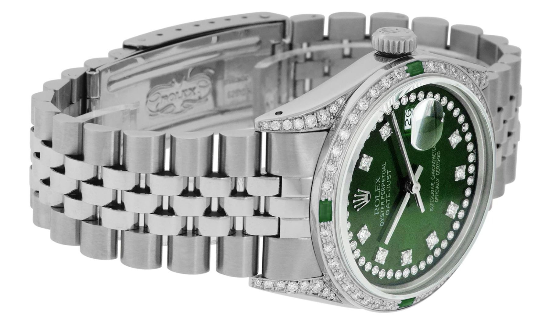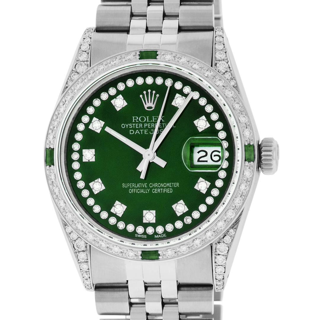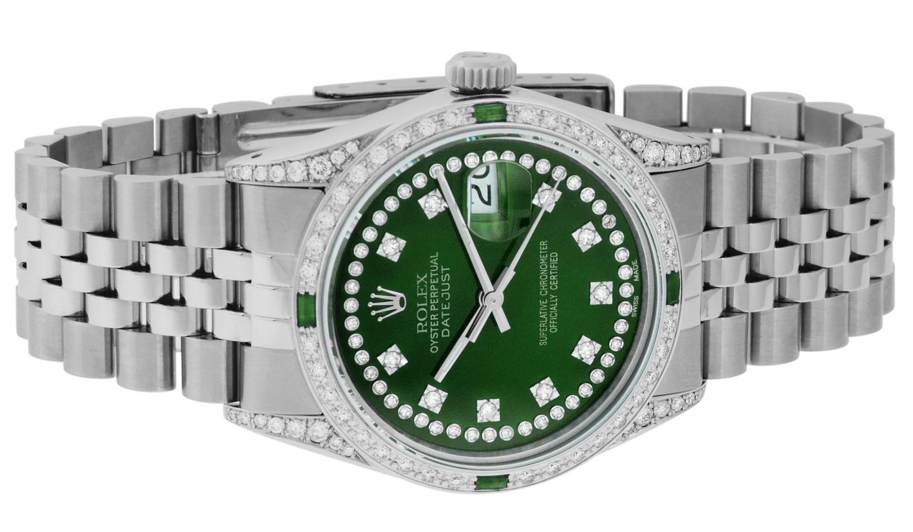 One Mens Pre Owned Rolex Datejust Polished Bright with Satin Finish, Serviced And Electronically Tested, Rolex Stainless Steel Case: 36mm, Custom Diamond Lugs: 28 Diamonds On Lugs. Rolex Stainless Steel Crown, Custom Bezel: 18K White Gold Diamond + Emerald Beadset, Diamond Count: 36 Diamonds + 4 Emeralds. Custom Crystal: New Sapphire With Date Window. Custom Hands: New Luminescent Hands. Rolex Movement: Automatic Winding Movement 3035. Custom Dial: Custom Green Dial With Added Diamonds Hour Markers, Stone Count: 43 Diamonds On Dial. Date Window: 3 O'Clock Position Date Display, Quickset, Model: Datejust Condition: G-6 Extra Fine. Rolex Bracelet: Stainless Steel Jubilee Band. Bright Polish And Satin Finish. 7.0 Inch Length, Adjustable. Standard Clasp, With Rolex Logo. This Watch Has Been Serviced And Polished And Its Free Of All Dents And Scratches.