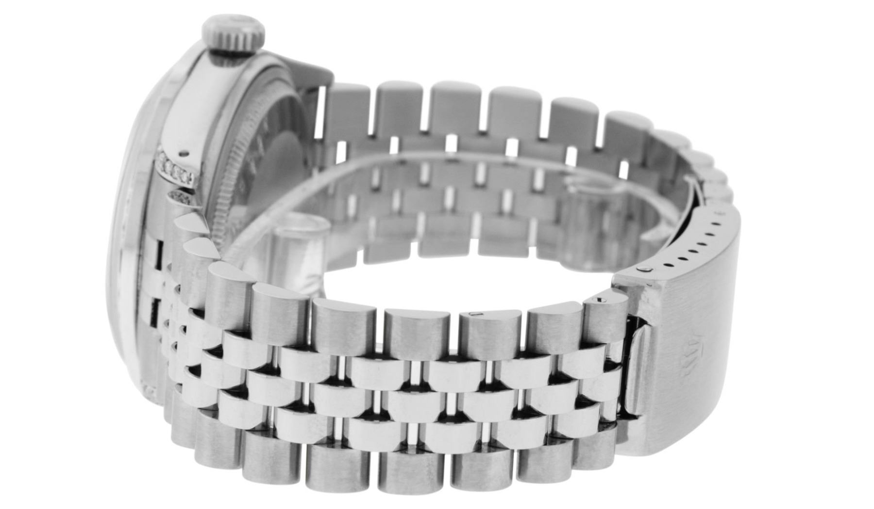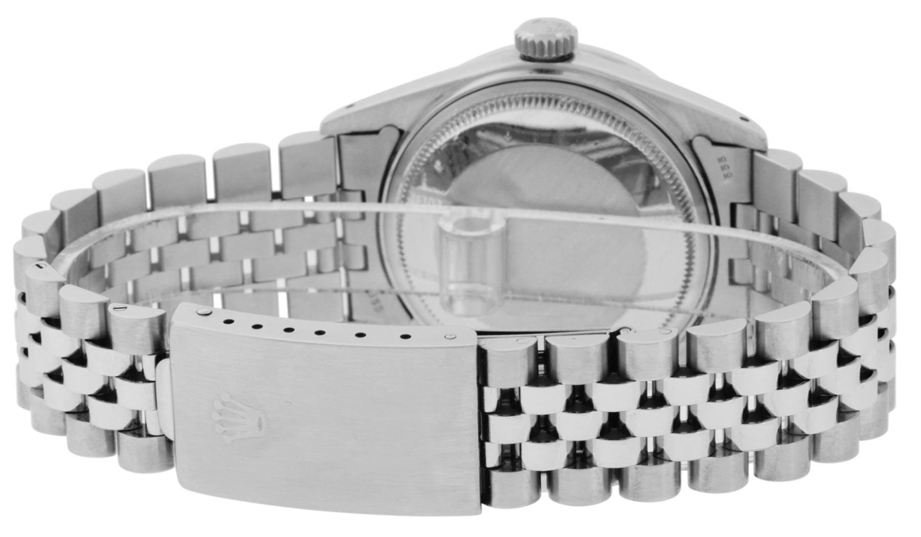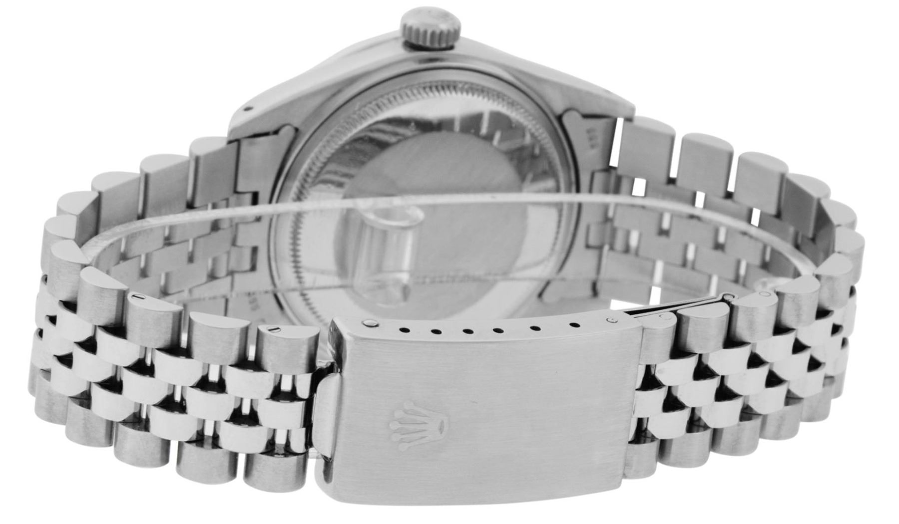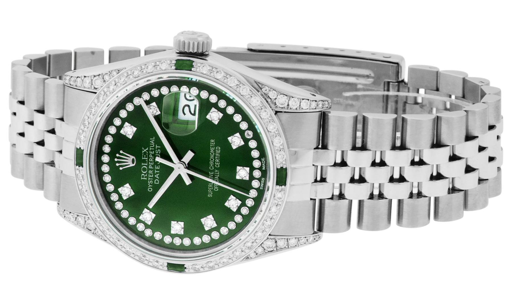One Mens Pre Owned Rolex Datejust Polished Bright with Satin Finish, Serviced And Electronically Tested, Rolex Stainless Steel Case: 36mm, Custom Diamond Lugs: 28 Diamonds On Lugs. Rolex Stainless Steel Crown, Custom Bezel: 18K White Gold Diamond + Emerald Beadset, Diamond Count: 36 Diamonds + 4 Emeralds. Custom Crystal: New Sapphire With Date Window. Custom Hands: New Luminescent Hands. Rolex Movement: Automatic Winding Movement 3035. Custom Dial: Custom Green Dial With Added Diamonds Hour Markers, Stone Count: 43 Diamonds On Dial. Date Window: 3 O'Clock Position Date Display, Quickset, Model: Datejust Condition: G-6 Extra Fine. Rolex Bracelet: Stainless Steel Jubilee Band. Bright Polish And Satin Finish. 7.0 Inch Length, Adjustable. Standard Clasp, With Rolex Logo. This Watch Has Been Serviced And Polished And Its Free Of All Dents And Scratches.
