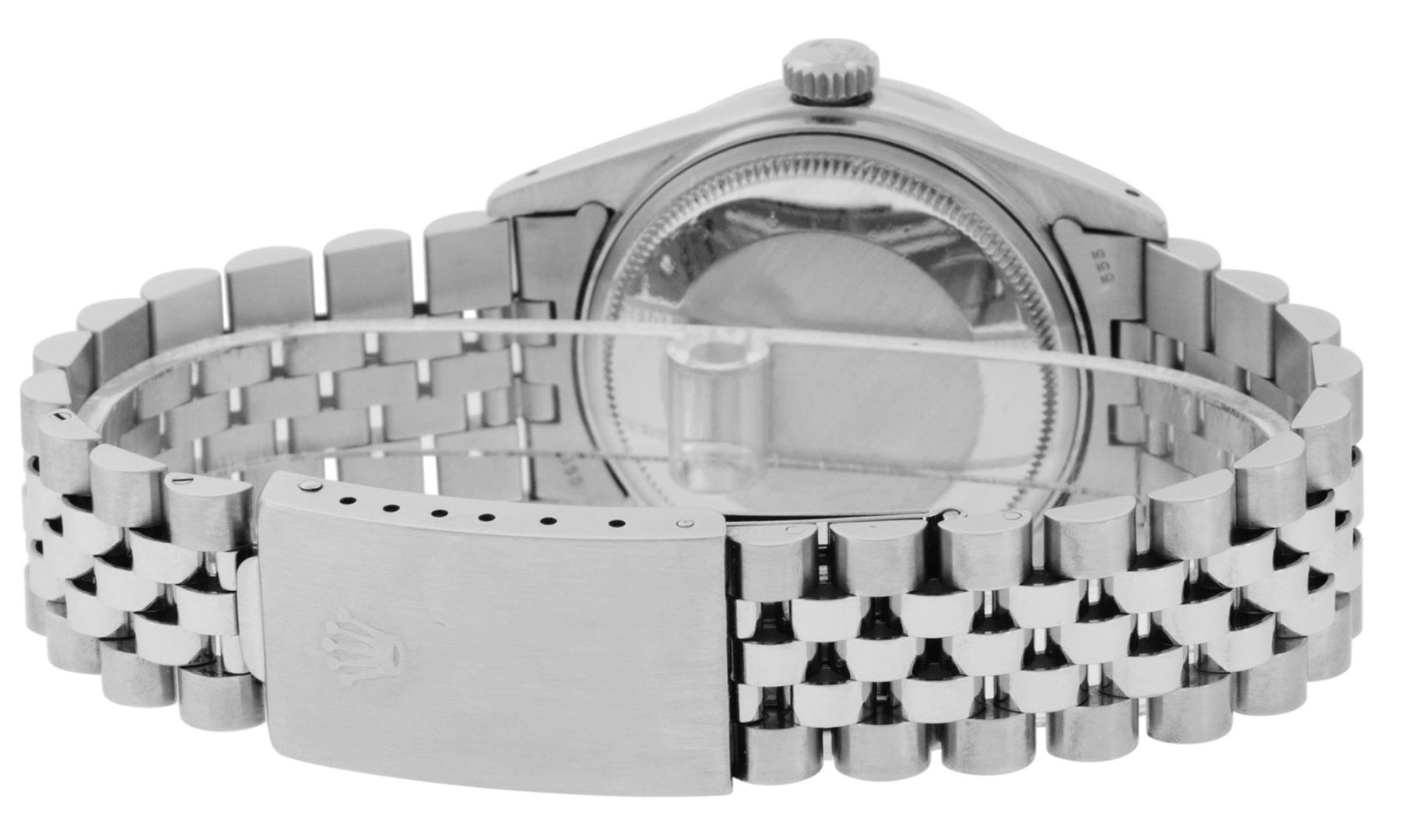 One Mens Pre Owned Rolex Datejust Polished Bright with Satin Finish, Serviced And Electronically Tested, Rolex Stainless Steel Case: 36mm, Custom Diamond Lugs: 28 Diamonds On Lugs. Rolex Stainless Steel Crown, Custom Bezel: 18K White Gold Diamond + Emerald Beadset, Diamond Count: 36 Diamonds + 4 Emeralds. Custom Crystal: New Sapphire With Date Window. Custom Hands: New Luminescent Hands. Rolex Movement: Automatic Winding Movement 3035. Custom Dial: Custom Green Dial With Added Diamonds Hour Markers, Stone Count: 43 Diamonds On Dial. Date Window: 3 O'Clock Position Date Display, Quickset, Model: Datejust Condition: G-6 Extra Fine. Rolex Bracelet: Stainless Steel Jubilee Band. Bright Polish And Satin Finish. 7.0 Inch Length, Adjustable. Standard Clasp, With Rolex Logo. This Watch Has Been Serviced And Polished And Its Free Of All Dents And Scratches.