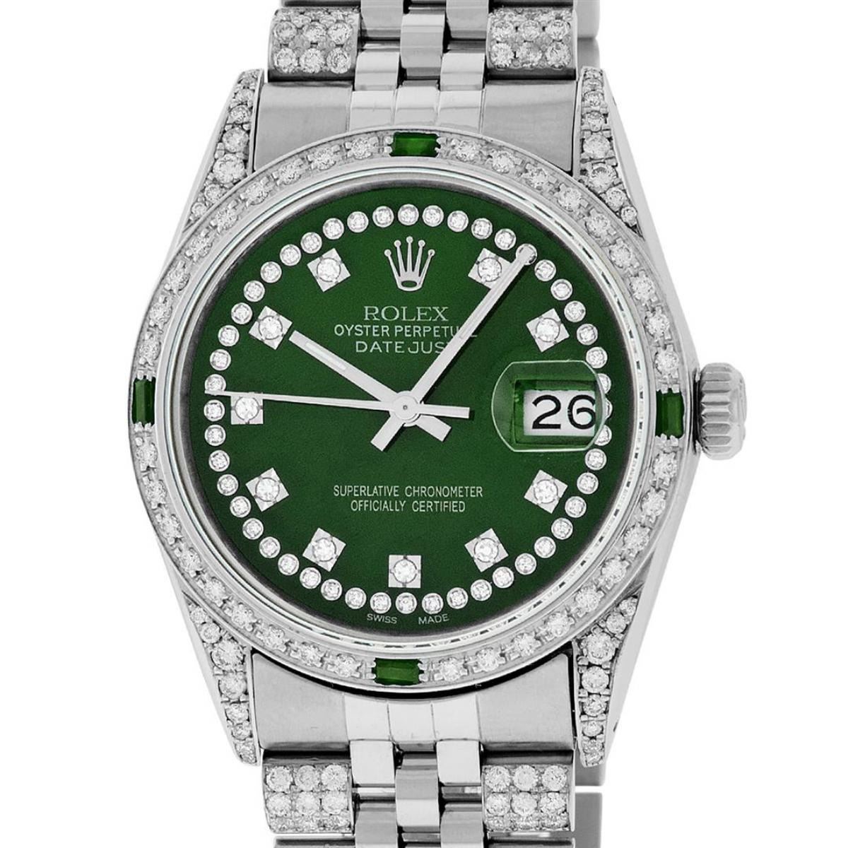 One Mens Pre Owned Rolex Datejust Polished Bright with Satin Finish, Serviced & Electronically Tested, Rolex Stainless Steel Case: 36mm, Custom Diamond Lugs: 28 Diamonds On Lugs, Color: G to H, Clarity: SI-VS. Stainless Steel Crown, Custom Bezel: New 18K
