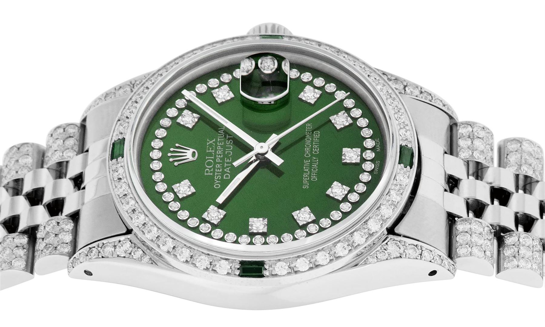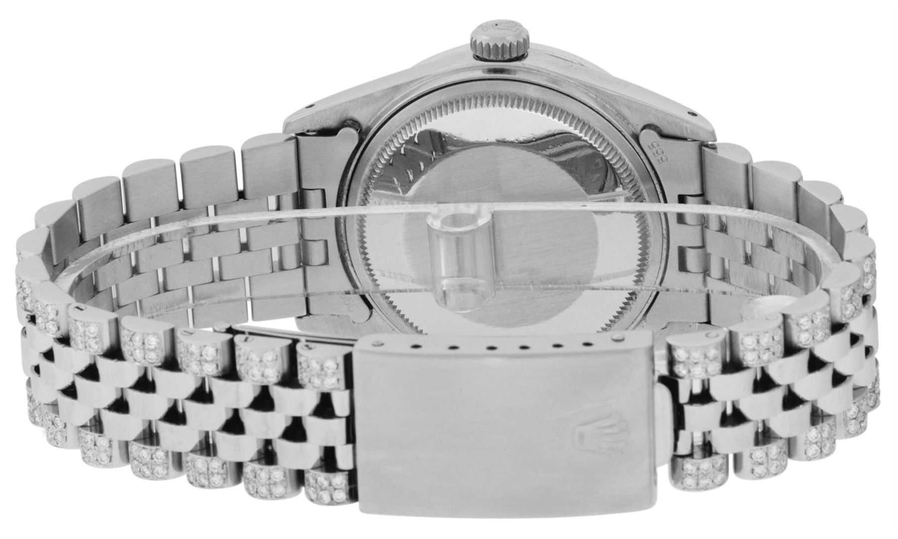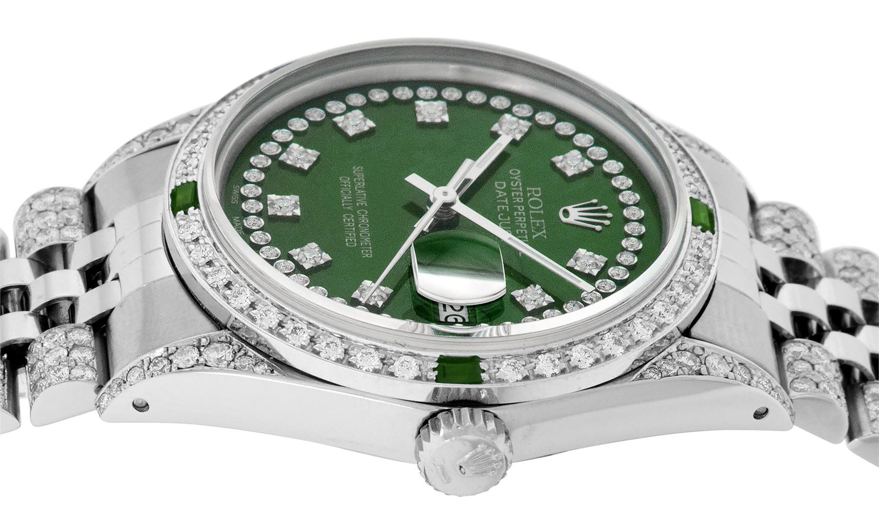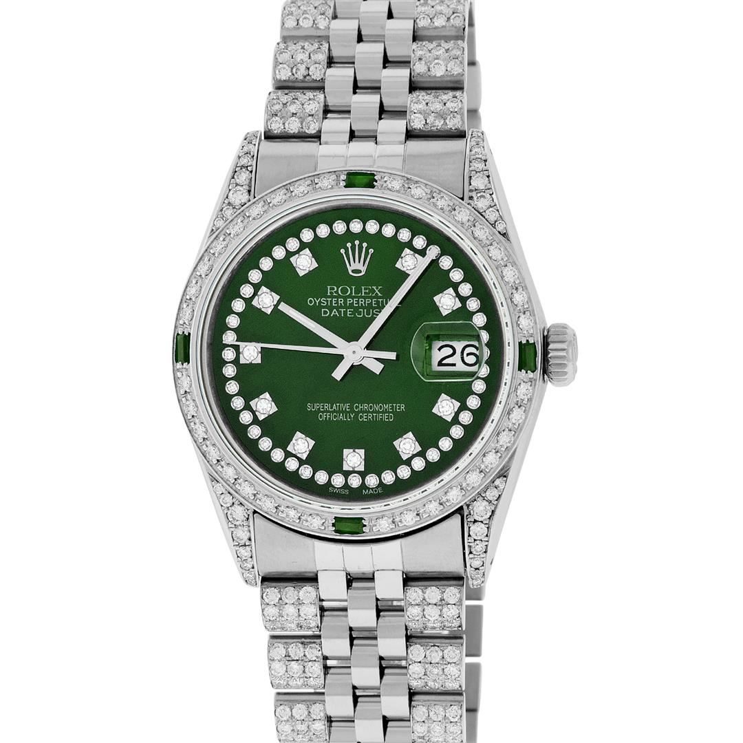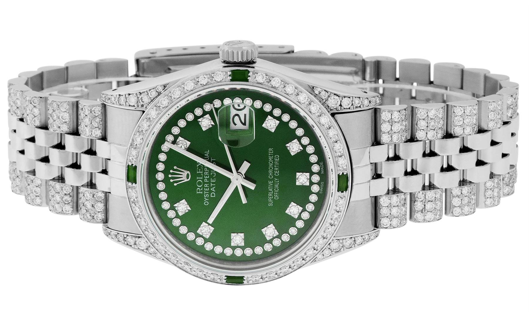 One Mens Pre Owned Rolex Datejust Polished Bright with Satin Finish, Serviced & Electronically Tested, Rolex Stainless Steel Case: 36mm, Custom Diamond Lugs: 28 Diamonds On Lugs, Color: G to H, Clarity: SI-VS. Stainless Steel Crown, Custom Bezel: New 18K