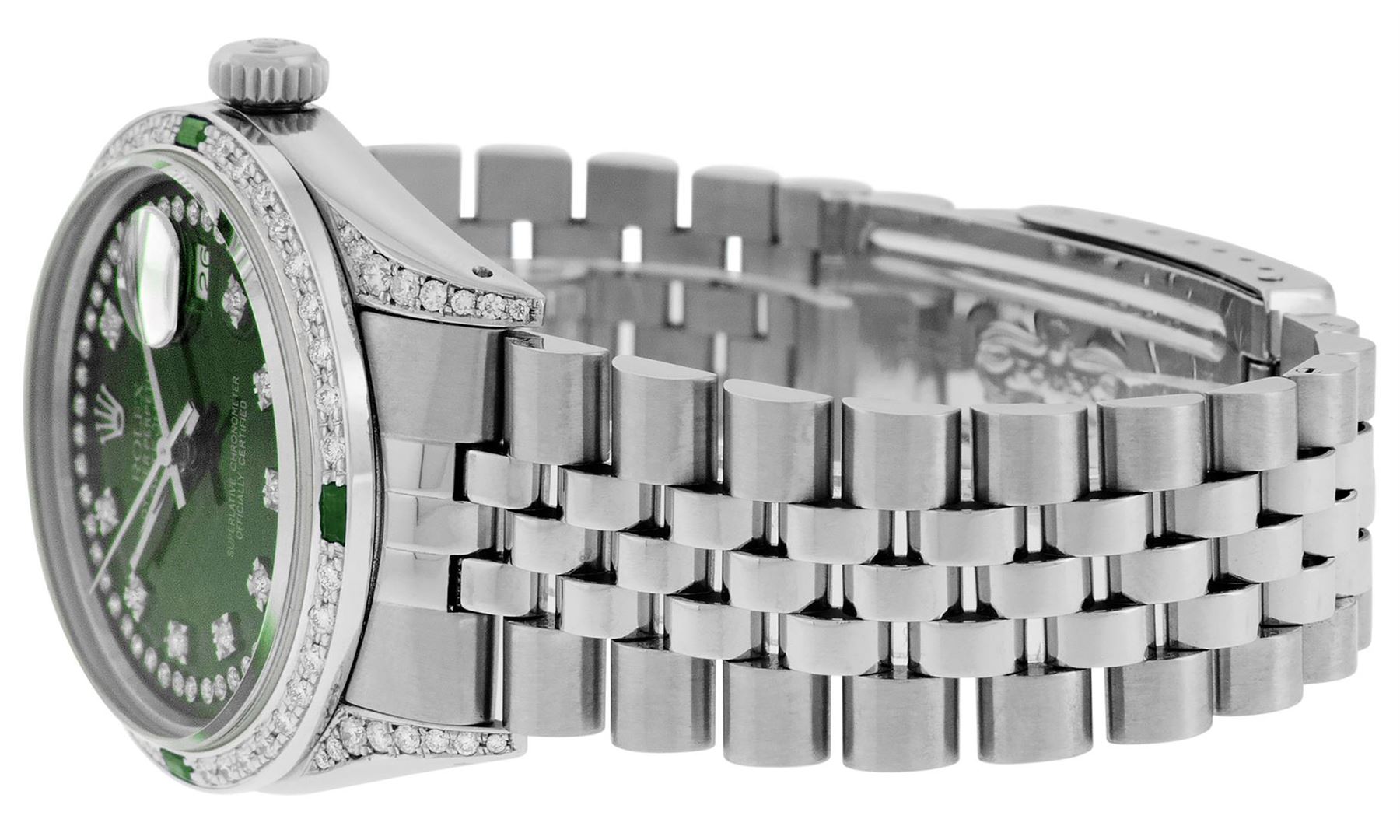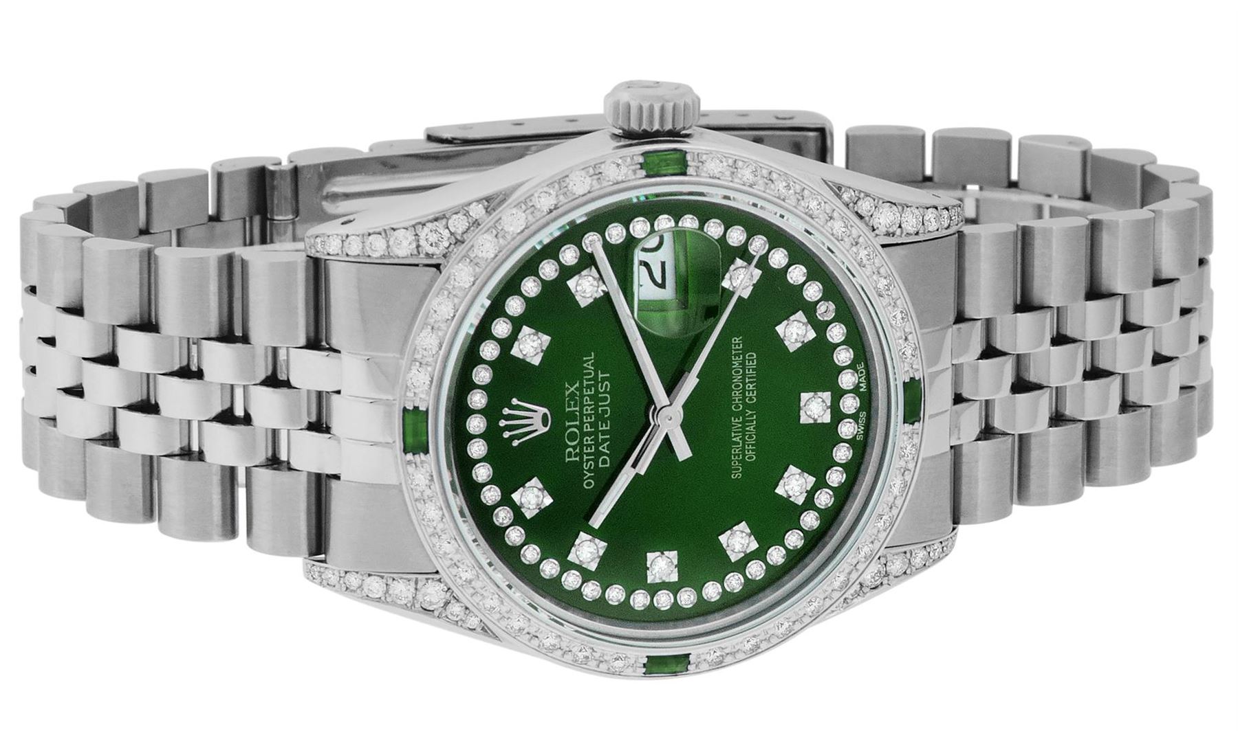 One Mens Pre Owned Rolex Datejust Polished Bright with Satin Finish, Serviced & Electronically Tested, Rolex Stainless Steel Case: 36mm, Custom Diamond Lugs: 28 Diamonds On Lugs, Color: G to H, Clarity: SI-VS. Rolex Stainless Steel Crown, Custom Bezel: 18K White Gold Diamond + Emerald Bead set, Diamond Count: 36 Diamonds + 4 Emeralds, Clarity: SI-VS, Color: G to H. Custom Crystal: New Sapphire With Date Window. Custom Hands: New Luminescent Hands. Rolex Movement: Automatic Winding Movement. Custom Dial: Refinished Green With Custom Added Diamonds, Stone Count: 43 Diamonds On Dial, Diamond Color: G To H In Color, Clarity: VS. Date Window: 3 O'clock Position Date Display, Quickset, Model: Datejust Condition: G-6 Extra Fine. Rolex Bracelet: Stainless Steel Jubilee Band. Bright Polish & Satin Finish. 7.0 Inch Length, Adjustable. Standard Clasp, With Rolex Logo. This Watch Has Been Serviced And Polished And Its Free Of All Dents And Scratches.