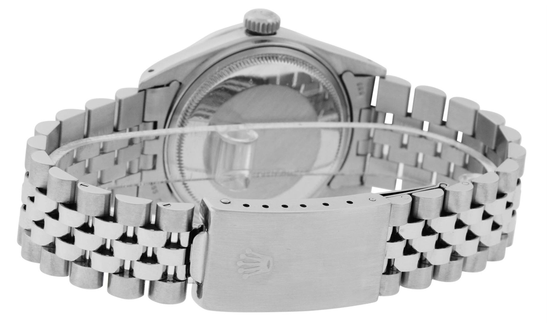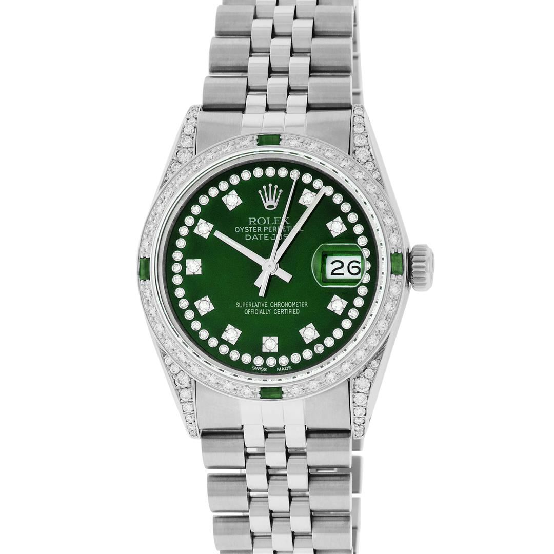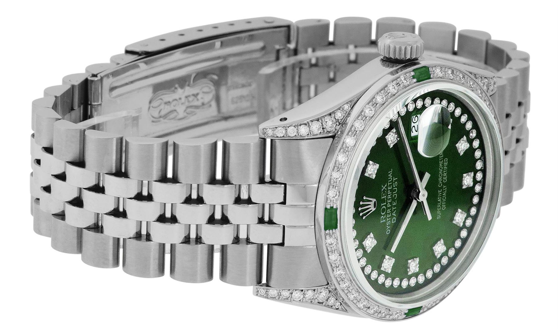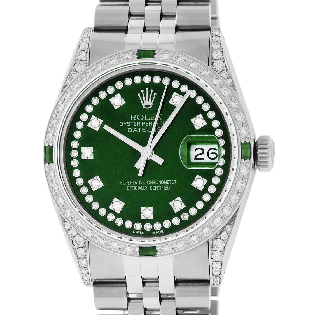 One Mens Pre Owned Rolex Datejust Polished Bright with Satin Finish, Serviced & Electronically Tested, Rolex Stainless Steel Case: 36mm, Custom Diamond Lugs: 28 Diamonds On Lugs, Color: G to H, Clarity: SI-VS. Rolex Stainless Steel Crown, Custom Bezel: 18K White Gold Diamond + Emerald Bead set, Diamond Count: 36 Diamonds + 4 Emeralds, Clarity: SI-VS, Color: G to H. Custom Crystal: New Sapphire With Date Window. Custom Hands: New Luminescent Hands. Rolex Movement: Automatic Winding Movement. Custom Dial: Refinished Green With Custom Added Diamonds, Stone Count: 43 Diamonds On Dial, Diamond Color: G To H In Color, Clarity: VS. Date Window: 3 O'clock Position Date Display, Quickset, Model: Datejust Condition: G-6 Extra Fine. Rolex Bracelet: Stainless Steel Jubilee Band. Bright Polish & Satin Finish. 7.0 Inch Length, Adjustable. Standard Clasp, With Rolex Logo. This Watch Has Been Serviced And Polished And Its Free Of All Dents And Scratches.