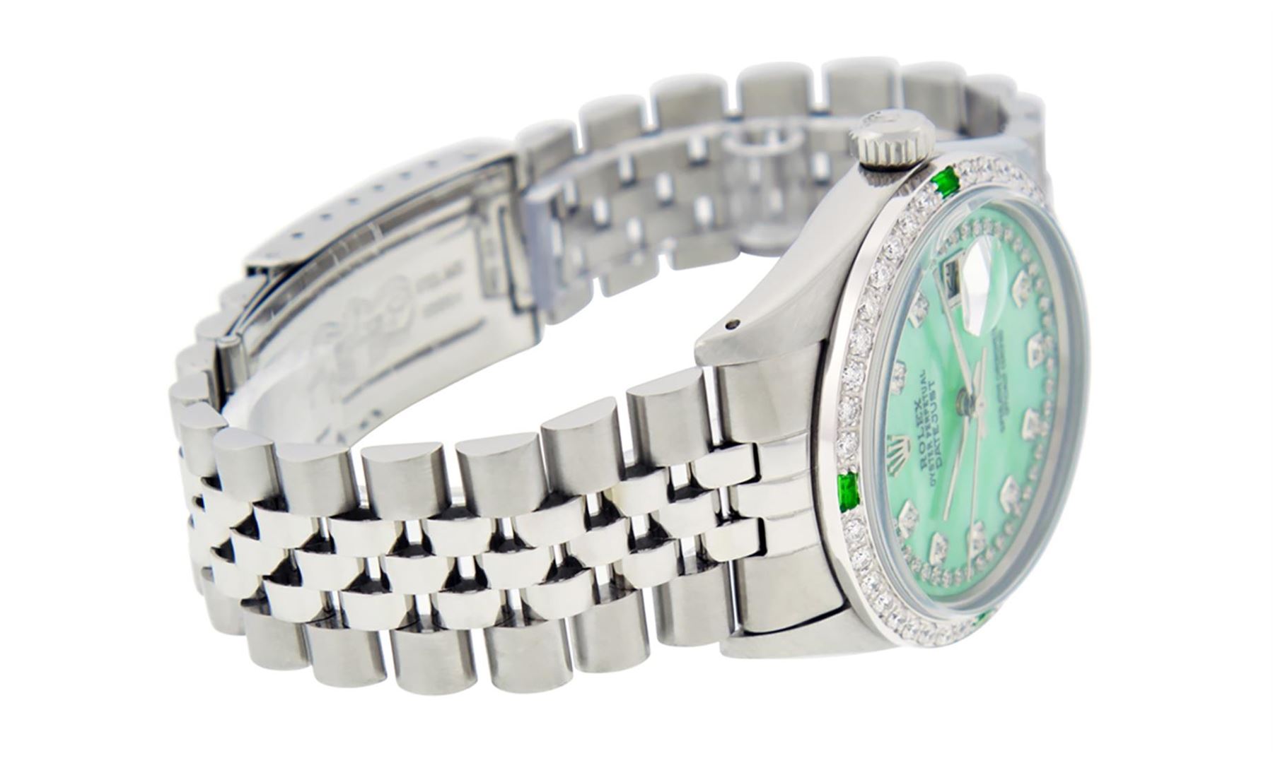 One Mens Stainless Steel Rolex Datejust Polished, Serviced & Electronically Tested, Stainless Steel Case: 36mm, Stainless Steel Crown, Custom Bezel: New 18K White Gold Emerald Beadset Diamond Bezel, Stone Count: 36 Diamonds + 4 Synthetic Emeralds. Total Weight 1.0 Carat, Clarity: SI-VS, Color: G to H. Custom Crystal: New Scratch Resistant Synthetic Sapphire Cyclops Lens. Custom Hands: New Luminescent Hands. Movement: Automatic Winding Movement. Custom Dial: Green Mother Of Pearl String Diamond Dial, Diamond Count: 58 Diamond In Dial G To H In Color, Clarity: VS2-SI1. Date Window: 3 O'Clock Position Date Display, Quickset, Model: Datejust. Condition: G-6 Extra Fine. Bracelet: Stainless Steel Jubilee Band. Bright Polish & Satin Finish. 7.0 Inch Length, Adjustable. Standard Clasp, With Rolex Logo. This Watch Has Been Serviced Time Tested And Is In Excellent Condition It Is Free Of All Scratches And Dents.