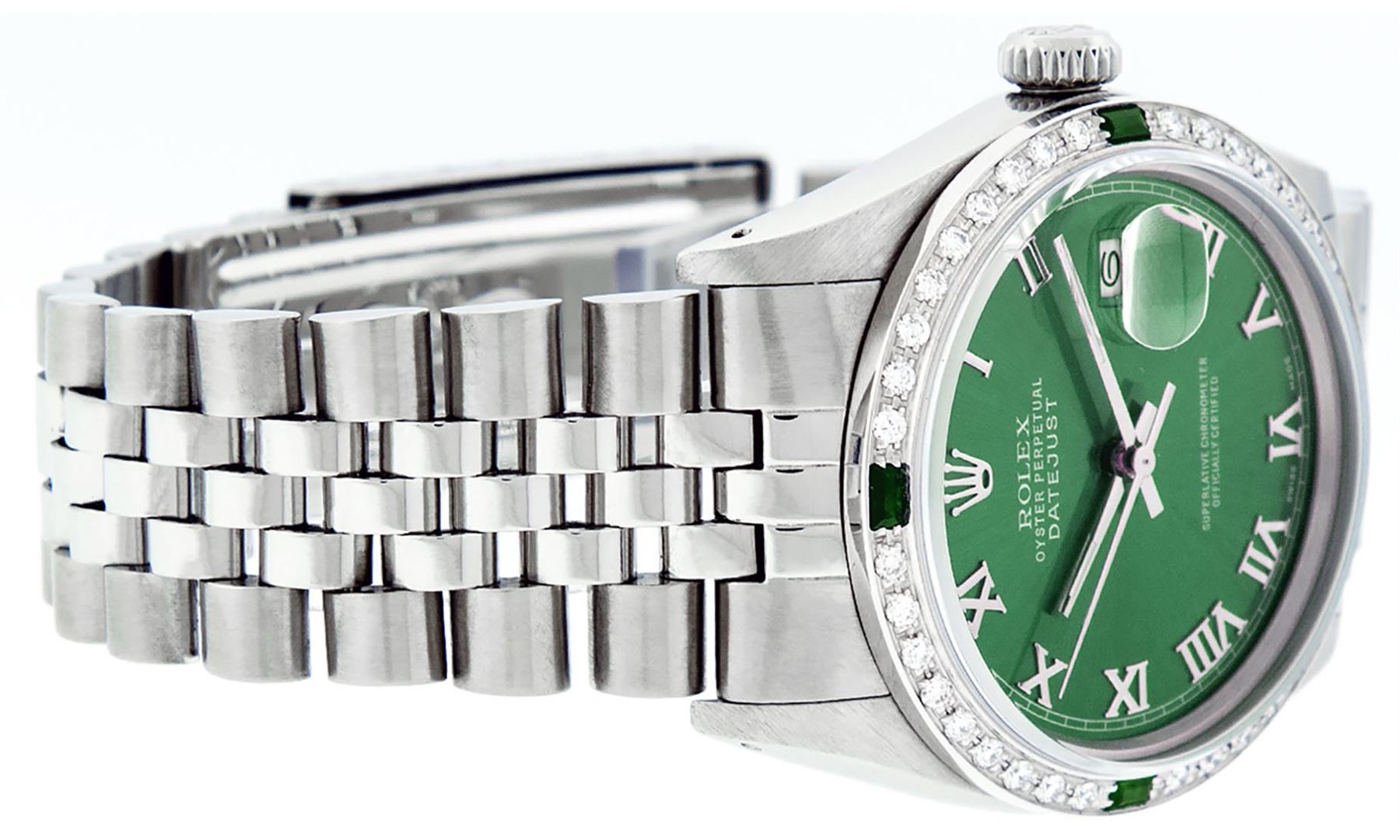 One Mens Pre Owned Stainless Steel Rolex Datejust Polished Bright with Satin Finish, This Watch Has Been Serviced & Electronically Tested, Rolex Stainless Steel Case: 36mm, Rolex Stainless Steel Crown, Custom Bezel: New 18K White Gold Emerald Bead set Dia