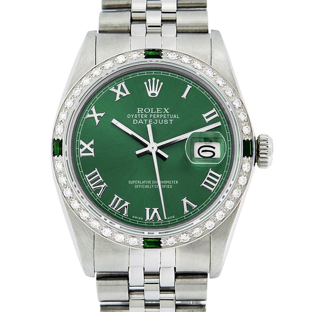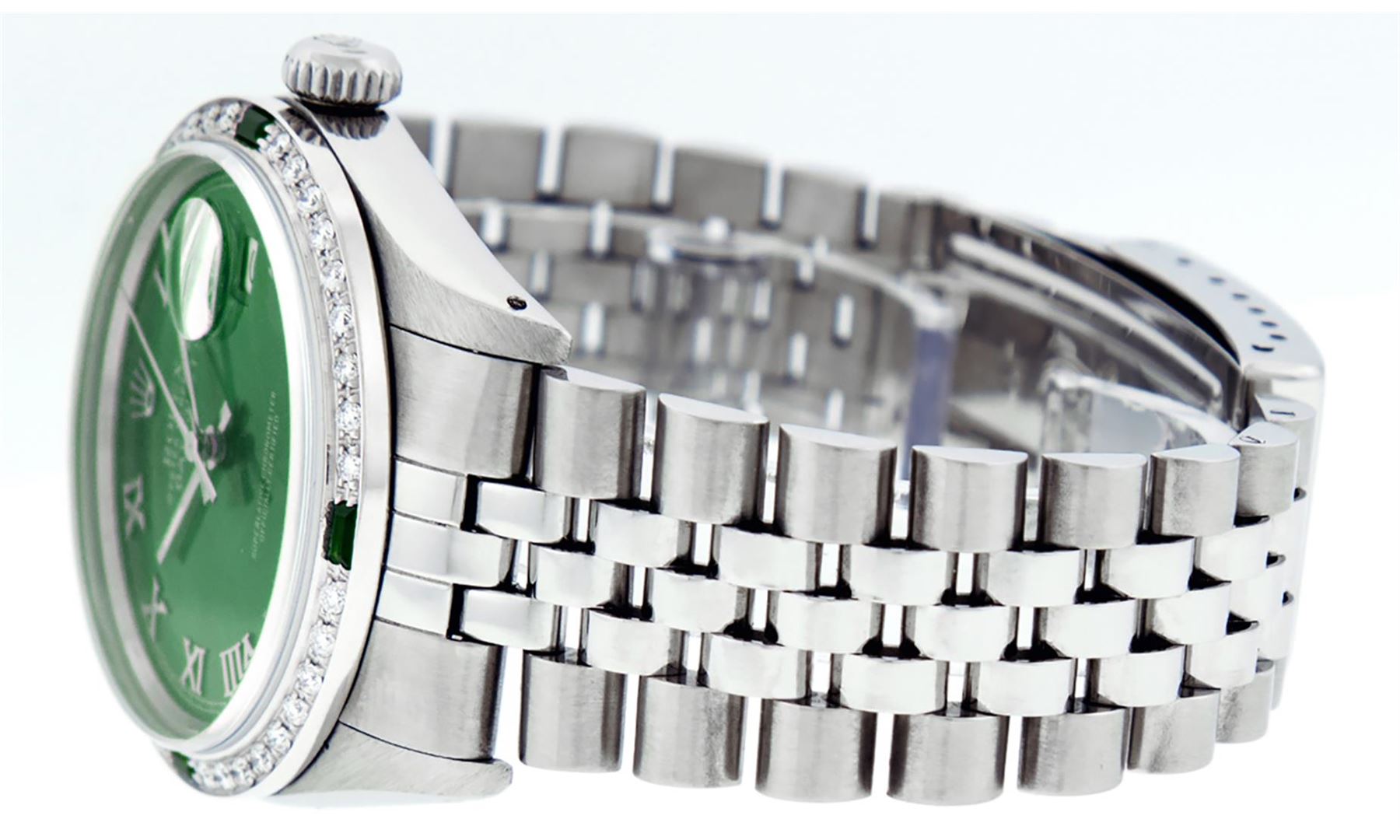 One Mens Pre Owned Stainless Steel Rolex Datejust Polished Bright with Satin Finish, This Watch Has Been Serviced & Electronically Tested, Rolex Stainless Steel Case: 36mm, Rolex Stainless Steel Crown, Custom Bezel: New 18K White Gold Emerald Bead set Dia