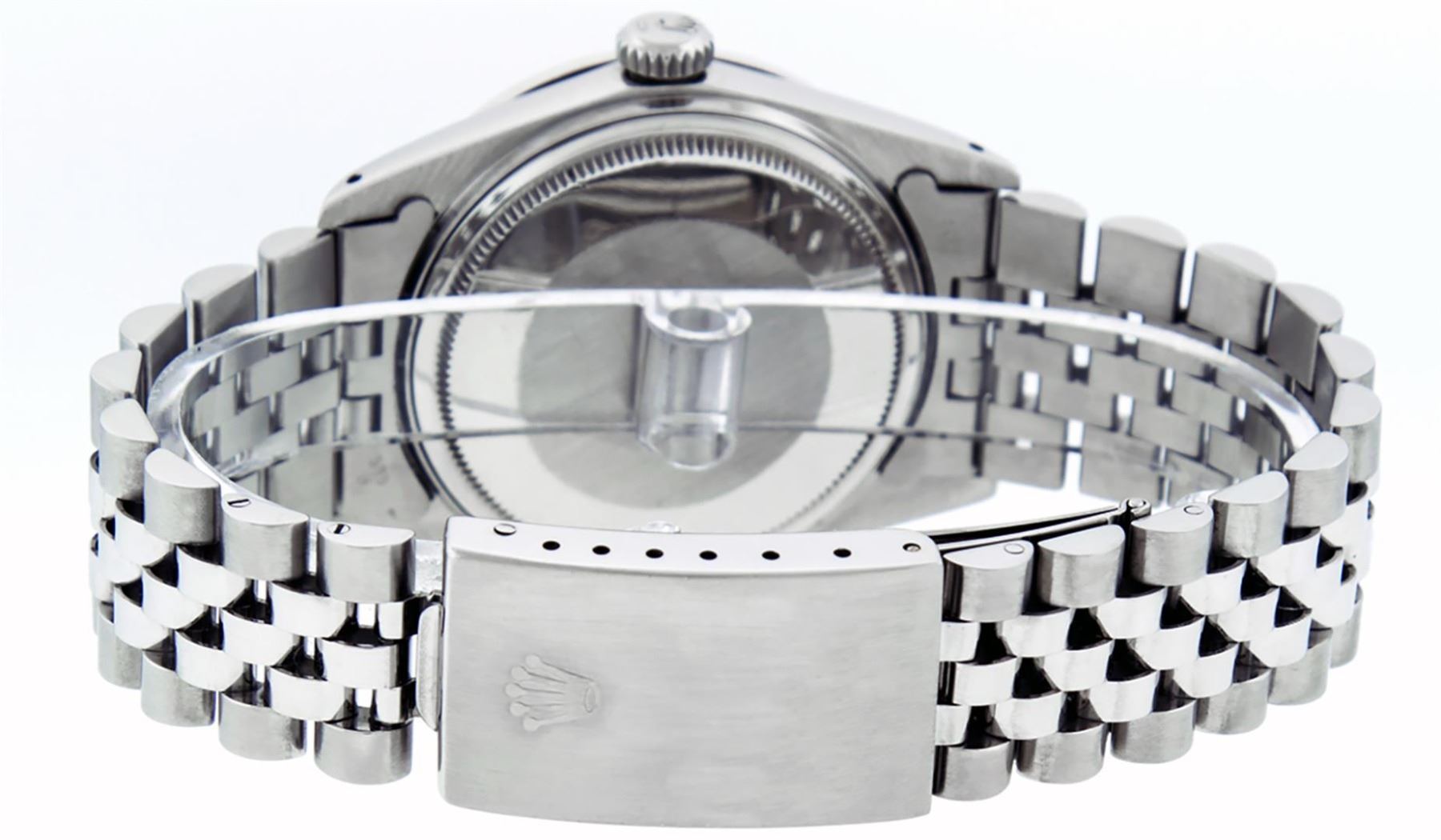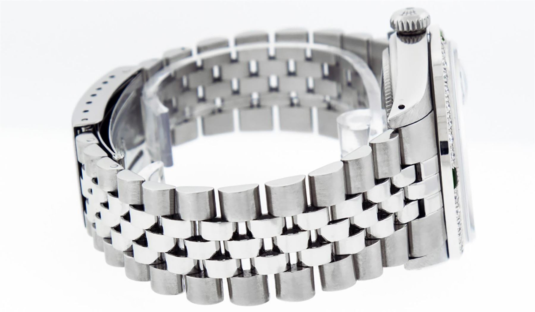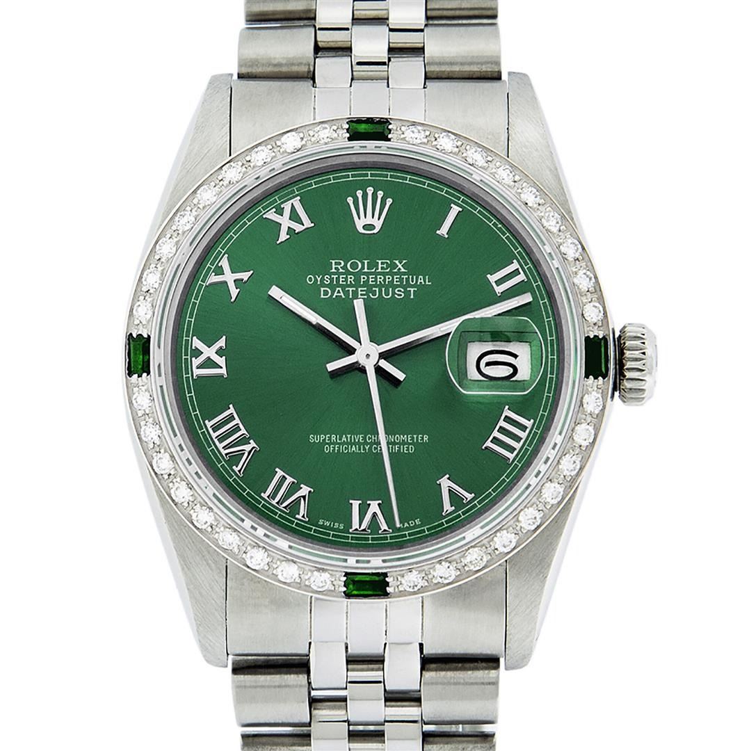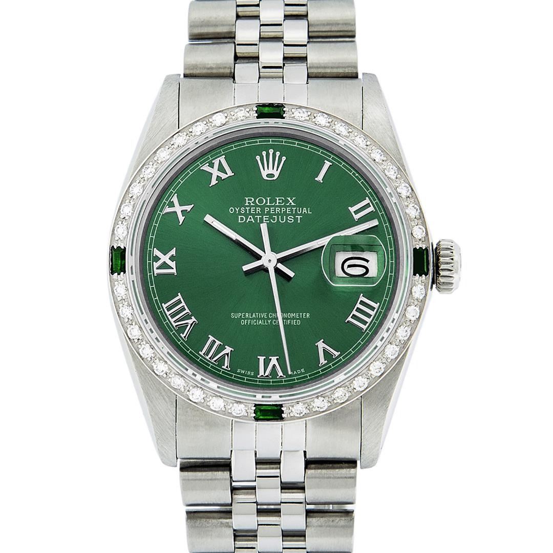 One Mens Pre Owned Stainless Steel Rolex Datejust Polished Bright with Satin Finish, This Watch Has Been Serviced & Electronically Tested, Rolex Stainless Steel Case: 36mm, Rolex Stainless Steel Crown, Custom Bezel: New 18K White Gold Emerald Bead set Diamond Bezel, Diamond + Gem Count: 36 Diamonds + 4 Emeralds, Clarity: SI-VS, Color: G to H. Custom Crystal: New Sapphire With Date Window. Custom Hands: New Luminescent Hands. Rolex Movement: Automatic Winding Movement. Custom Dial: Refinished Green With Roman Track & Square Track. Date Window: 3 O'clock Position Date Display, Quickset, Model: Datejust, Condition: G-6 Extra Fine. Rolex Bracelet: Stainless Steel Jubilee Band. Bracelet: 7.0 Inch Length, Adjustable. Standard Clasp, With Rolex Logo. This Watch Has Been Serviced Time Tested And Is In Excellent Condition It Is Free Of All Scratches And Dents.