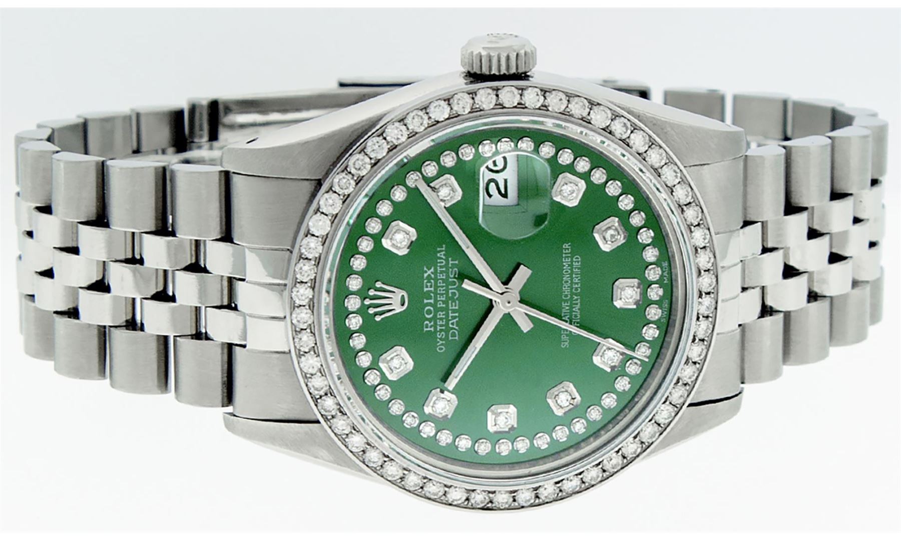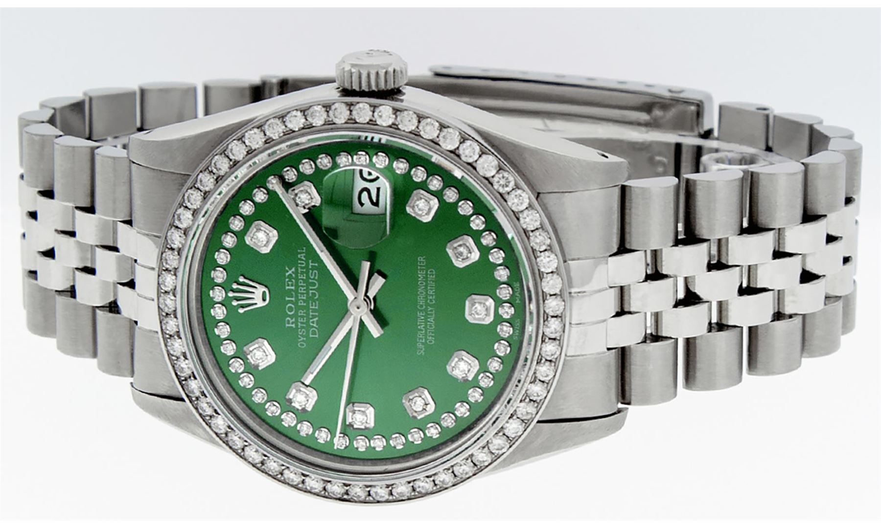 One Mens Rolex Stainless Steel Datejust Polished Bright with Satin Finish, This Watch Has Been Serviced & Electronically Tested, Stainless Steel Case: 36mm, Stainless Steel Crown, Custom Bezel: New Stainless Steel Bead Set Diamond Bezel, Diamond Count: 54 Diamonds. Custom Crystal: New Sapphire With Magnified Date Window. Custom Hands: New Luminescent Hands. Rolex Movement: Automatic Winding Movement 3035. Custom Dial: Custom Green Dial With Added Diamonds, Diamond Count: 58 Diamonds On Dial. Date Window: 3 O'clock Position Date Display, QuickSet, Model: Datejust. Condition: G-6 Extra Fine. Rolex Bracelet: Stainless Steel Jubilee Band. Bright Polish And Satin Finish. 7.0 Inch Length, Adjustable. Standard Clasp, With Rolex Logo. This Watch Has Been Serviced Time Tested And Is In Excellent Condition It Is Free Of All Scratches And Dents.