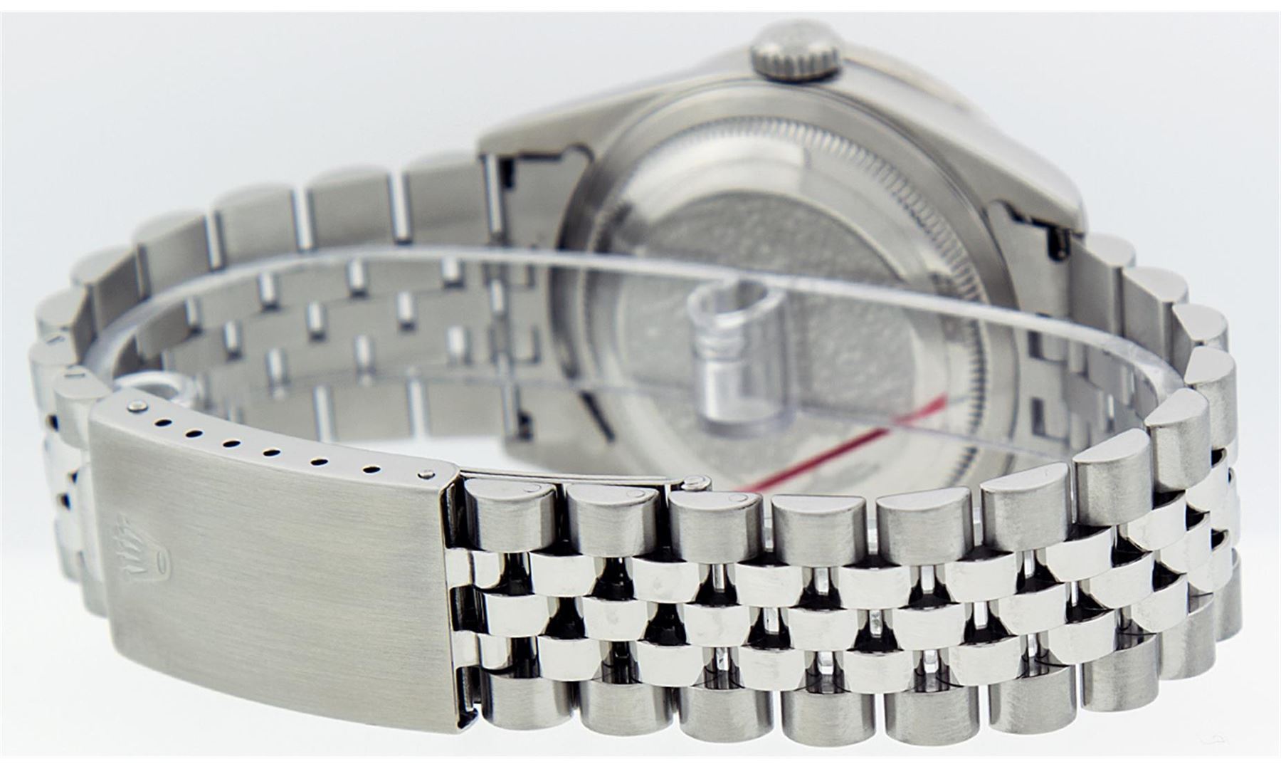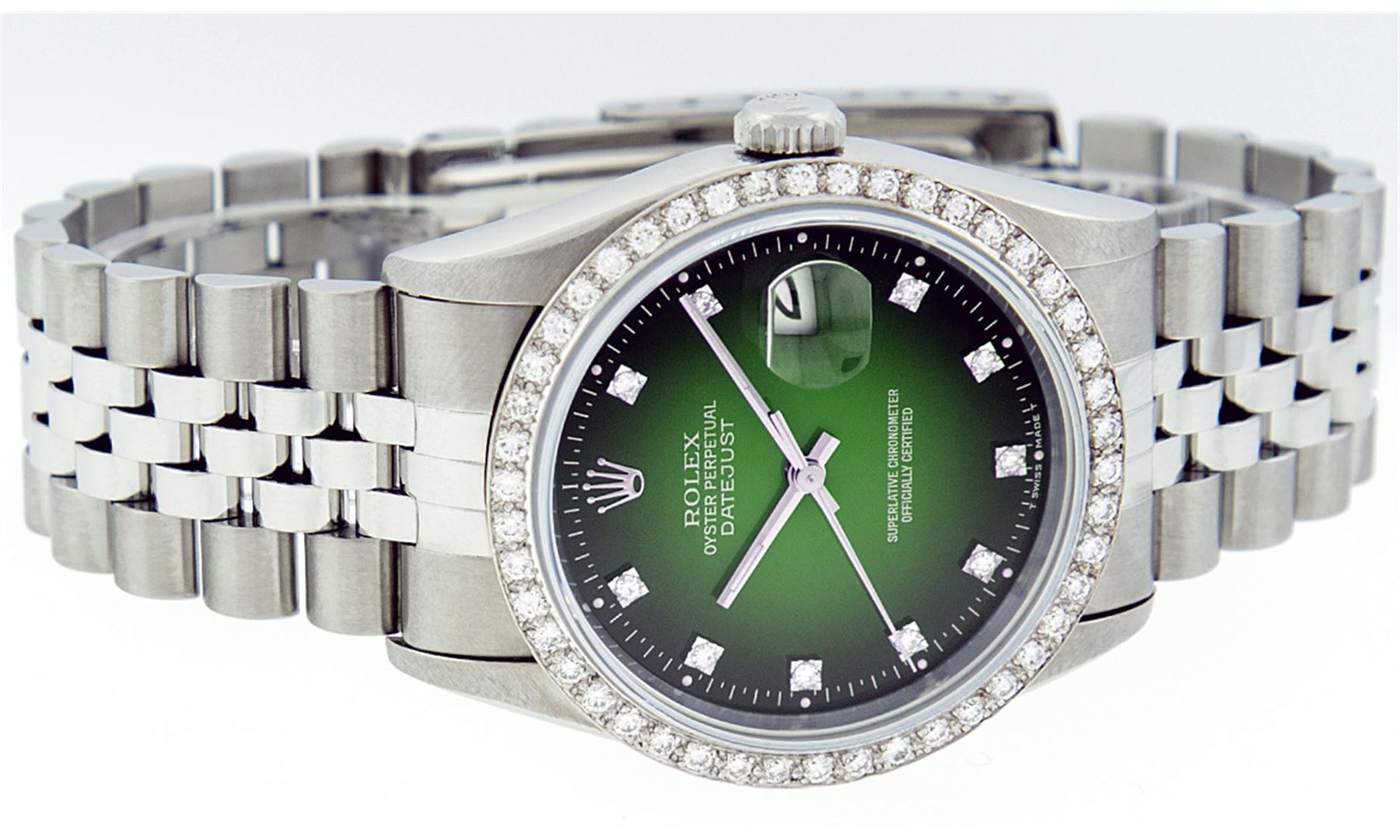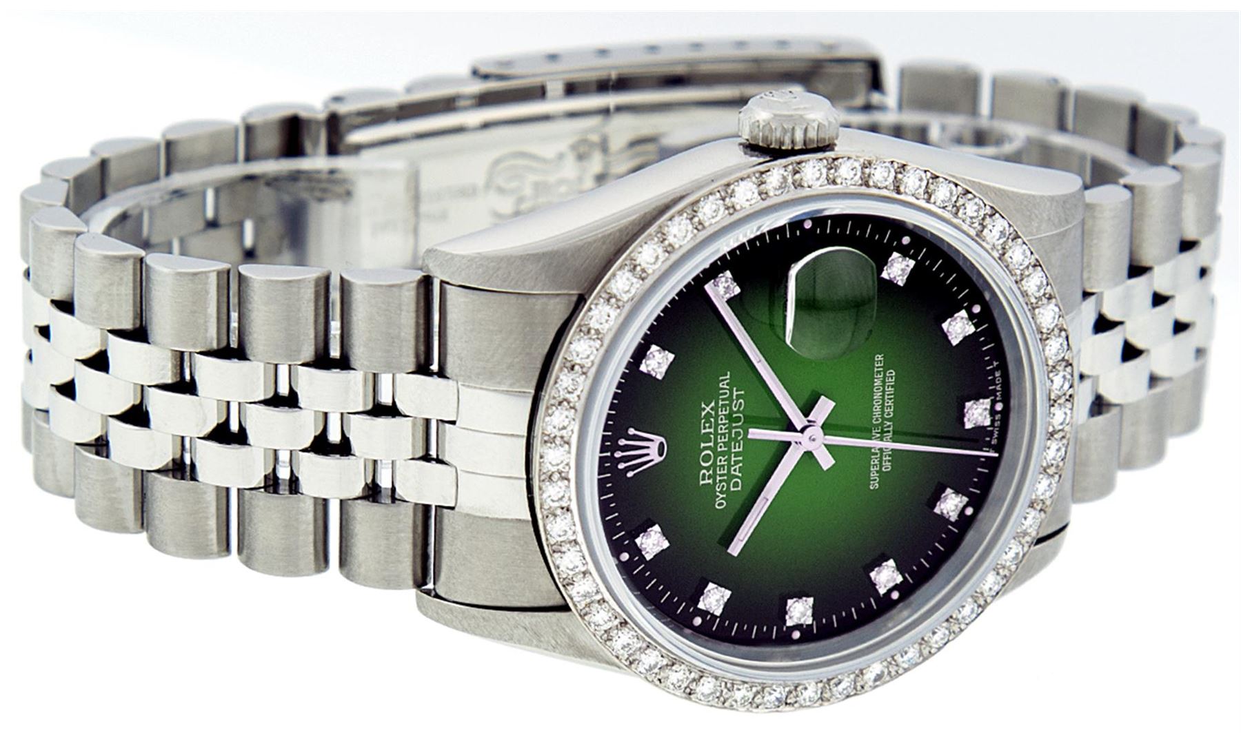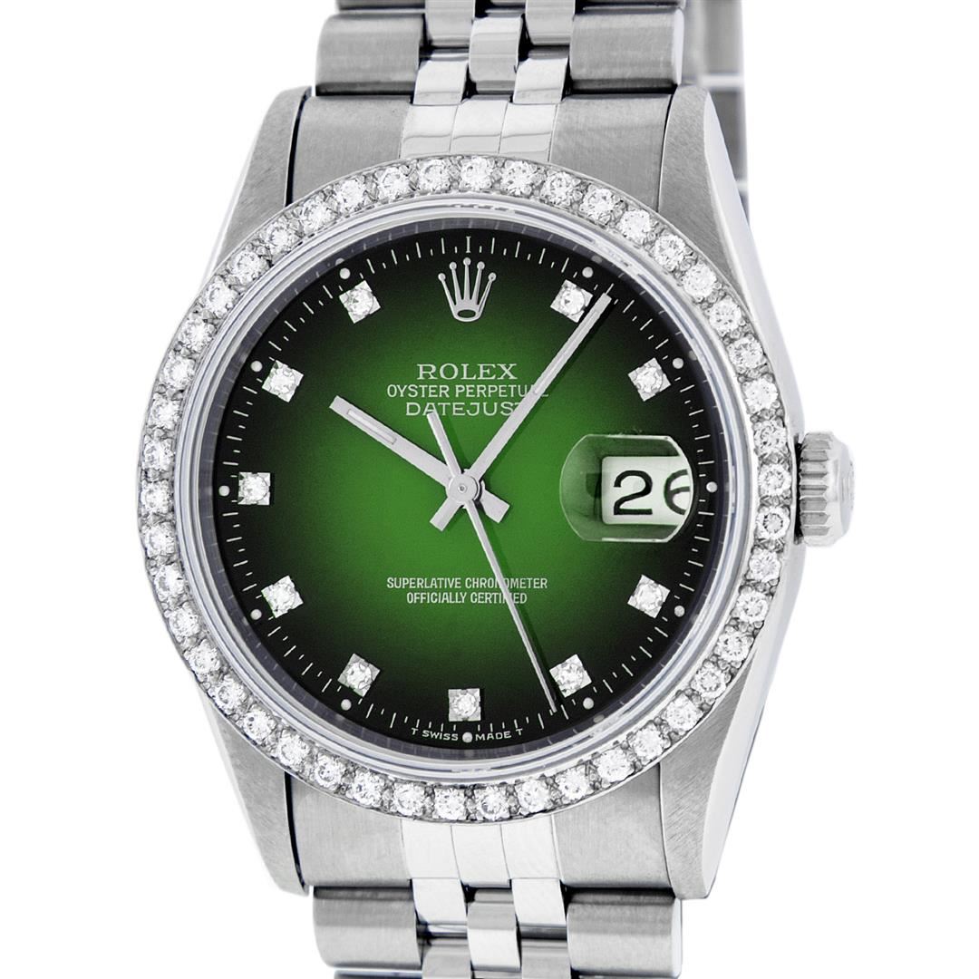 One Mens Pre Owned Stainless Steel Rolex Datejust Polished, Serviced & Electronically Tested, Stainless Steel Case: 36mm, Stainless Steel Crown, Custom Bezel: New 18K White Gold Beadset Diamond Bezel, Diamond Count: 44 Diamonds In Bezel, Total Weight 1.40 Carat. Custom Crystal: New Sapphire With Magnified Date Window. Custom Hands: New Luminescent Hands. Rolex Movement: Automatic Winding Movement. Custom Dial: Green Vignette With Custom Added Diamond Hour Markers, Diamond Count: 10 Diamonds in Dial. Date Window: 3 O'Clock Position Date Display, Quickset, Model: Quickset Datejust. Condition: G-6 Extra Fine. Rolex Bracelet: Stainless Steel Jubilee Band. Bright Polish & Satin Finish. 7.0 Inch Length, Adjustable. Standard Clasp, With Rolex Logo. This Watch Has Been Serviced Time Tested And Is In Excellent Condition It Is Free Of All Scratches And Dents.
