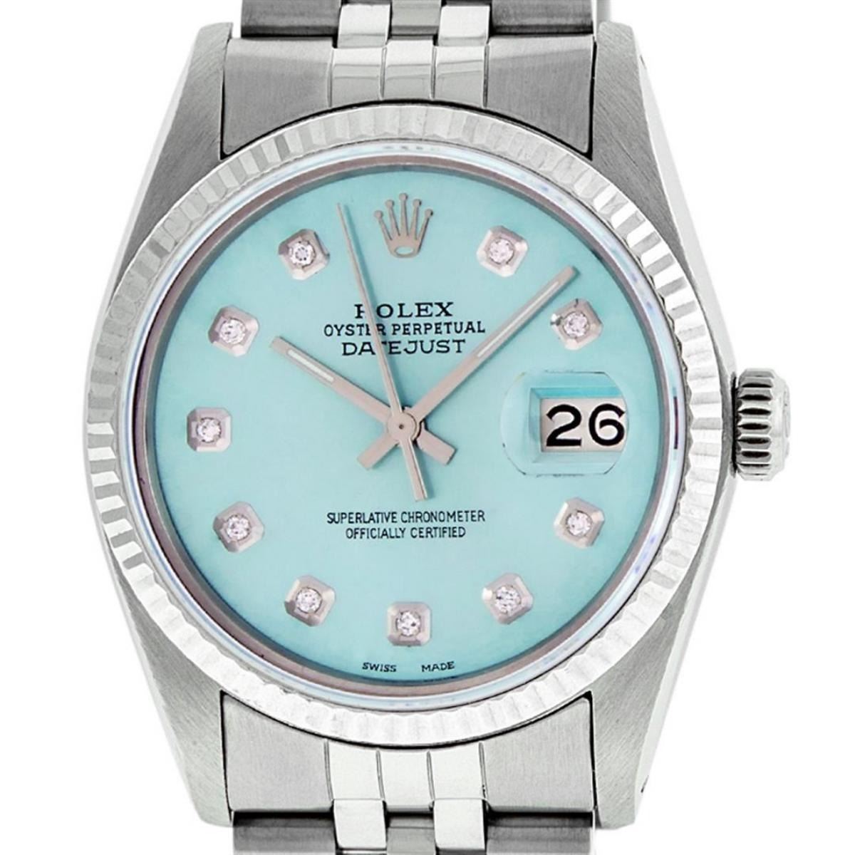 One Mens Stainless Steel Rolex Datejust Polished Bright with Satin Finish, This Watch Has Been Serviced & Electronically Tested, Stainless Steel Case: 36mm, Stainless Steel Crown, Bezel: 14K White Gold Fluted Bezel. Custom Crystal: New Acrylic Cyclops Lens. Custom Hands: New Luminescent Hands. Movement: Automatic Winding Movement. Custom Dial: Ice Blue Diamond Dial With Diamond Hour Markers, Diamond Count: 10 Diamonds in Dial Color: G To H In Color, SI-VS Clarity. Date Window: 3 O'Clock Position Date Display, Quickset, Model: Datejust, Condition: G-6 Extra Fine. Bracelet: Stainless Steel Jubilee. Bright Polish & Satin Finish. 7.0 Inch Length, Adjustable. Standard Clasp, With Rolex Logo. This Watch Has Been Serviced Time Tested And Is In Excellent Condition It Is Free Of All Scratches And Dents.