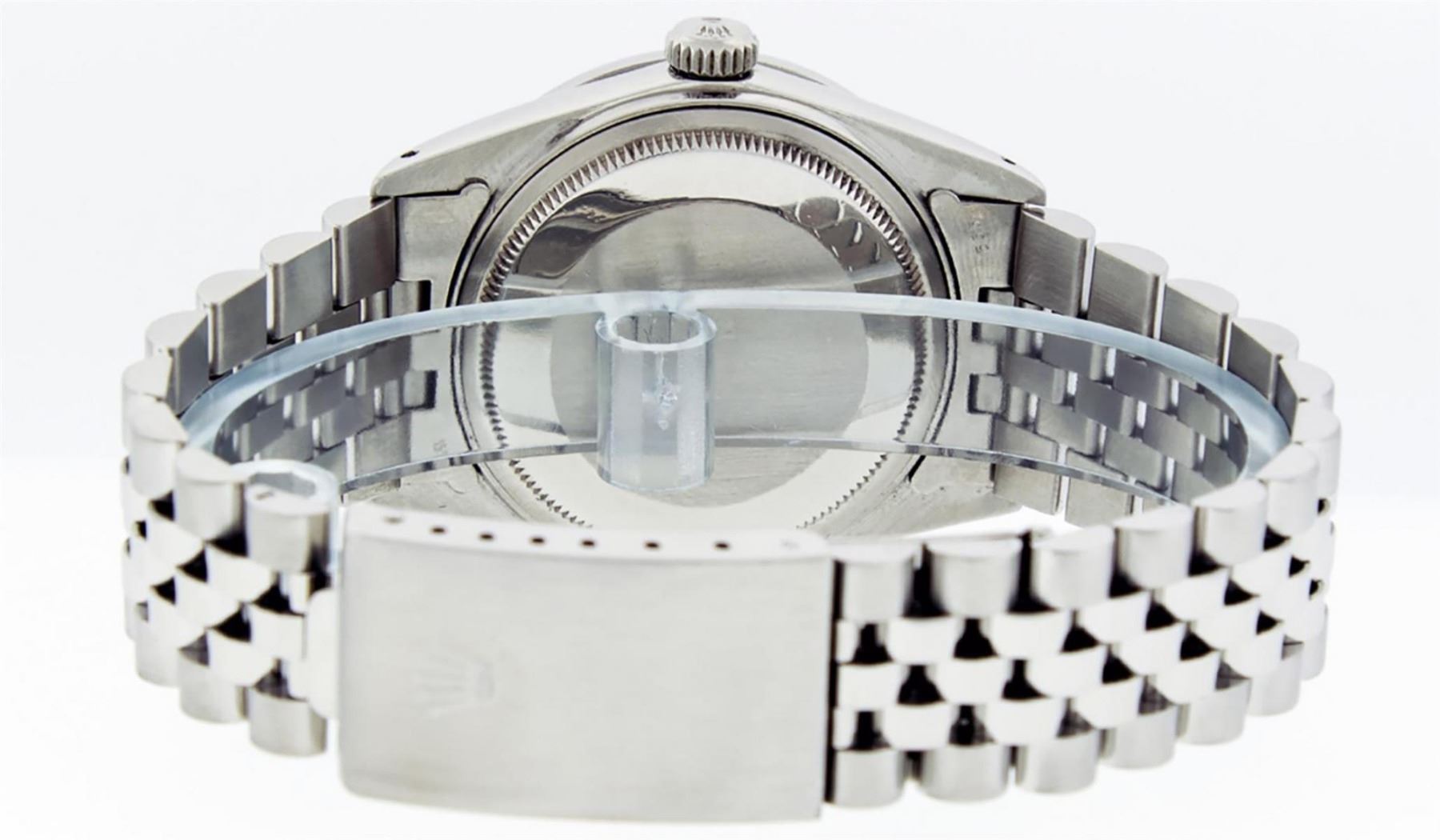 One Mens Stainless Steel Rolex Datejust Polished Bright with Satin Finish, This Watch Has Been Serviced & Electronically Tested, Stainless Steel Case: 36mm, Stainless Steel Crown, Bezel: 14K White Gold Fluted Bezel. Custom Crystal: New Acrylic Cyclops Lens. Custom Hands: New Luminescent Hands. Movement: Automatic Winding Movement. Custom Dial: Ice Blue Diamond Dial With Diamond Hour Markers, Diamond Count: 10 Diamonds in Dial Color: G To H In Color, SI-VS Clarity. Date Window: 3 O'Clock Position Date Display, Quickset, Model: Datejust, Condition: G-6 Extra Fine. Bracelet: Stainless Steel Jubilee. Bright Polish & Satin Finish. 7.0 Inch Length, Adjustable. Standard Clasp, With Rolex Logo. This Watch Has Been Serviced Time Tested And Is In Excellent Condition It Is Free Of All Scratches And Dents.