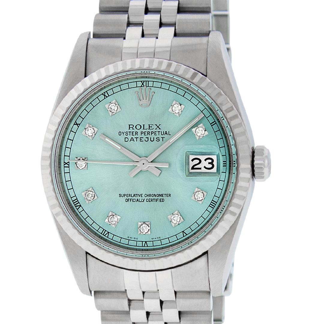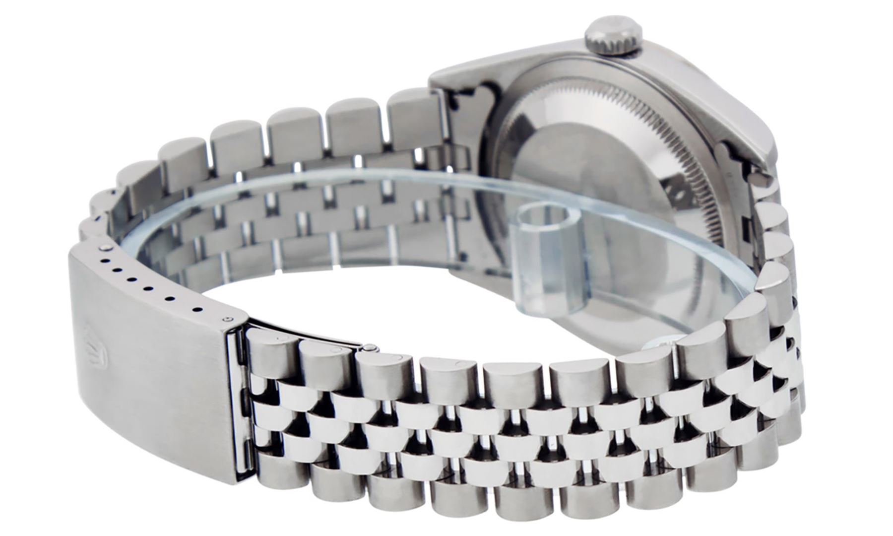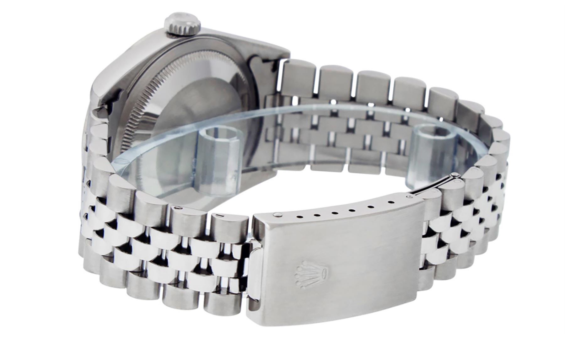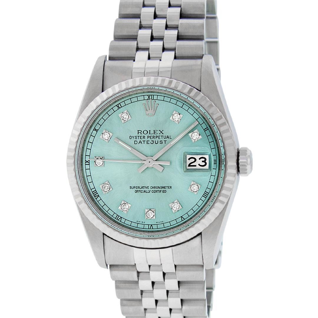 One Mens Pre Owned Stainless Steel Rolex Datejust Polished Bright with Satin Finish, This Watch Has Been Serviced & Electronically Tested, Stainless Steel Case: 36mm, Stainless Steel Crown, Original Bezel: 14K White Gold Fluted Bezel. Custom Crystal: New Sapphire With Magnified Date Window. Custom Hands: New Luminescent Hands. Rolex Movement: Automatic Winding Movement Caliber 3135. Custom Dial: Blue With Custom Added Diamond Hour Markers, Diamond Count: 10 Diamonds On Dial. Date Window: 3 O'Clock Position Date Display, Quickset, Model: Datejust, Condition: G-6 Extra Fine. Rolex Bracelet: Stainless Steel Jubilee Band. Bright Polish & Satin Finish. 7.0 Inch Length, Adjustable. Standard Clasp, With Rolex Logo. This Watch Has Been Serviced Time Tested And Is In Excellent Condition It Is Free Of All Scratches And Dents.