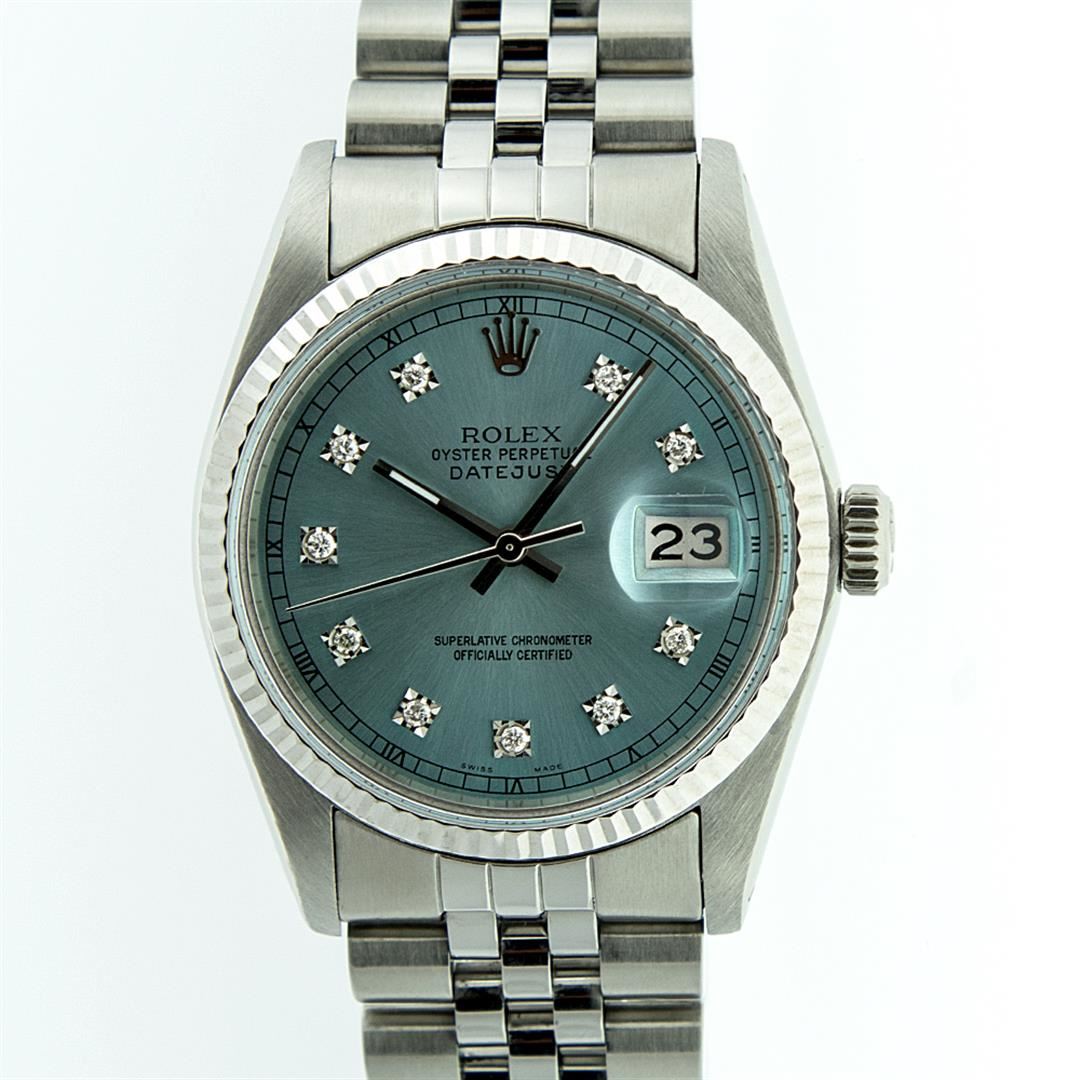 One Mens Stainless Steel Rolex Datejust Polished Bright with Satin Finish, This Watch Has Been Serviced & Electronically Tested, Stainless Steel Case: 36mm, Stainless Steel Crown, Bezel: 14K White Gold Fluted Bezel. Custom Crystal: New Acrylic Cyclops Lens. Custom Hands: New Luminescent Hands. Movement: Automatic Winding Movement. Custom Dial: Ice Blue Dial With Diamond Hour Markers and Roman Track, 10 Diamonds On Dial G To H In Color, SI-VS Clarity. Date Window: 3 O'Clock Position Date Display, Quickset, Model: Datejust, Condition: G-6 Extra Fine. Bracelet:Stainless Steel Jubilee. Bright Polish & Satin Finish. 7.0 Inch Length, Adjustable. Standard Clasp, With Rolex Logo. This Watch Has Been Serviced Time Tested And Is In Excellent Condition It Is Free Of All Scratches And Dents.
