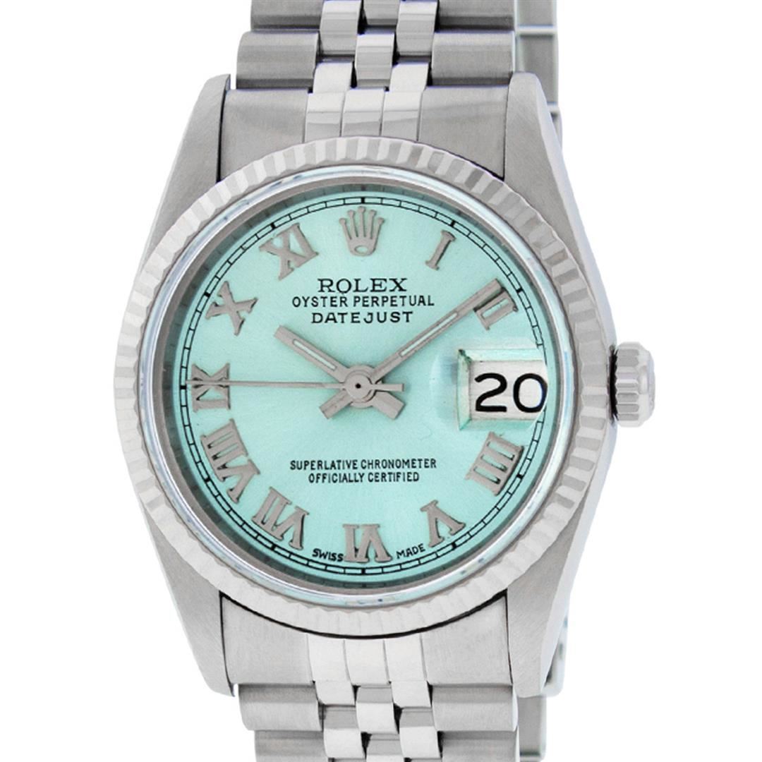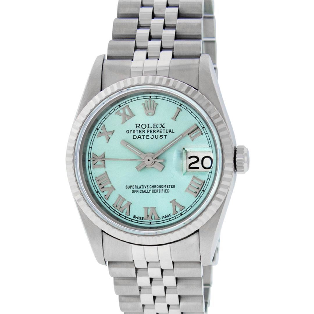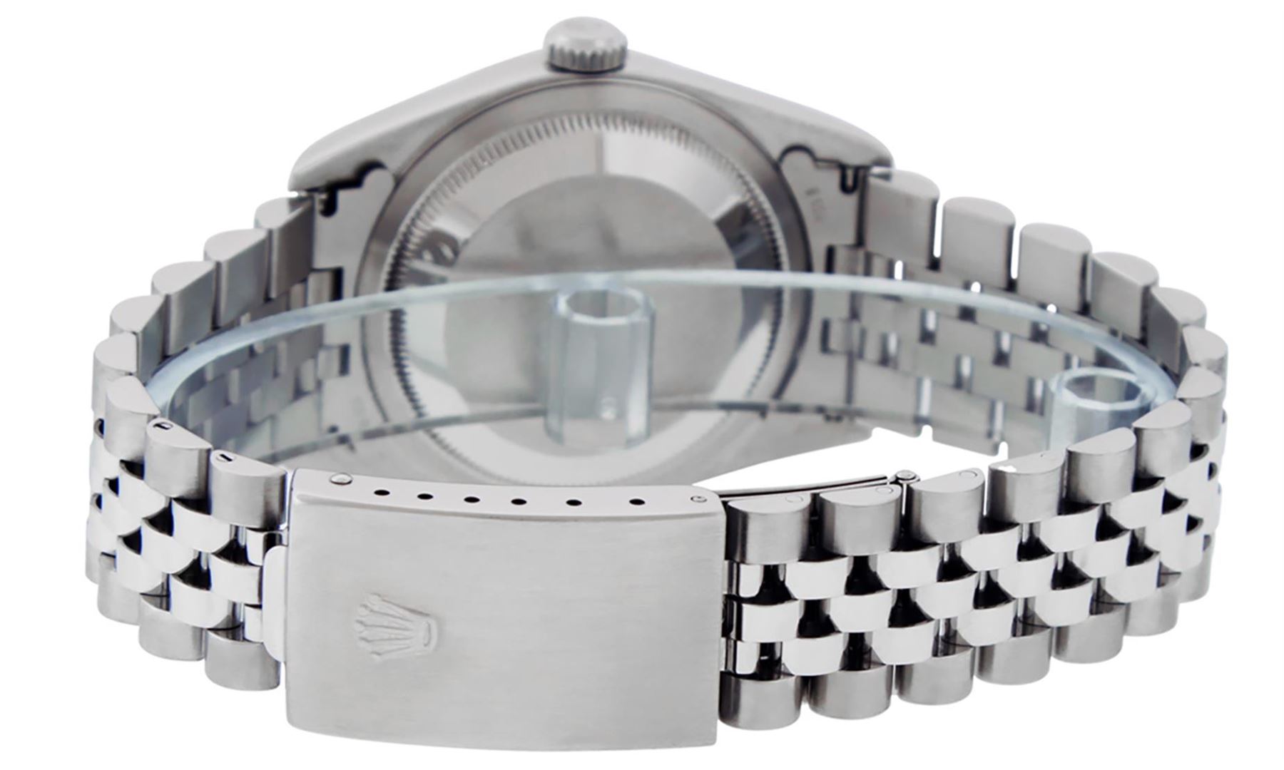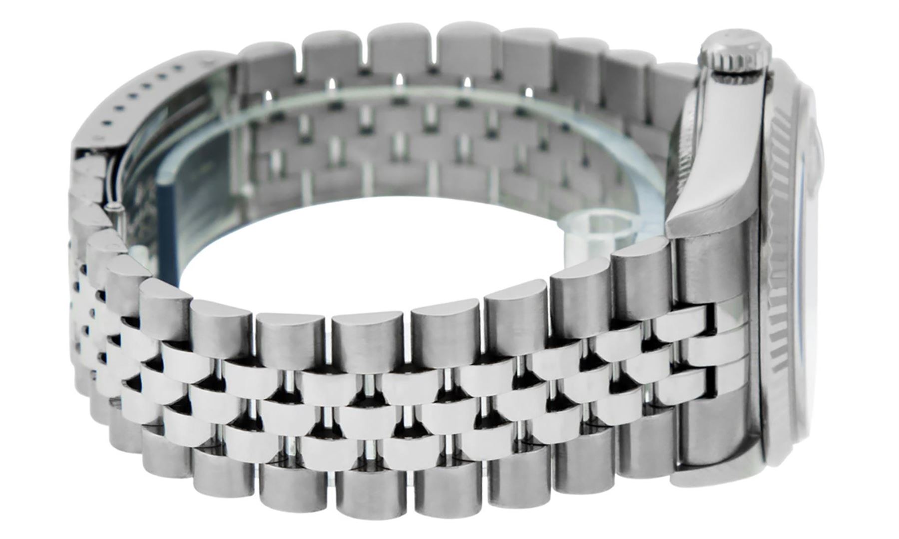 One Mens Pre Owned Stainless Steel Rolex Datejust Polished Bright with Satin Finish, This Watch Has Been Serviced & Electronically Tested, Stainless Steel Case: 36mm, Stainless Steel Crown, Original Bezel: 18K White Gold Fluted Bezel. Custom Crystal: New Sapphire With Magnified Date Window. Custom Hands: New Luminescent Hands. Rolex Movement: Automatic Winding Movement Caliber 3135. Custom Dial: Blue With Roman Hour Markers. Date Window: 3 O'Clock Position Date Display, Quickset, Model: Datejust, Condition: G-6 Extra Fine. Rolex Bracelet: Stainless Steel Jubilee Band. Bright Polish & Satin Finish. 7.0 Inch Length, Adjustable. Standard Clasp, With Rolex Logo. This Watch Has Been Serviced Time Tested And Is In Excellent Condition It Is Free Of All Scratches And Dents.