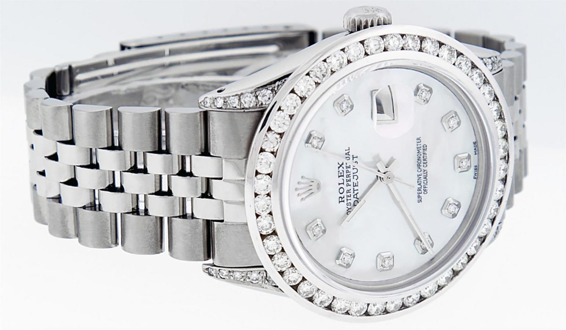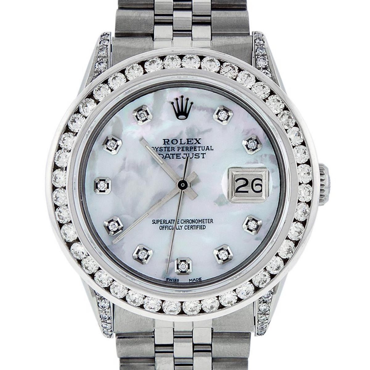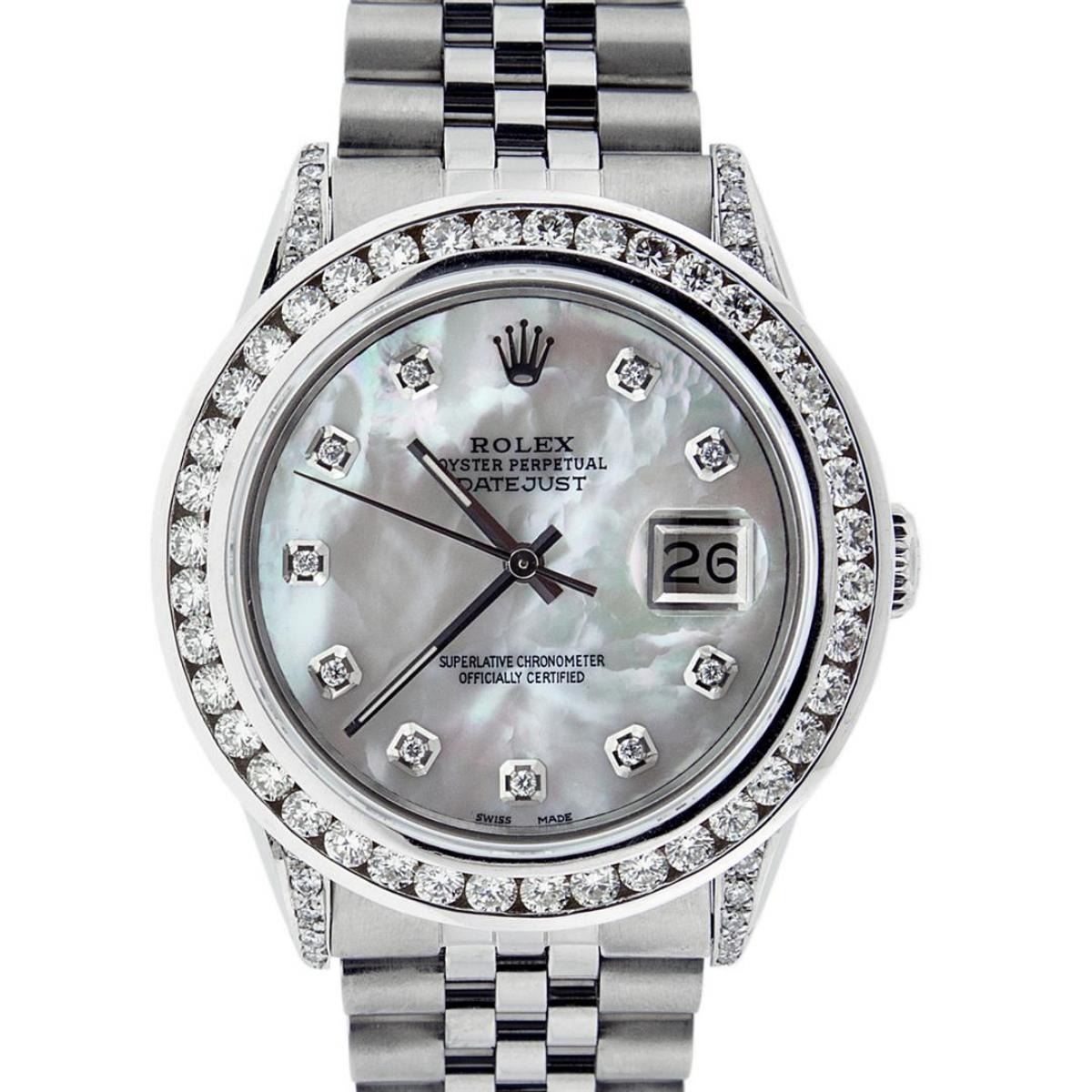 One Mens Stainless Steel Rolex Datejust Polished Bright with Satin Finish, Serviced & Electronically Tested, Stainless Steel Case: 36mm, Diamond Lugs: 24 Diamonds On Lugs, Color: G to H, Clarity: SI-VS. Stainless Steel Crown, New Custom Bezel: 18K White Gold 3.00 Ctw Diamond Bezel, Diamond Count: 40 Diamonds, Total Weight 3.0 Carat, Clarity: SI-VS, Color: G to H. Custom Crystal: New Scratch Resistant Synthetic Sapphire Cyclops Lens. Movement: Automatic Winding Movement. Custom Dial: Mother Of Pearl Diamond Dial, Diamond Count: 10 Diamonds In Dial. G To H In Color, Clarity: SI-VS. Date Window: 3 O'Clock Position Date Display, Quickset, Model: Quickset Datejust, Condition: G-6 Extra Fine. Bracelet: Stainless Steel Jubilee Band. Bright Polish & Satin Finish. 7.0 Inch Length, Adjustable. Standard Clasp, With Rolex Logo. This Watch Has Been Serviced Time Tested And Is In Excellent Condition It Is Free Of All Scratches And Dents. This Watch Also Comes With A Brand New Wooden Watch Winder.