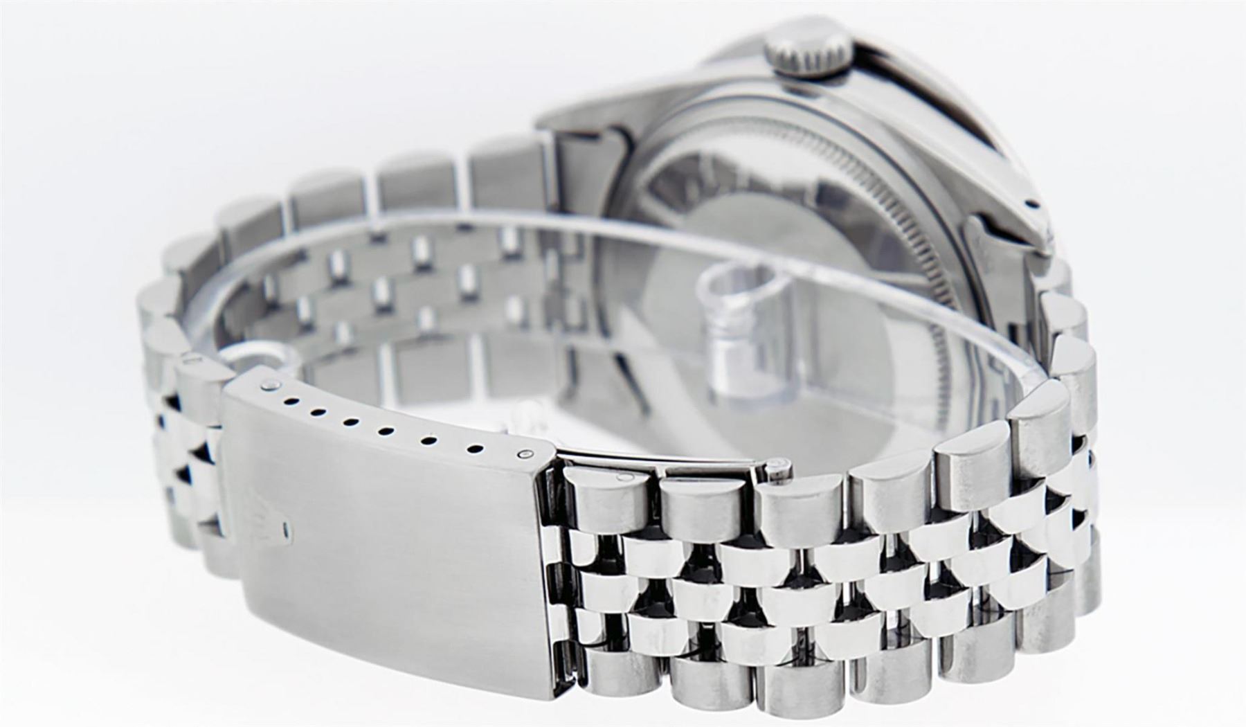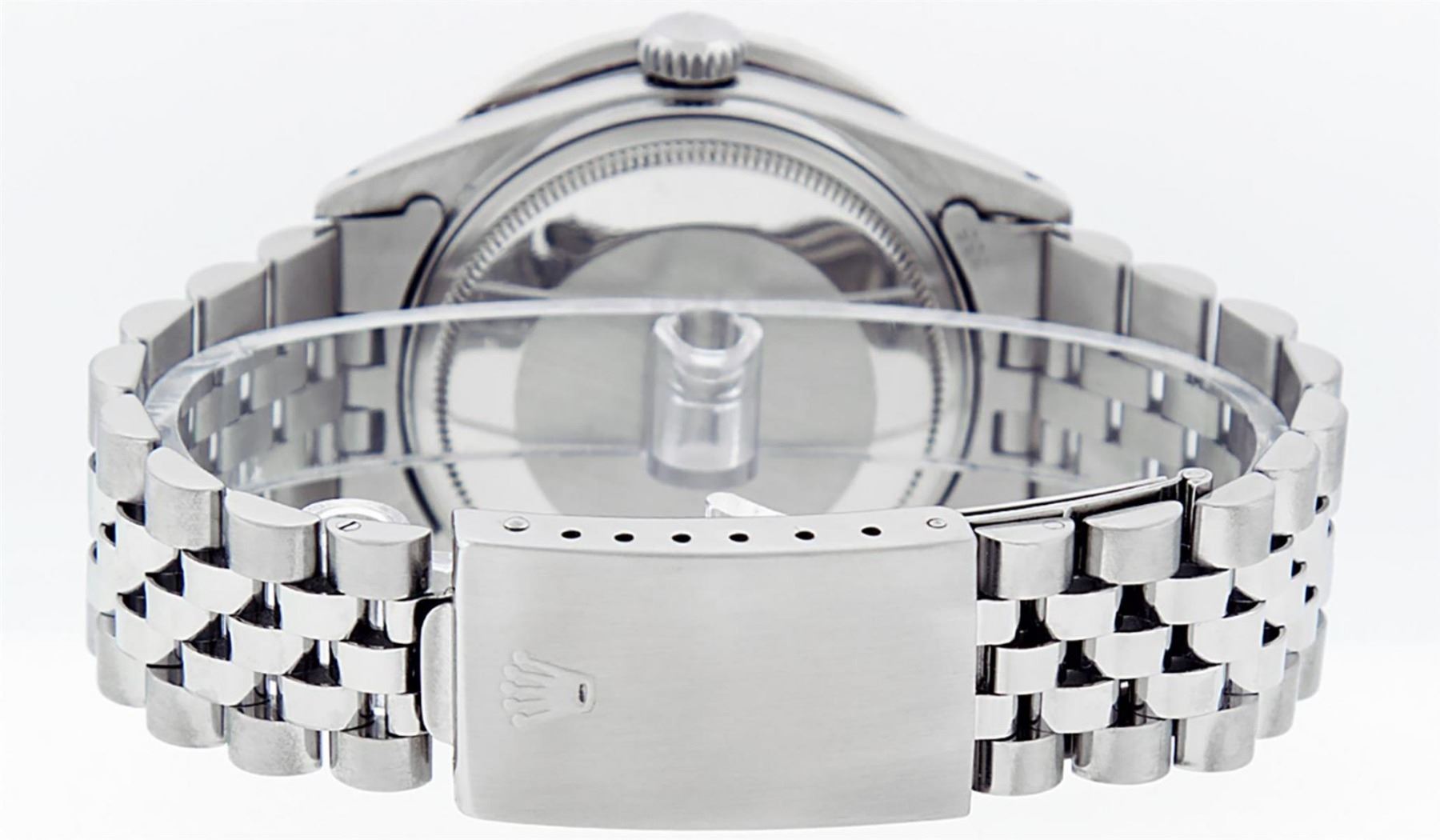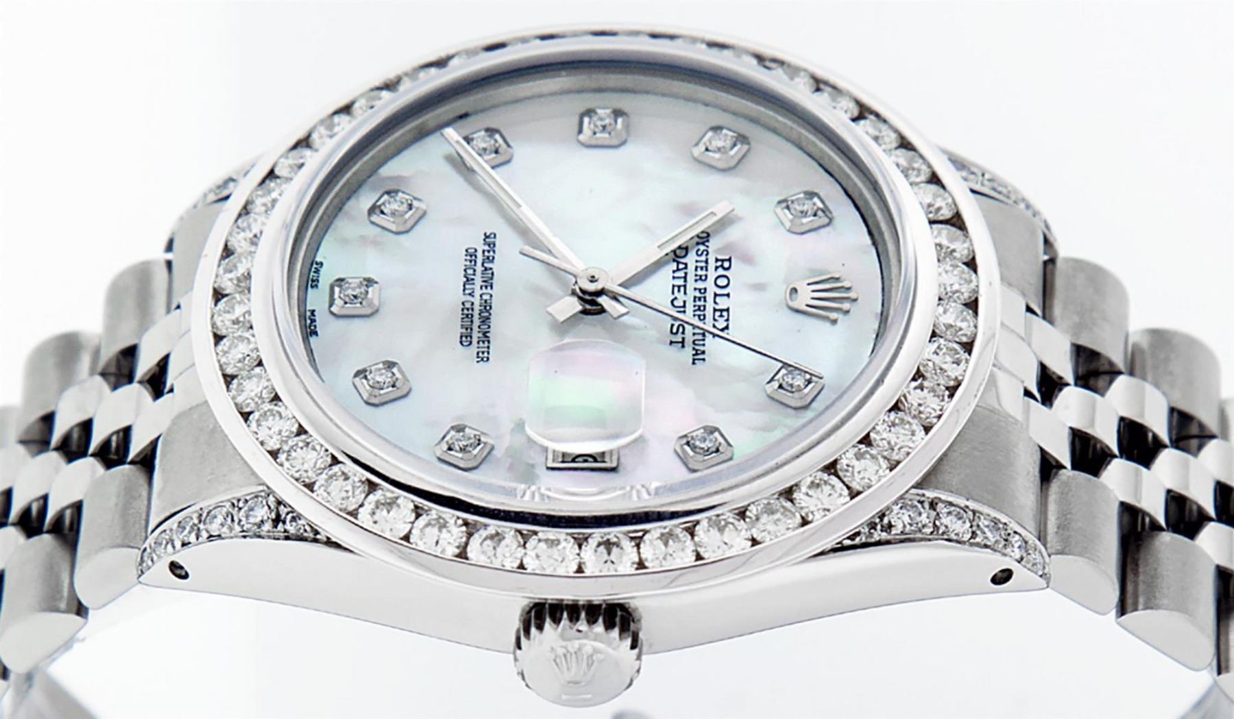 One Mens Stainless Steel Rolex Datejust Polished Bright with Satin Finish, Serviced & Electronically Tested, Stainless Steel Case: 36mm, Diamond Lugs: 24 Diamonds On Lugs, Color: G to H, Clarity: SI-VS. Stainless Steel Crown, New Custom Bezel: 18K White Gold 3.00 Ctw Diamond Bezel, Diamond Count: 40 Diamonds, Total Weight 3.0 Carat, Clarity: SI-VS, Color: G to H. Custom Crystal: New Scratch Resistant Synthetic Sapphire Cyclops Lens. Movement: Automatic Winding Movement. Custom Dial: Mother Of Pearl Diamond Dial, Diamond Count: 10 Diamonds In Dial. G To H In Color, Clarity: SI-VS. Date Window: 3 O'Clock Position Date Display, Quickset, Model: Quickset Datejust, Condition: G-6 Extra Fine. Bracelet: Stainless Steel Jubilee Band. Bright Polish & Satin Finish. 7.0 Inch Length, Adjustable. Standard Clasp, With Rolex Logo. This Watch Has Been Serviced Time Tested And Is In Excellent Condition It Is Free Of All Scratches And Dents. This Watch Also Comes With A Brand New Wooden Watch Winder.