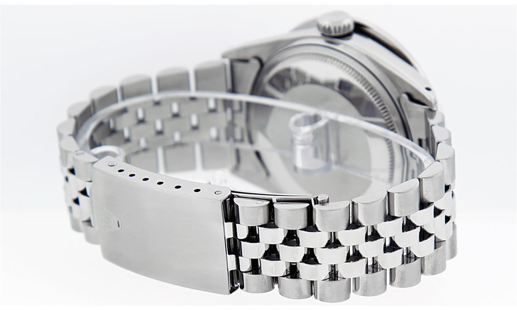 One Mens Stainless Steel Rolex Datejust Polished Bright with Satin Finish, Serviced & Electronically Tested, Stainless Steel Case: 36mm, Diamond Lugs: 24 Diamonds On Lugs, Color: G to H, Clarity: SI-VS. Stainless Steel Crown, New Custom Bezel: 18K White Gold 3.00 Ctw Diamond Bezel, Diamond Count: 40 Diamonds, Total Weight 3.0 Carat, Clarity: SI-VS, Color: G to H. Custom Crystal: New Scratch Resistant Synthetic Sapphire Cyclops Lens. Movement: Automatic Winding Movement. Custom Dial: Mother Of Pearl Diamond Dial, Diamond Count: 10 Diamonds In Dial. G To H In Color, Clarity: SI-VS. Date Window: 3 O'Clock Position Date Display, Quickset, Model: Quickset Datejust, Condition: G-6 Extra Fine. Bracelet: Stainless Steel Jubilee Band. Bright Polish & Satin Finish. 7.0 Inch Length, Adjustable. Standard Clasp, With Rolex Logo. This Watch Has Been Serviced Time Tested And Is In Excellent Condition It Is Free Of All Scratches And Dents. This Watch Also Comes With A Brand New Wooden Watch Winder.