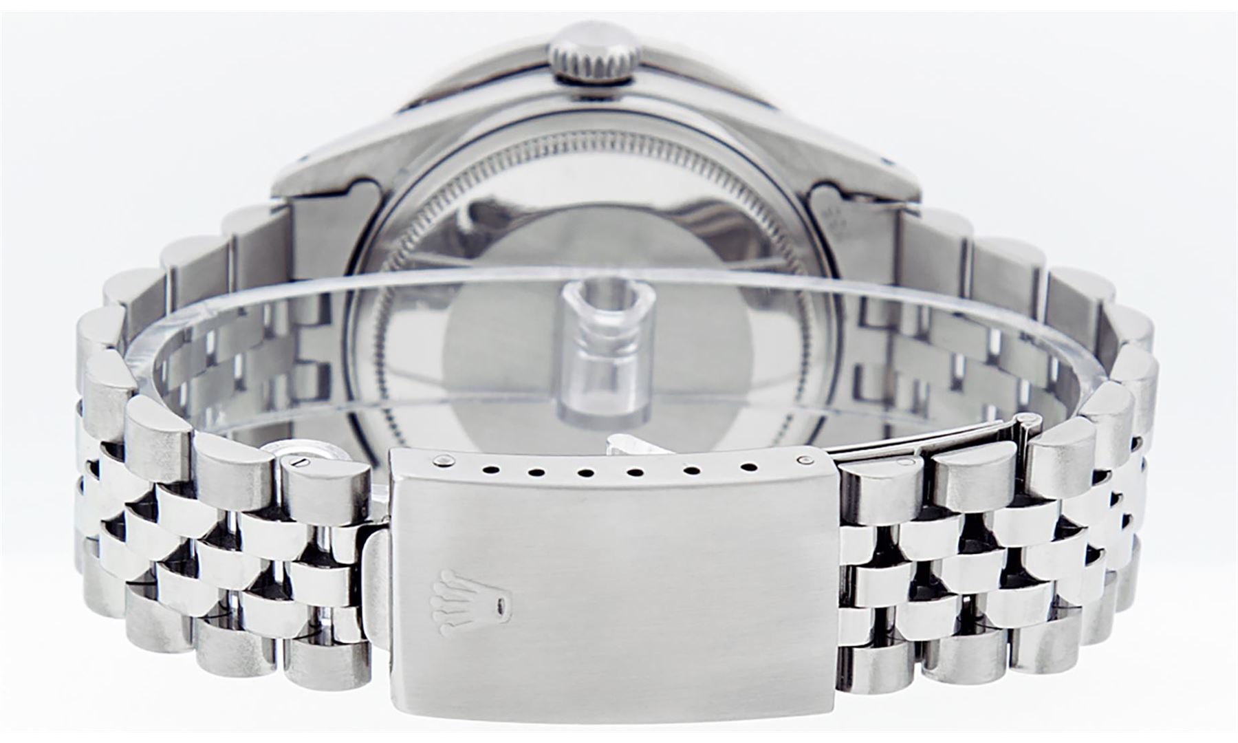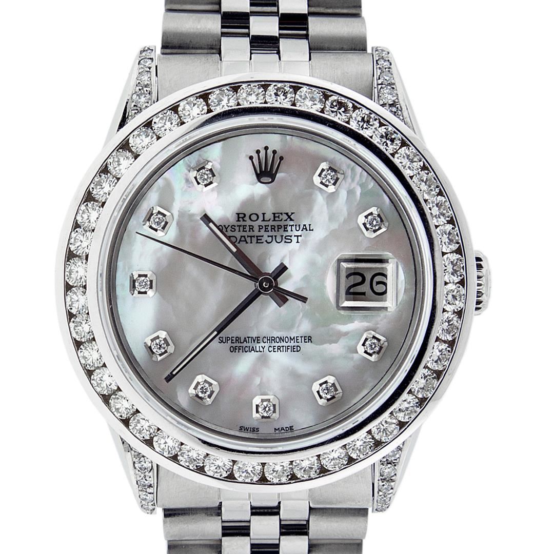 One Mens Stainless Steel Rolex Datejust Polished Bright with Satin Finish, Serviced & Electronically Tested, Stainless Steel Case: 36mm, Diamond Lugs: 24 Diamonds On Lugs, Color: G to H, Clarity: SI-VS. Stainless Steel Crown, New Custom Bezel: 18K White Gold 3.00 Ctw Diamond Bezel, Diamond Count: 40 Diamonds, Total Weight 3.0 Carat, Clarity: SI-VS, Color: G to H. Custom Crystal: New Scratch Resistant Synthetic Sapphire Cyclops Lens. Movement: Automatic Winding Movement. Custom Dial: Mother Of Pearl Diamond Dial, Diamond Count: 10 Diamonds In Dial. G To H In Color, Clarity: SI-VS. Date Window: 3 O'Clock Position Date Display, Quickset, Model: Quickset Datejust, Condition: G-6 Extra Fine. Bracelet: Stainless Steel Jubilee Band. Bright Polish & Satin Finish. 7.0 Inch Length, Adjustable. Standard Clasp, With Rolex Logo. This Watch Has Been Serviced Time Tested And Is In Excellent Condition It Is Free Of All Scratches And Dents. This Watch Also Comes With A Brand New Wooden Watch Winder.