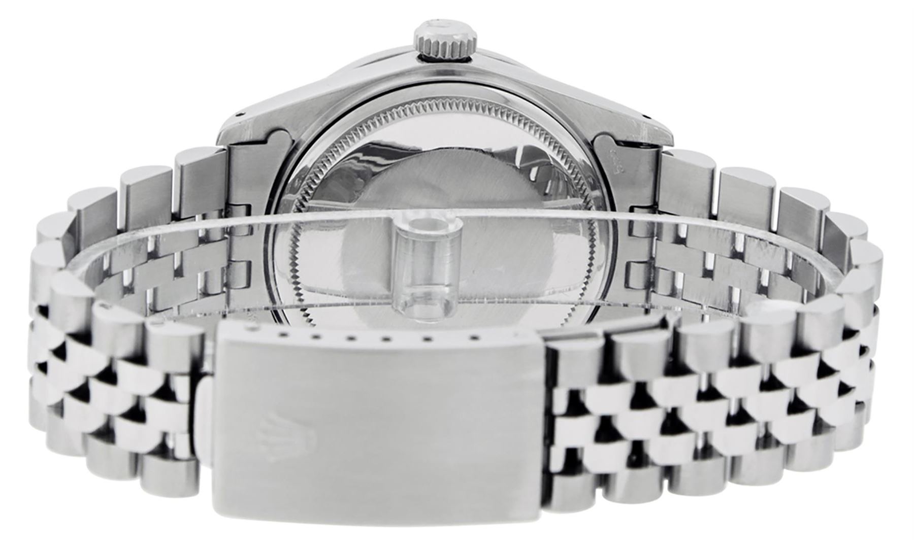 One Mens Pre Owned Stainless Steel Rolex Datejust Polished Bright with Satin Finish, Serviced & Electronically Tested, Stainless Steel Case: 36mm, Diamond Lugs: 24 Diamonds On Lugs, Color: G to H, Clarity: SI-VS. Stainless Steel Crown, Custom Bezel: Stainless Steel Diamond Bezel, Diamond Count: 54 Diamonds On Bezel, Clarity: SI-VS, Color: G to H. Custom Crystal: New Sapphire With Magnified Date. Rolex Movement: Automatic Winding Movement. Custom Dial: Mother Of Pearl Diamond Dial, Diamond Color: G To H In Color, Clarity: SI-VS. Date Window: 3 O'Clock Position Date Display, Quickset, Model: Quickset Datejust, Condition: G-6 Extra Fine. Rolex Bracelet: Stainless Steel Jubilee Band. Bright Polish & Satin Finish. 7.0 Inch Length, Adjustable. Standard Clasp, With Rolex Logo. This Watch Has Been Serviced Time Tested And Is In Excellent Condition It Is Free Of All Scratches And Dents.