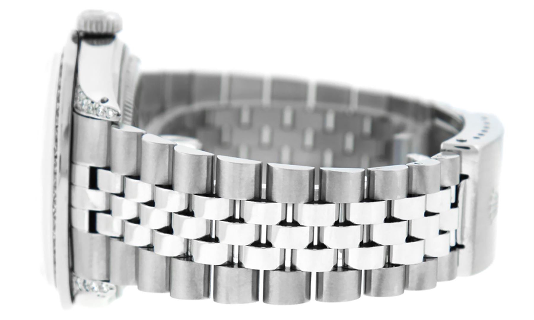 One Mens Pre Owned Rolex Datejust Polished Bright with Satin Finish, Serviced & Electronically Tested, Rolex Stainless Steel Case: 36mm, Custom Diamond Lugs: 28 Diamonds In Lugs, Color: G to H, Clarity: SI-VS. Rolex Stainless Steel Crown, Custom Bezel: New 14K White Gold Princess Cut Diamond Bezel, Diamond Count: 53 Diamonds, Total Weight 2.75 Carat, Clarity: SI-VS, Color: G to H. Custom Crystal: New Sapphire With Magnified Date. Custom Hands: New Luminescent Hands. Rolex Movement: Automatic Winding Movement. Custom Dial: Mother Of Pearl Diamond Dial, Diamond Count: 10 Diamonds In Dial, Diamond Color: G To H In Color, Clarity: SI-VS. Date Window: 3 O'Clock Position Date Display, Quickset, Model: Datejust Condition: G-6 Extra Fine. Rolex Bracelet: Stainless Steel Jubilee Band. Bright Polish & Satin Finish. 7.0 Inch Length, Adjustable. Standard Clasp, With Rolex Logo. This Watch Has Been Serviced And Polished And Its Free Of All Dents And Scratches.
