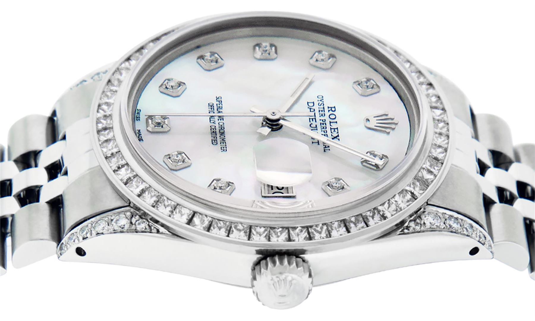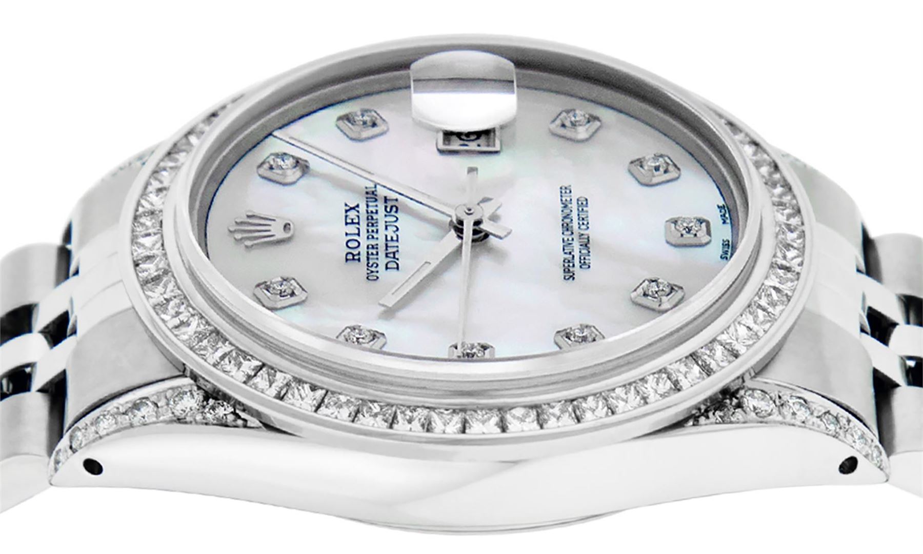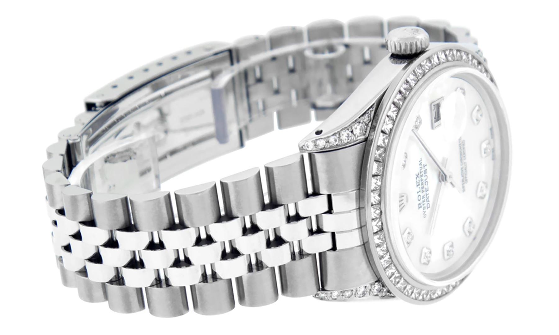 One Mens Pre Owned Rolex Datejust Polished Bright with Satin Finish, Serviced & Electronically Tested, Rolex Stainless Steel Case: 36mm, Custom Diamond Lugs: 28 Diamonds In Lugs, Color: G to H, Clarity: SI-VS. Rolex Stainless Steel Crown, Custom Bezel: New 14K White Gold Princess Cut Diamond Bezel, Diamond Count: 53 Diamonds, Total Weight 2.75 Carat, Clarity: SI-VS, Color: G to H. Custom Crystal: New Sapphire With Magnified Date. Custom Hands: New Luminescent Hands. Rolex Movement: Automatic Winding Movement. Custom Dial: Mother Of Pearl Diamond Dial, Diamond Count: 10 Diamonds In Dial, Diamond Color: G To H In Color, Clarity: SI-VS. Date Window: 3 O'Clock Position Date Display, Quickset, Model: Datejust Condition: G-6 Extra Fine. Rolex Bracelet: Stainless Steel Jubilee Band. Bright Polish & Satin Finish. 7.0 Inch Length, Adjustable. Standard Clasp, With Rolex Logo. This Watch Has Been Serviced And Polished And Its Free Of All Dents And Scratches.