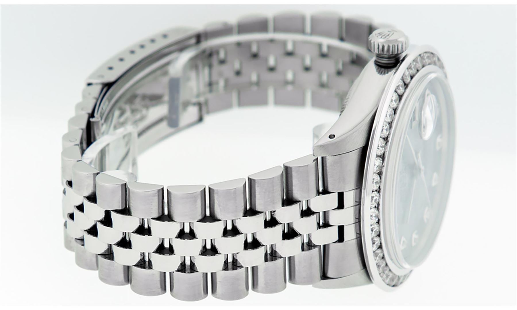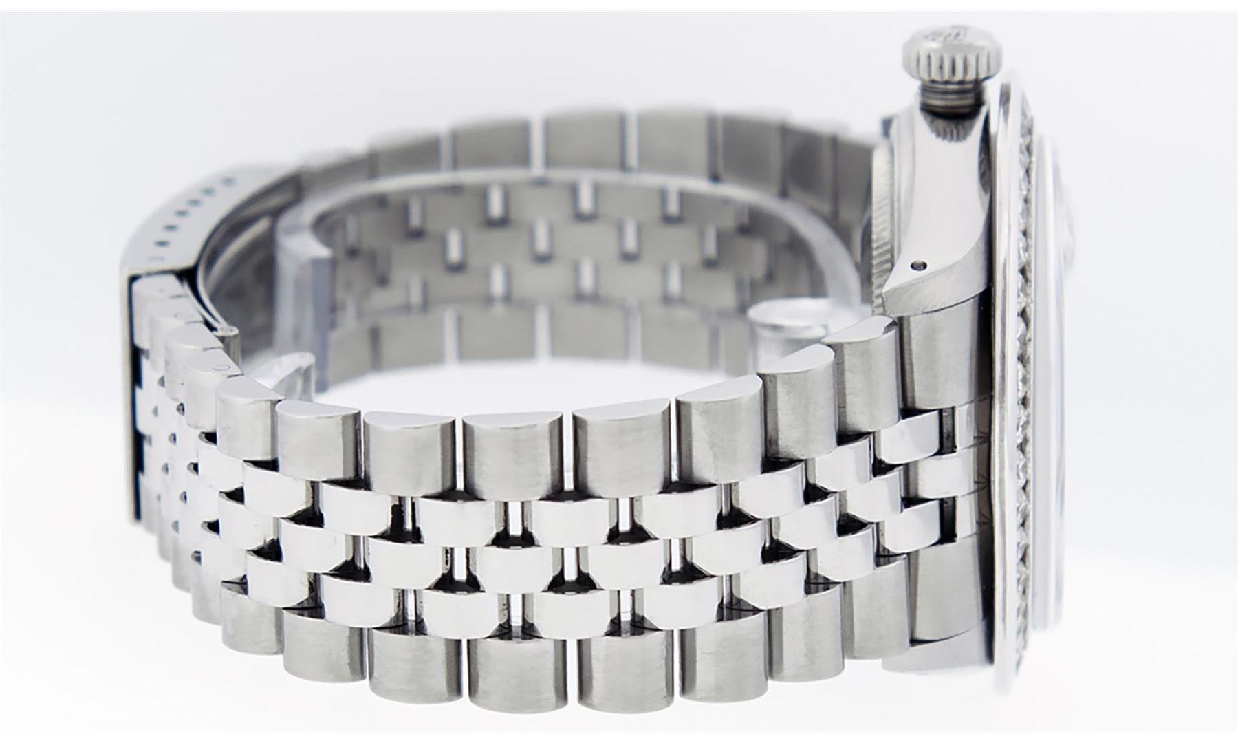 One Mens Pre Owned Stainless Steel Rolex Datejust Polished Bright with Satin Finish, Fully Serviced & Electronically Tested, Stainless Steel Case: 36mm, Stainless Steel Crown, Custom Bezel: New 18K White Gold 3.00 Ctw Channel Set Diamond Bezel, Diamond Count: 40 Diamonds On Bezel, Total Weight 3.0 Carat, Clarity: SI-VS, Color: G to H. Custom Crystal: New Sapphire With Date Window. Custom Hands: New Luminecent Hands. Rolex Movement: Automatic Winding Movement. Custom Dial: Meteorite Diamond Dial, 10 Diamonds in Dial, G To H In Color, Clarity: SI-VS. Date Window: 3 O'Clock Position Date Display, Quickset, Model: Datejust 36mm, Condition: G-6 Extra Fine. Rolex Bracelet: Rolex Stainless Steel Jubilee Band. Bright Polish & Satin Finish. 7.0 Inch Length, Adjustable. Standard Clasp, With Rolex Logo. This Watch Has Been Serviced And Polished It Is Free Of All Scratches And Dents.