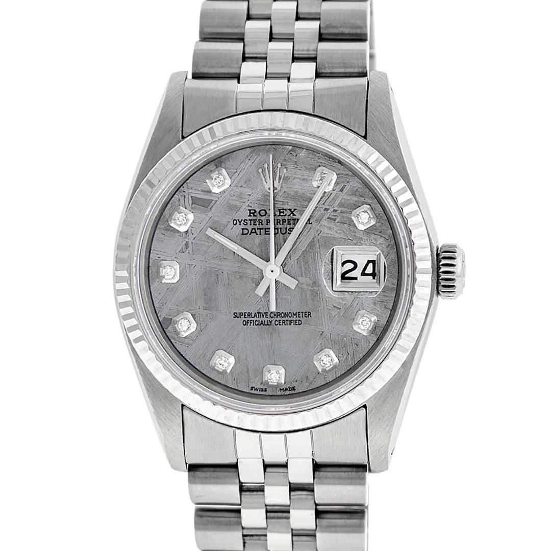 One Mens Pre Owned Stainless Steel Rolex Datejust Polished Bright with Satin Finish, This Watch Has Been Serviced & Electronically Tested, Rolex Stainless Steel Case: 36mm, Rolex Stainless Steel Crown, Rolex Bezel: White Gold Fluted Bezel. Custom Crystal: New Acrylic With Date Window. Custom Hands: New Luminescent Hands. Rolex Movement: Automatic Winding Movement. Custom Dial: Meteorite Diamond Dial With Added Diamond Hour Markers, Diamond Count: 10 Diamonds in Dial, G To H In Color, SI-VS Clarity. Date Window: 3 O'Clock Position Date Display, Quickset, Model: Datejust, Condition: G-6 Extra Fine. Rolex Bracelet:Stainless Steel Jubilee Band. Bright Polish & Satin Finish. 7.0 Inch Length, Adjustable. Standard Clasp, With Rolex Logo. This Pre Owned Watch Has Been Serviced Time Tested And Is In Excellent Condition It Is Free Of All Scratches And Dents.
