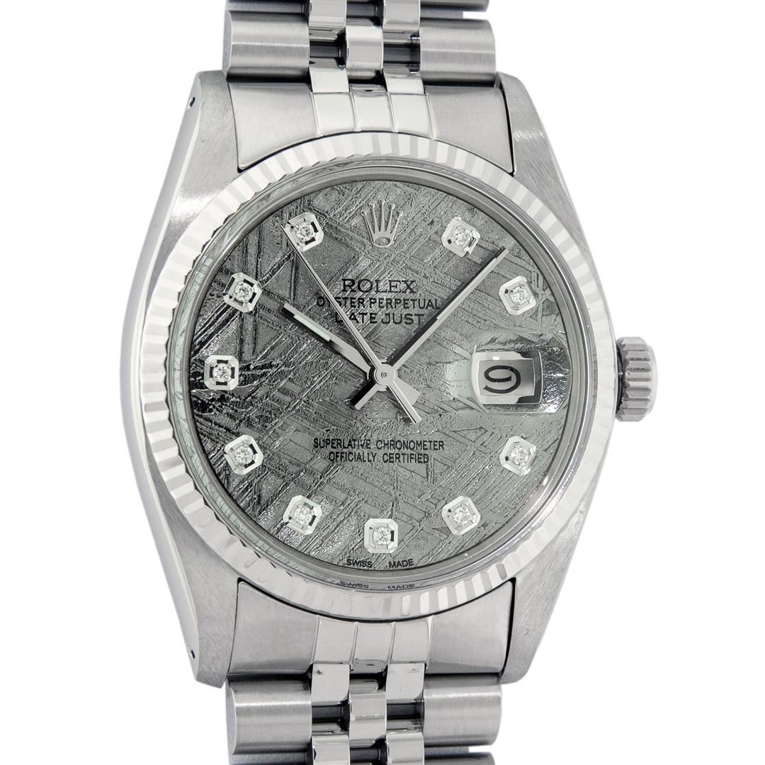 One Mens Stainless Steel Rolex Datejust Polished Bright with Satin Finish, This Watch Has Been Serviced & Electronically Tested, Stainless Steel Case: 36mm, Stainless Steel Crown, Original Bezel: 14K White Gold Fluted Bezel. Custom Crystal: New Acrylic Cyclops Lens. Custom Hands: New Luminescent Hands. Movement: Automatic Winding Movement. Custom Dial: Meteorite Diamond Dial With Diamond Hour Markers, Diamond Count: 10 Diamonds in Dial, G To H In Color, SI-VS Clarity. Date Window: 3 O'Clock Position Date Display, Quickset, Model: Datejust, Condition: G-6 Extra Fine. Bracelet:Stainless Steel Jubilee. Bright Polish & Satin Finish. 7.0 Inch Length, Adjustable. Standard Clasp, With Rolex Logo. This Watch Has Been Serviced Time Tested And Is In Excellent Condition It Is Free Of All Scratches And Dents.