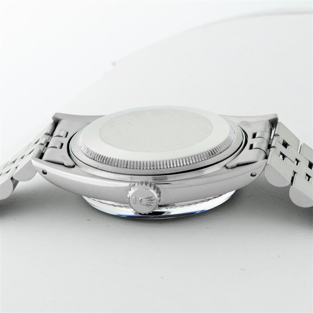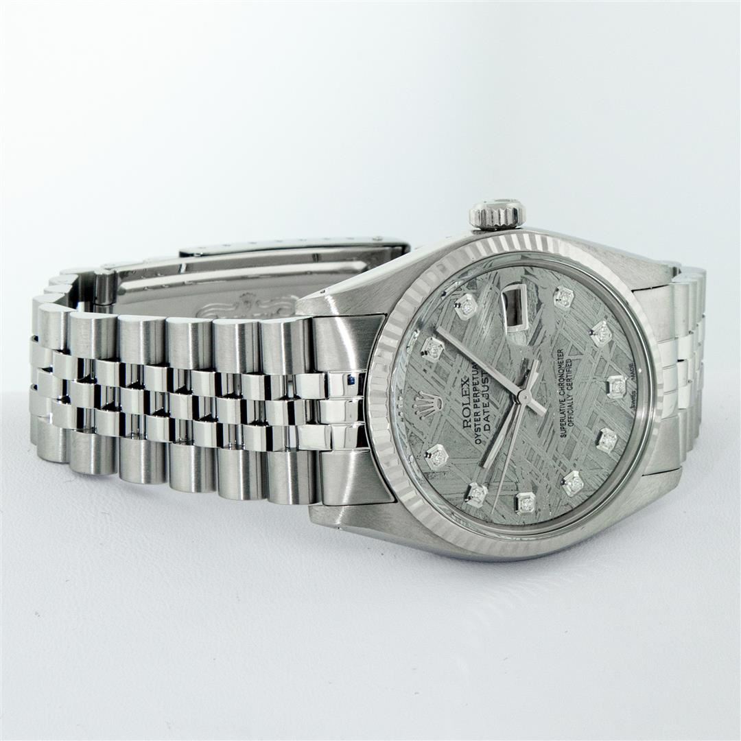 One Mens Stainless Steel Rolex Datejust Polished Bright with Satin Finish, This Watch Has Been Serviced & Electronically Tested, Stainless Steel Case: 36mm, Stainless Steel Crown, Original Bezel: 14K White Gold Fluted Bezel. Custom Crystal: New Acrylic Cyclops Lens. Custom Hands: New Luminescent Hands. Movement: Automatic Winding Movement. Custom Dial: Meteorite Diamond Dial With Diamond Hour Markers, Diamond Count: 10 Diamonds in Dial, G To H In Color, SI-VS Clarity. Date Window: 3 O'Clock Position Date Display, Quickset, Model: Datejust, Condition: G-6 Extra Fine. Bracelet:Stainless Steel Jubilee. Bright Polish & Satin Finish. 7.0 Inch Length, Adjustable. Standard Clasp, With Rolex Logo. This Watch Has Been Serviced Time Tested And Is In Excellent Condition It Is Free Of All Scratches And Dents.