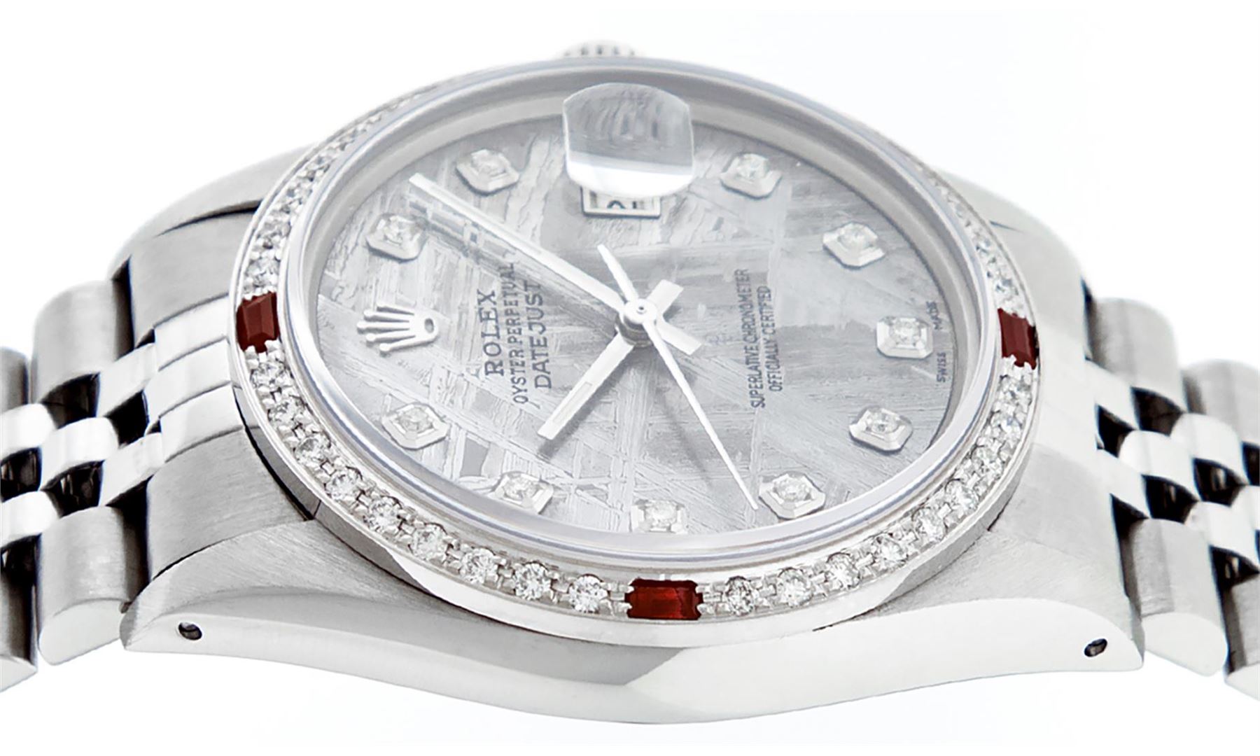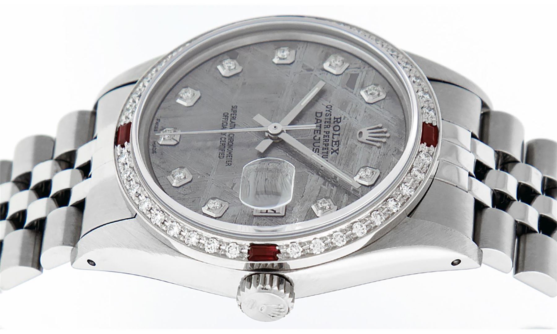 One Mens Pre Owned Stainless Steel Rolex Datejust Polished, Serviced & Electronically Tested, Stainless Steel Case: 36mm, Stainless Steel Crown, Custom Bezel: New 18K White Gold Ruby Beadset Diamond Bezel, Diamond + Gem Count: 36 Diamonds + 4 Rubies, Clarity: SI-VS, Color: G to H. Custom Crystal: New Sapphire With Date Window. Custom Hands: New Luminescent Hands. Rolex Movement: Automatic Winding Movement. Custom Dial: Meteorite With Diamond Hour Markers, 10 Diamonds In Dial, G To H In Color, Clarity: SI-VS. Date Window: 3 O'clock Position Date Display, Quickset, Model: Datejust. Condition: G-6 Extra Fine. Rolex Bracelet: Stainless Steel Jubilee Band. Bright Polish & Satin Finish. 7.0 Inch Length, Adjustable. Standard Clasp, With Rolex Logo. This Watch Has Been Serviced Time Tested And Is In Excellent Condition It Is Free Of All Scratches And Dents.