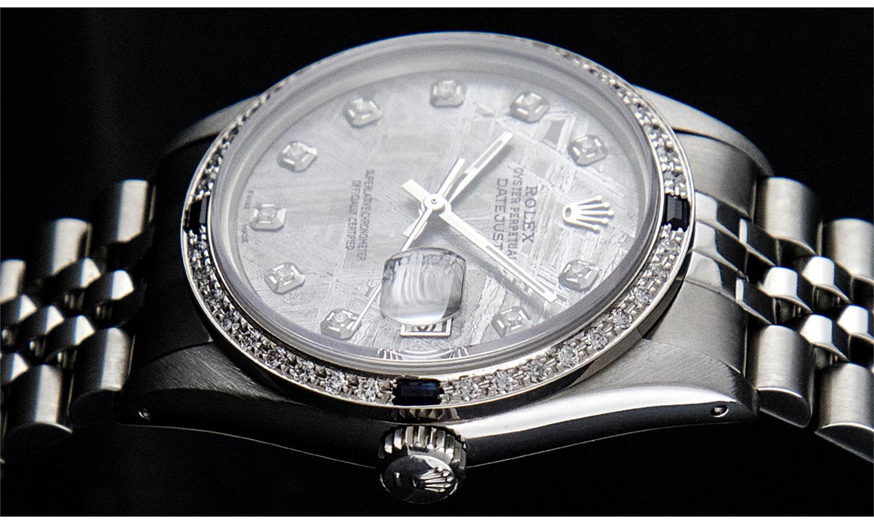One Mens Stainless Steel Rolex Datejust Polished Bright with Satin Finish, Fully Serviced & Electronically Tested, Stainless Steel Case:36mm, Stainless Steel Crown, Custom Bezel: 18K White Gold Sapphire Beadset Diamond Bezel, Diamond Count: 36 Diamonds + 4 Sapphire, Total Weight 1.00 Carat, Clarity: SI-VS, Color: G to H. Custom Crystal: Synthetic Sapphire Cyclops Lens. Movement: Automatic Winding Movement Caliber 3135. Custom Dial: Meteorite Diamond Dial, 10 Diamonds in Dial, G To H In Color, Clarity: SI-VS. Date Window: 3 O'Clock Position Date Display, Quickset, Model: 16234 Sapphire Datejust, Condition: G-6 Extra Fine. Bracelet:Stainless Steel Jubilee. Bright Polish & Satin Finish. 7.0 Inch Length, Adjustable. Standard Clasp, With Rolex Logo.