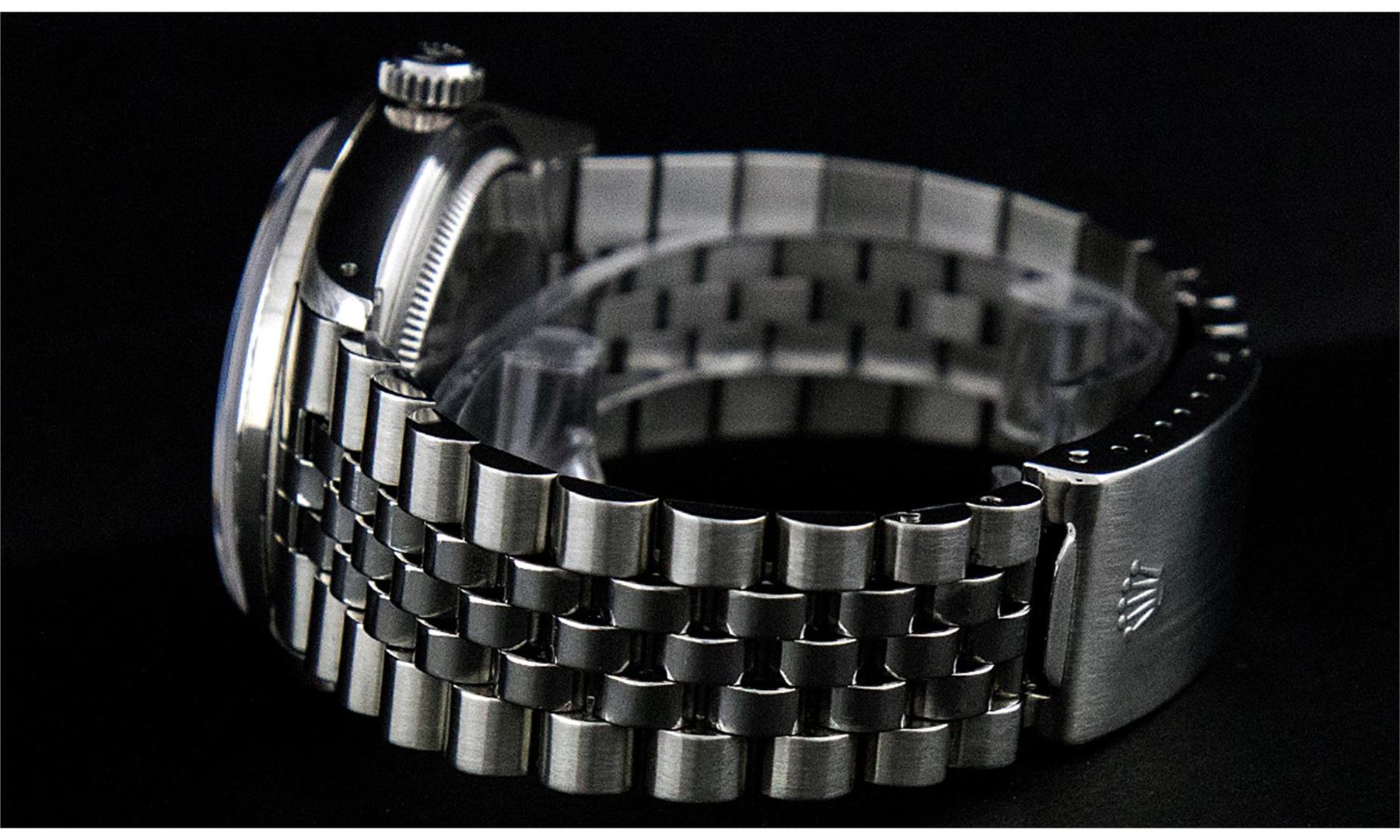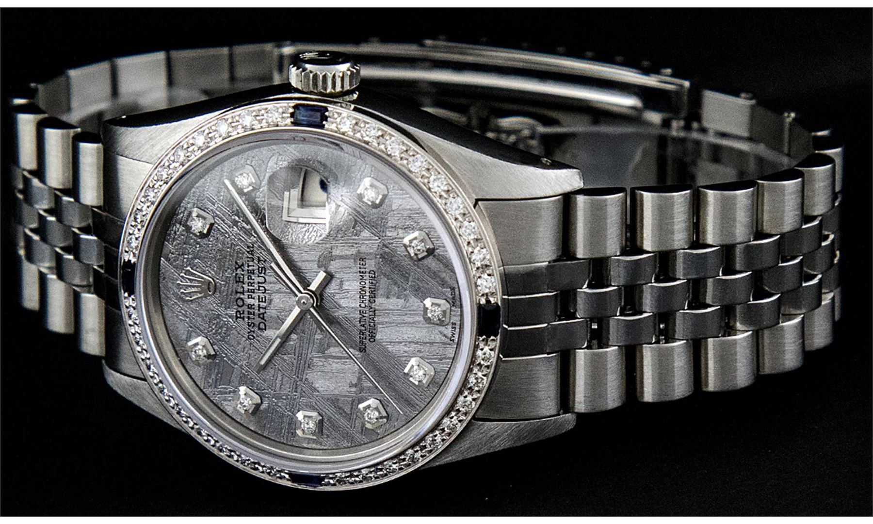 One Mens Stainless Steel Rolex Datejust Polished Bright with Satin Finish, Fully Serviced & Electronically Tested, Stainless Steel Case:36mm, Stainless Steel Crown, Custom Bezel: 18K White Gold Sapphire Beadset Diamond Bezel, Diamond Count: 36 Diamonds + 4 Sapphire, Total Weight 1.00 Carat, Clarity: SI-VS, Color: G to H. Custom Crystal: Synthetic Sapphire Cyclops Lens. Movement: Automatic Winding Movement Caliber 3135. Custom Dial: Meteorite Diamond Dial, 10 Diamonds in Dial, G To H In Color, Clarity: SI-VS. Date Window: 3 O'Clock Position Date Display, Quickset, Model: 16234 Sapphire Datejust, Condition: G-6 Extra Fine. Bracelet:Stainless Steel Jubilee. Bright Polish & Satin Finish. 7.0 Inch Length, Adjustable. Standard Clasp, With Rolex Logo.