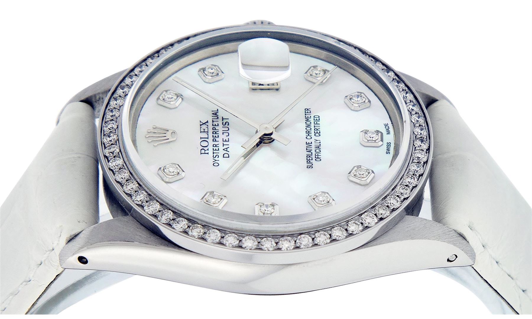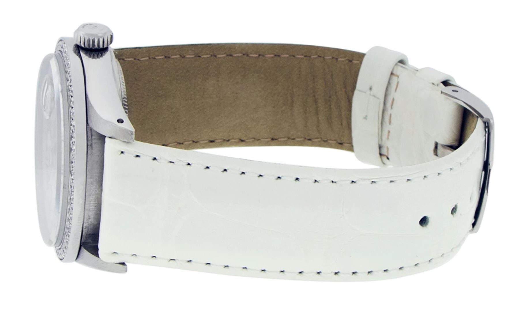 One Mens Pre Owned Rolex Stainless Steel Datejust Polished Bright with Satin Finish, This Watch Has Been Serviced & Electronically Tested, Rolex Stainless Steel Case: 36mm, Rolex Stainless Steel Crown, Custom Bezel: New Stainless Steel Bead set Diamond Be