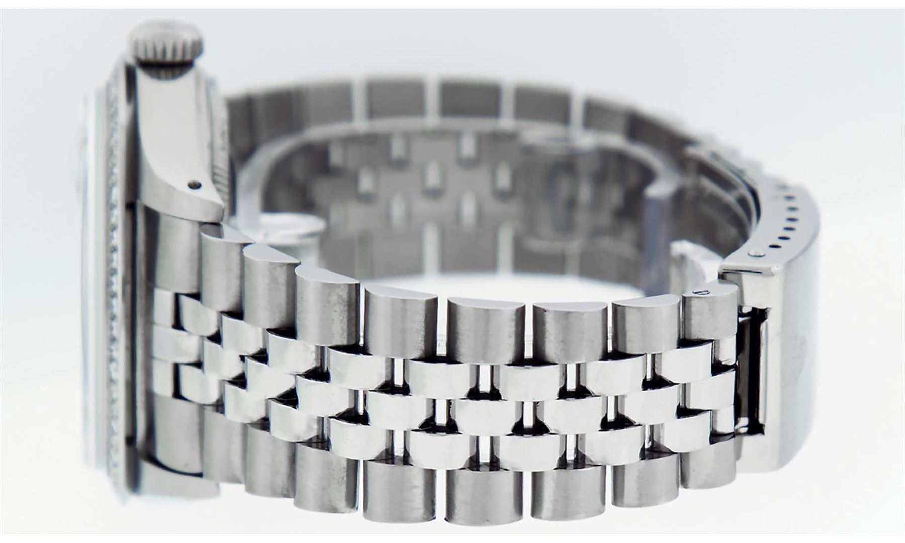One Mens Pre Owned Rolex Stainless Steel Datejust Polished Bright with Satin Finish, This Watch Has Been Serviced & Electronically Tested, Rolex Stainless Steel Case: 36mm, Rolex Stainless Steel Crown, Custom Bezel: New Stainless Steel Beadset Diamond Bezel, Diamond Count: 54 Diamonds In Bezel, Clarity: SI-VS, Color: G to H. Custom Crystal: New Sapphire With Magnified Date. Custom Hands: New Luminescent Hands. Rolex Movement: Automatic Winding Movement. Custom Dial: Mother Of Pearl Diamond Dial, Diamond Count: 10 Diamonds On Dial, Color: G to H, Clarity: VS2-SI1. Date Window: 3 O'Clock Position Date Display, Quickset, Model: Datejust. Condition: G-6 Extra Fine. Rolex Bracelet: Stainless Steel Jubilee Band. Bright Polish & Satin Finish. 7.0 Inch Length, Adjustable. Standard Clasp, With Rolex Logo. This Watch Has Been Serviced Time Tested And Is In Excellent Condition It Is Free Of All Scratches And Dents.