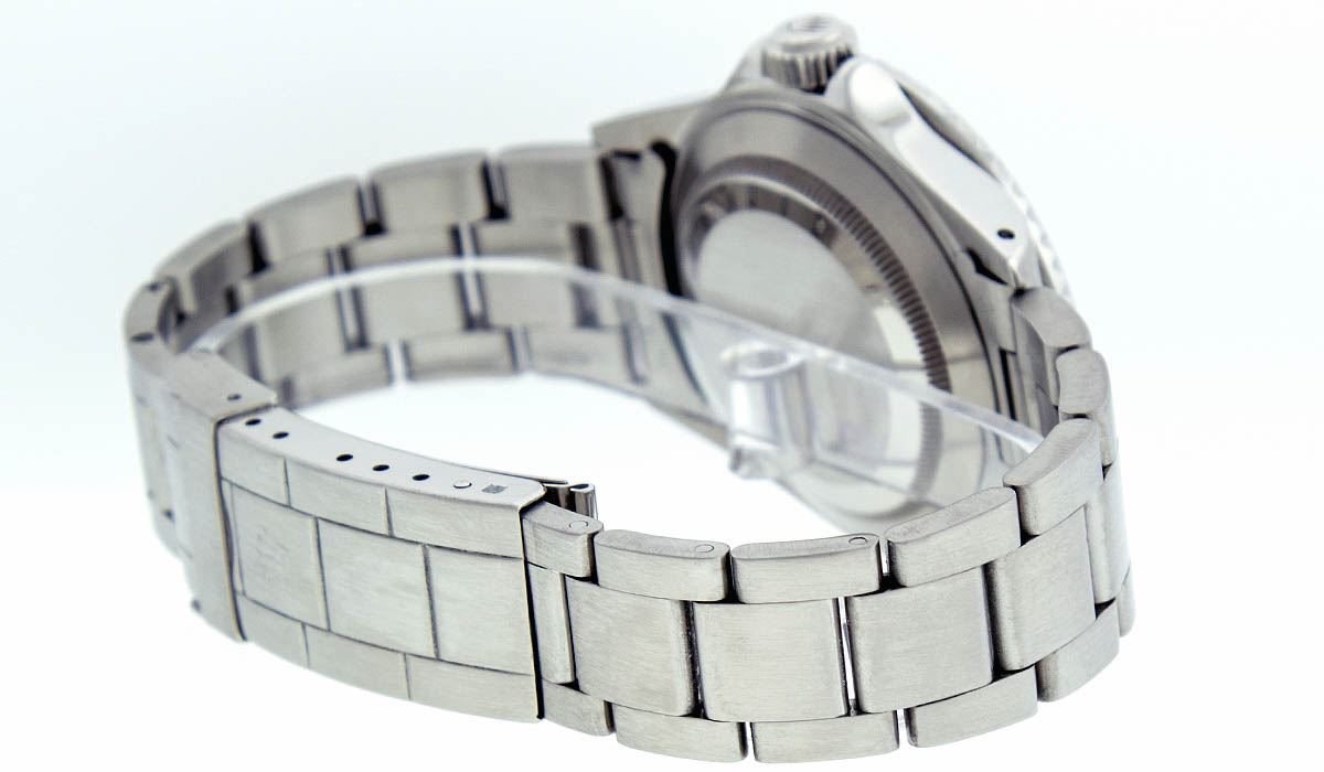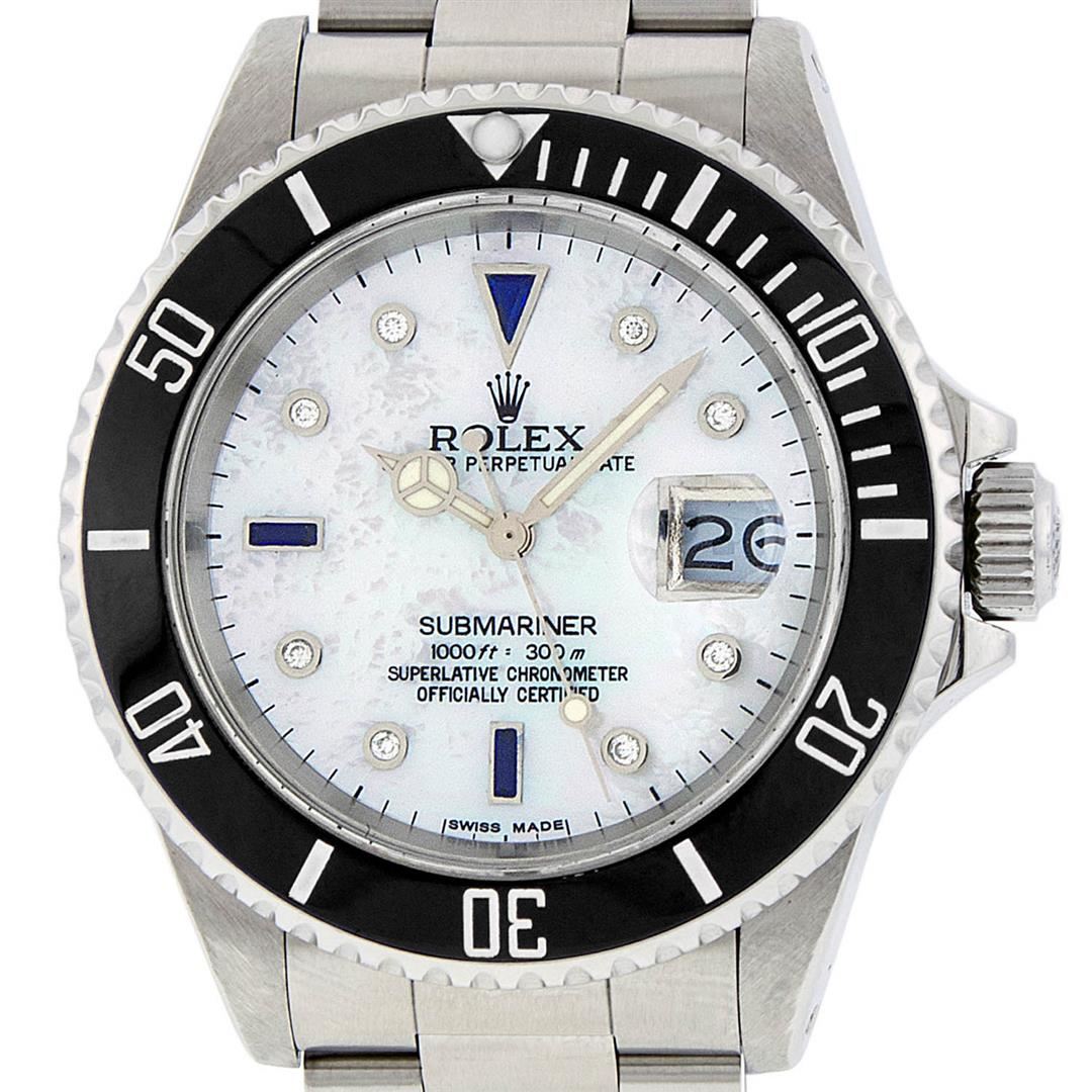 One Mens Rolex Submariner With Date Polished, Serviced & Electronically Tested, Stainless Steel Case:41mm, Stainless Steel Crown, Bezel: Stainless Steel Rotatable Bezel With Black Insert. Custom Crystal: Synthetic Sapphire Cyclops Lens. Movement: Automatic Winding Movement Caliber 3135. Custom Dial: Mother Of Pearl Diamond 8 + 2 Sapphires, Diamond Count: 8 Diamonds + 2 Baguette Sapphires In Dial, Color: G To H, Clarity: SI-VS. Date Window: 3 O'Clock Position Date Display, Model: Submariner 16610, Quickset, Condition: G-6 Extra Fine. Bracelet:Stainless Steel Oyster Band. Bright Polish & Satin Finish. 7.0 Inch Length, Adjustable. Standard Clasp, With Rolex Logo.