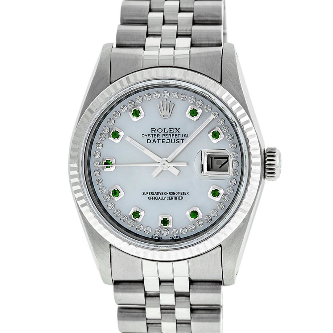 One Mens Rolex Datejust Polished Bright with Satin Finish, Serviced & Electronically Tested, Stainless Steel Case: 36mm, Stainless Steel Crown, Original Bezel: 14K White Gold Fluted Bezel. Custom Crystal: New Acrylic Cyclops Lens. Custom Hands: New Luminescent Hands. Movement: Automatic Winding Movement. Custom Dial: Mother Of Pearl Emerald String Diamond Dial, Stone Count: 10 Synthetic Emeralds + 48 Diamonds in Dial, G To H In Color, SI-VS Clarity. Date Window: 3 O'Clock Position Date Display, Quickset, Model: Datejust, Condition: G-6 Extra Fine. Bracelet: Stainless Steel Jubilee. Bright Polish & Satin Finish. 7.0 Inch Length, Adjustable. Standard Clasp, With Rolex Logo. Watch Has Been Serviced And Polished It Is Free Of All Scratches And Dents.