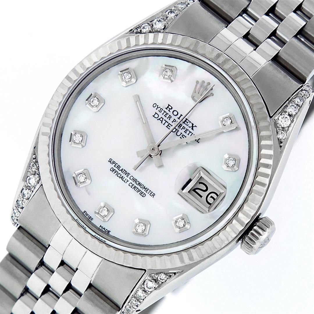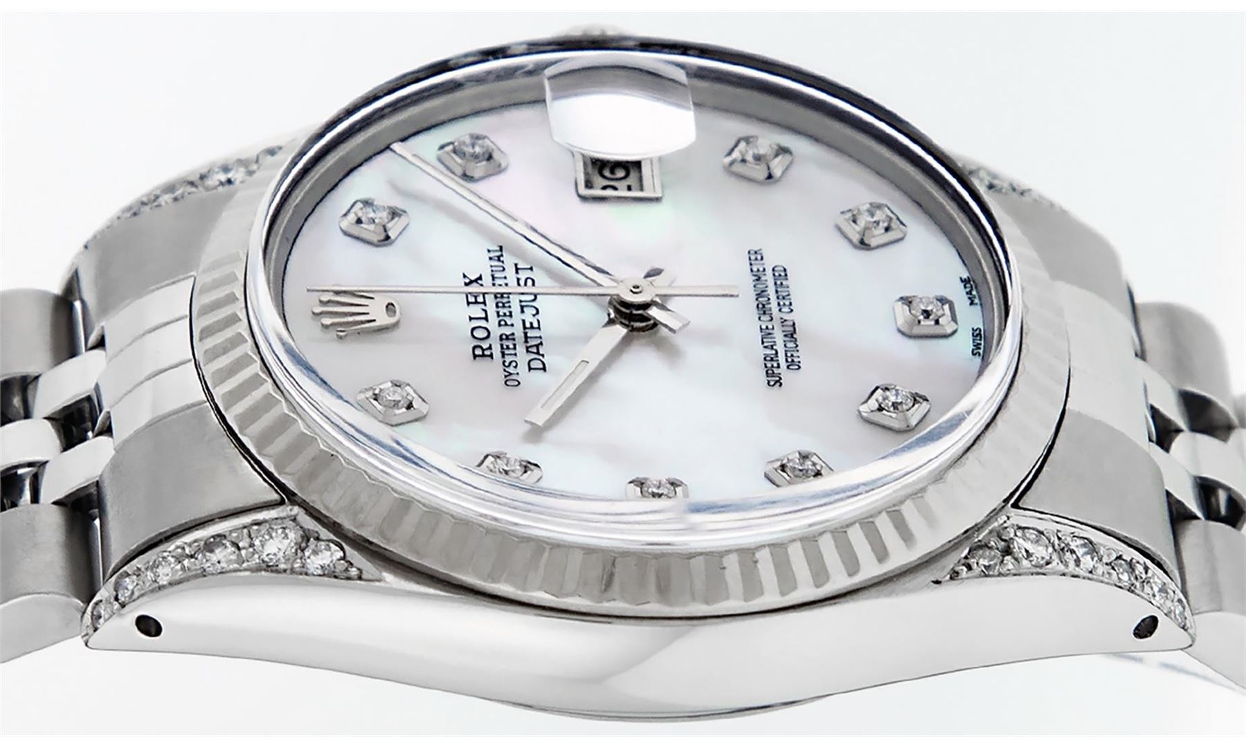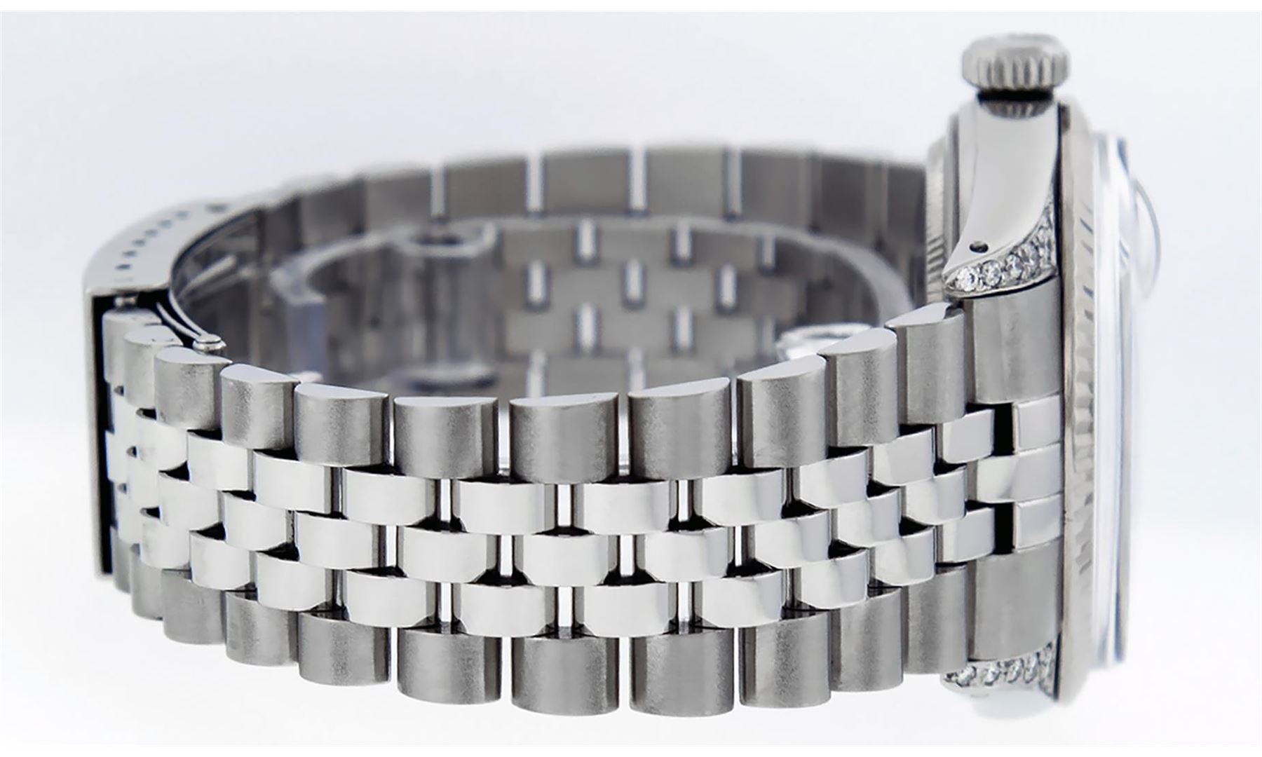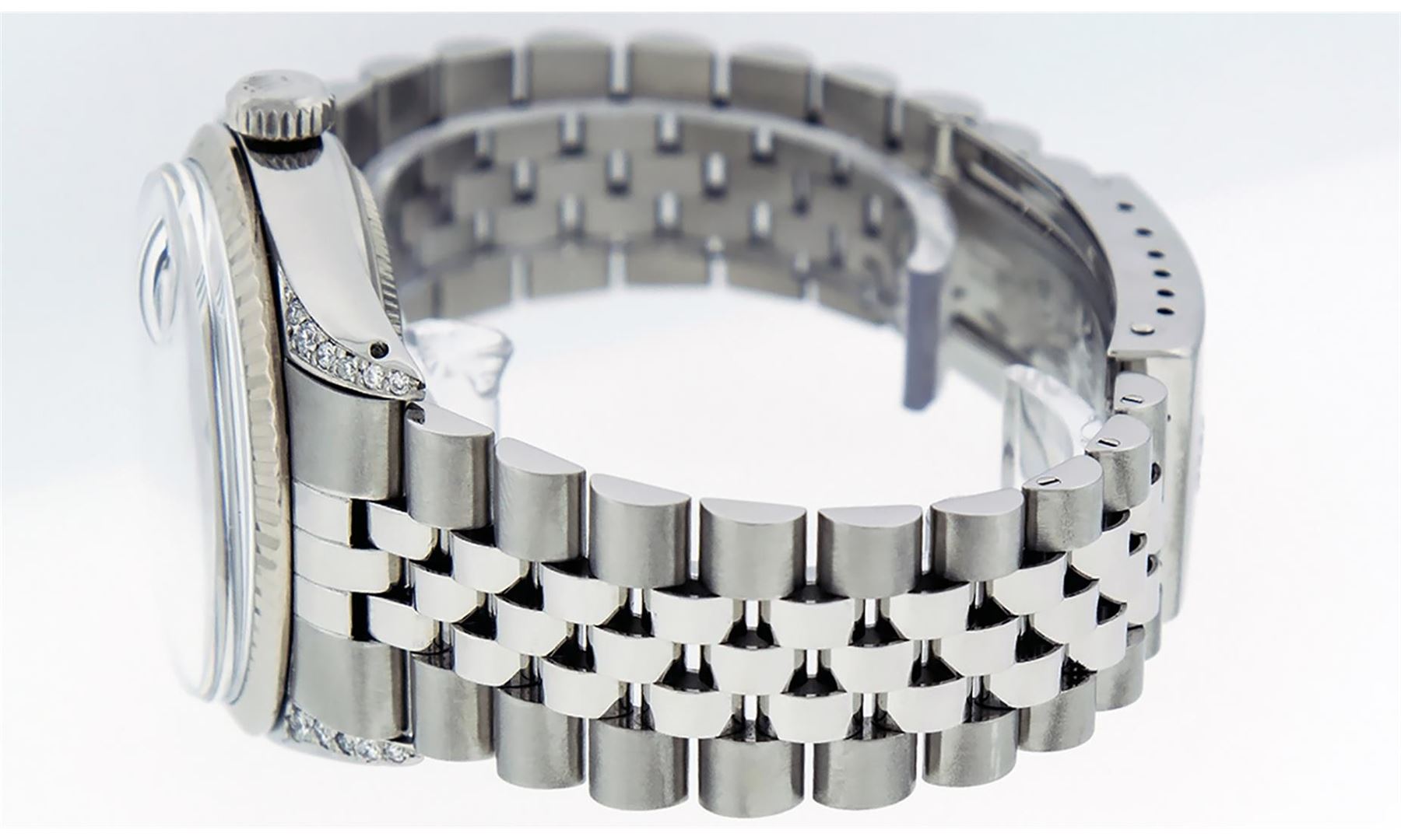 One Mens Pre Owned Stainless Steel Rolex Datejust Polished Bright with Satin Finish, Serviced & Electronically Tested, Rolex Stainless Steel Case: 36mm, Custom Diamond Lugs: 24 Added Diamonds On Lugs, Color: G to H, Clarity: SI-VS. Rolex Stainless Steel C