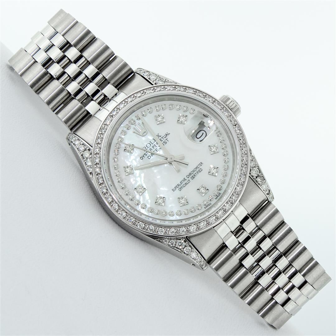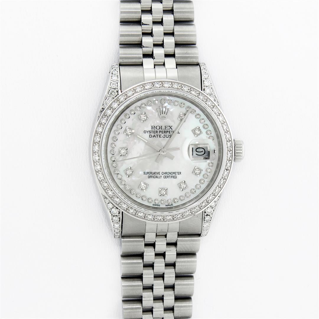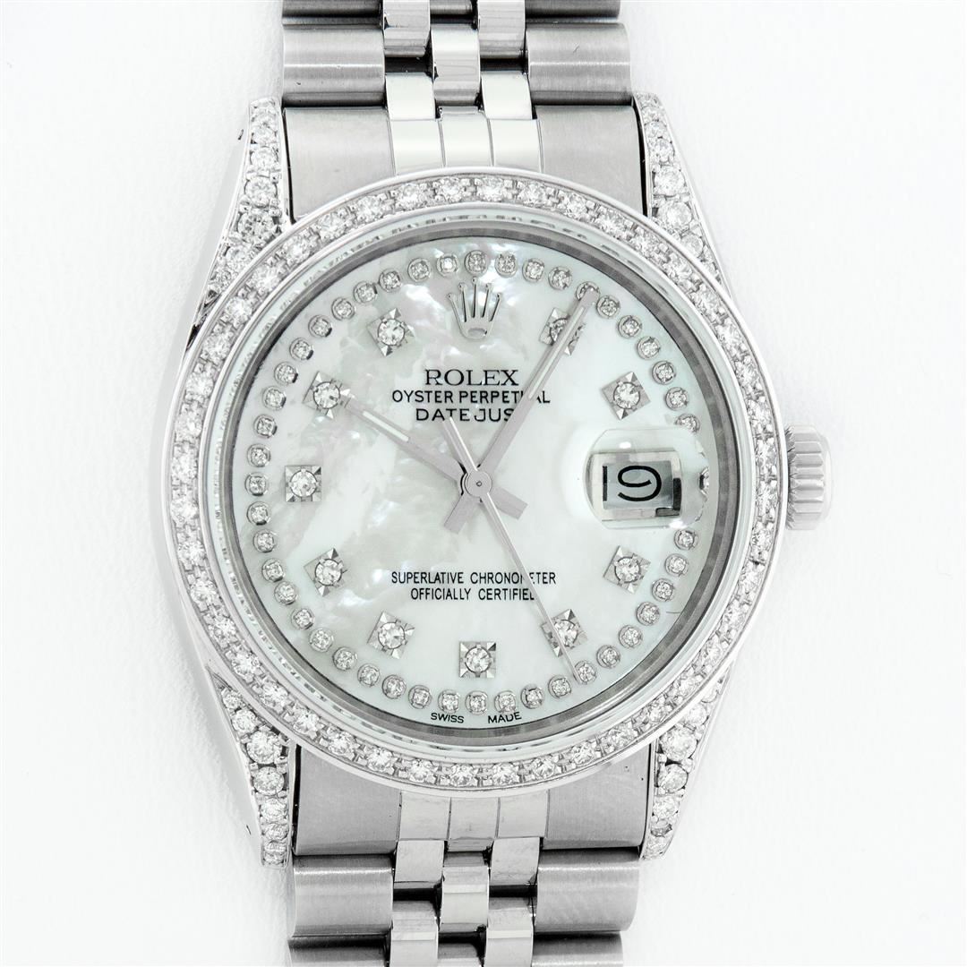One Mens Rolex Datejust Polished Bright with Satin Finish, Serviced & Electronically Tested, Stainless Steel Case: 36mm, Custom Diamond Lugs: 28 Diamonds In Lugs, Color: G to H, Clarity: SI-VS. Stainless Steel Crown, Custom Bezel: 18K White Gold Diamond Beadset Bezel, Diamond Count: 44 Diamonds, Total Weight 1.00 Carat, Clarity: SI-VS, Color: G to H. Custom Crystal: New Scratch Resistant Synthetic Sapphire Cyclops Lens. Custom Hands: New Luminescent Hands. Movement: Automatic Winding Movement. Custom Dial: Mother Of Pearl String Single Cut Diamond Dial, Stone Count: 58 Diamonds In Dial, Diamond Color: G To H In Color, Clarity: VS. Date Window: 3 O'Clock Position Date Display, Quickset, Model: Datejust Condition: G-6 Extra Fine. Bracelet: Stainless Steel Jubilee Band. Bright Polish & Satin Finish. 7.0 Inch Length, Adjustable. Standard Clasp, With Rolex Logo. This Watch Has Been Serviced And Polished And Its Free Of All Dents And Scratches.